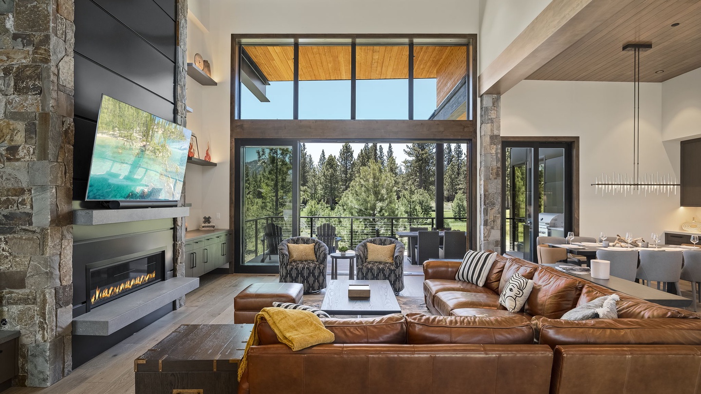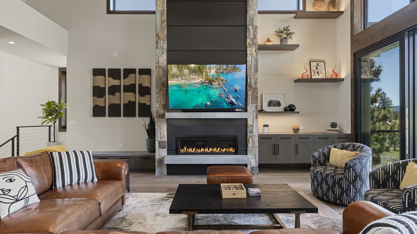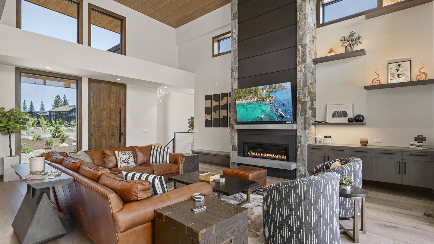 The stunning, high-ceilinged living room features a modern fireplace with a floor to ceiling chimney made from river rock and slate gray panels. The carefully curated interior decor draws the eye upward, enhancing the grandeur of the room. A soft, high-end leather sectional comfortably seats six, accompanied by geometric monochrome armchairs. Perfect for entertaining, this space is ideal for game nights, movie marathons, or conversations that go well into the night!