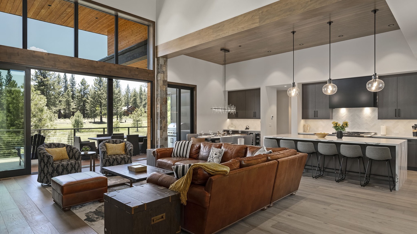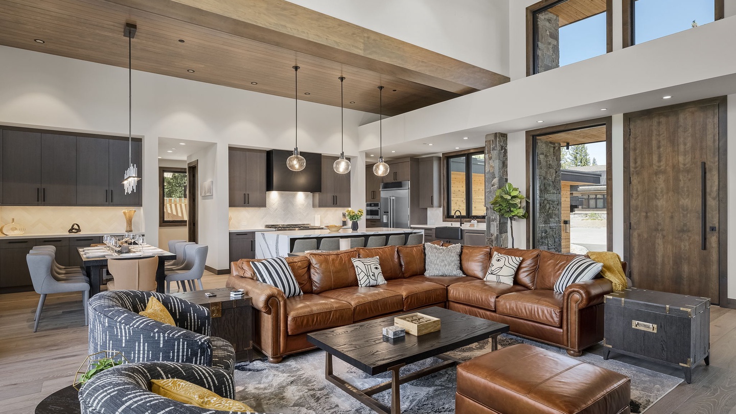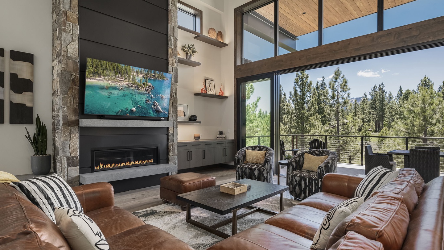 The stunning, high-ceilinged living room features a modern fireplace with a floor to ceiling chimney made from river rock and slate gray panels. The carefully curated interior decor draws the eye upward, enhancing the grandeur of the room. A soft, high-end leather sectional comfortably seats six, accompanied by geometric monochrome armchairs. Perfect for entertaining, this space is ideal for game nights, movie marathons, or conversations that go well into the night!