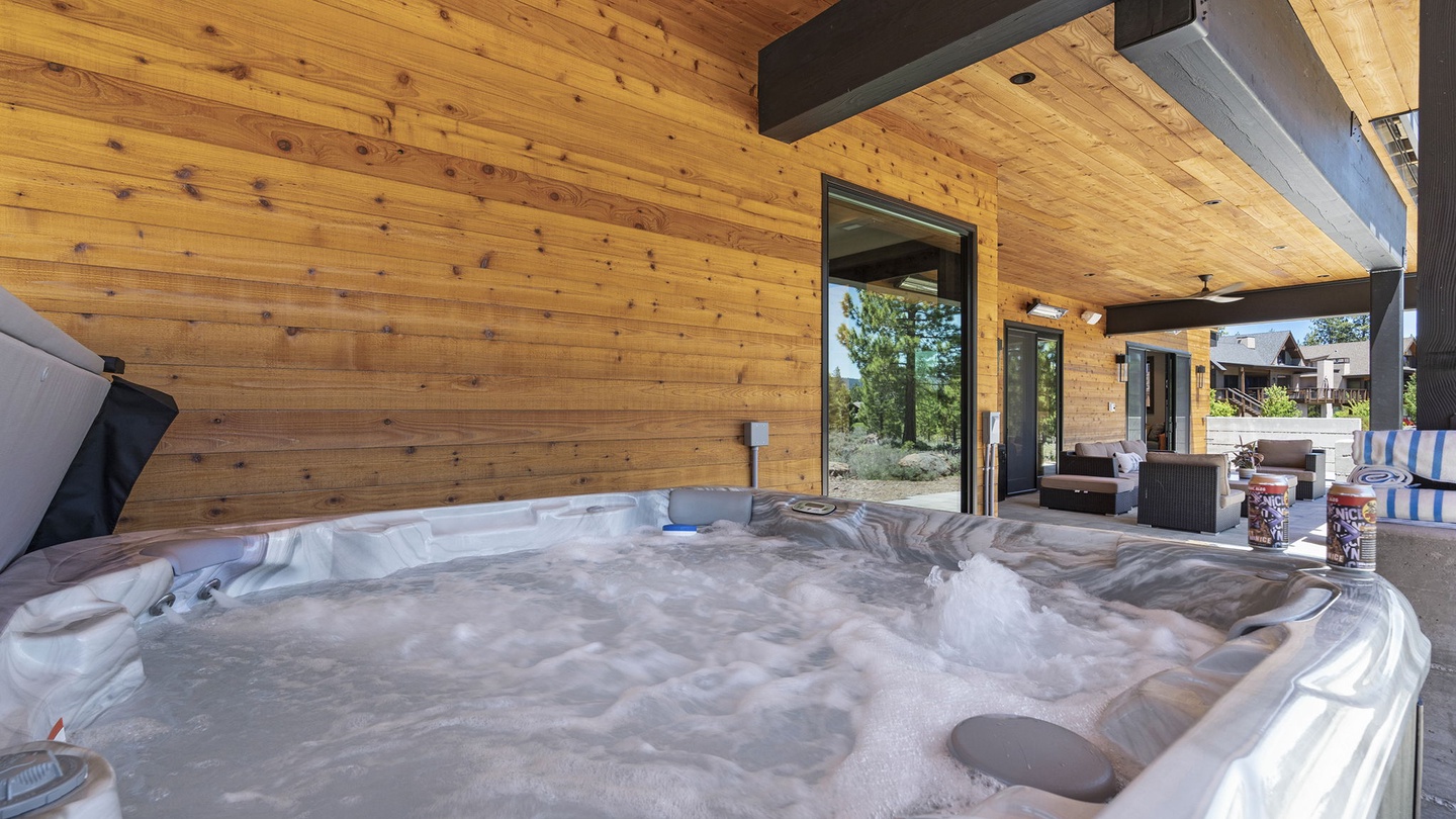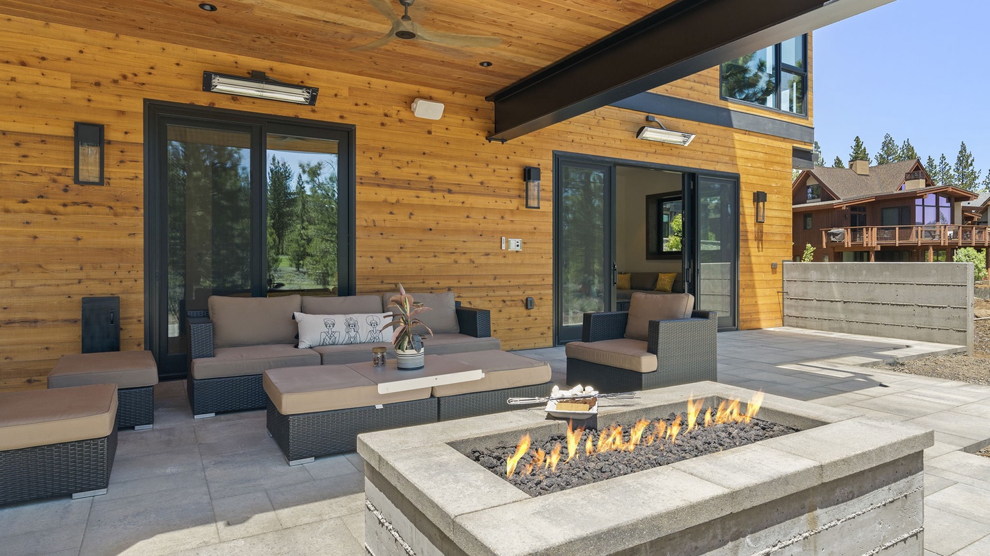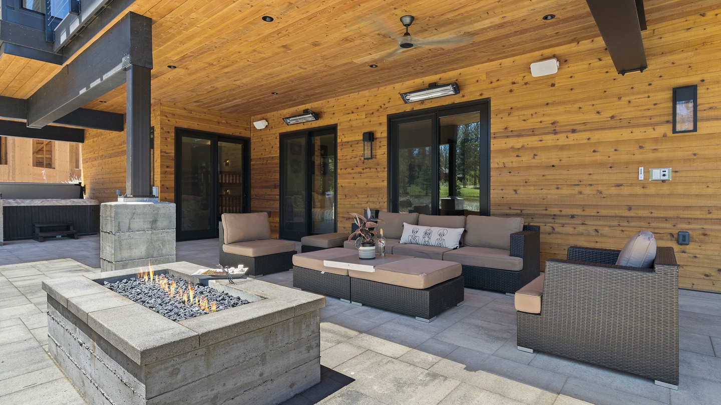 The lower floor patio has a large outdoor lounge area with comfortable seating and a fire pit and a large hot tub to enjoy the fresh, evening breeze. Both outdoor spaces have fans and heaters so guests can enjoy fresh winter afternoons and cool summer breezes in comfort!