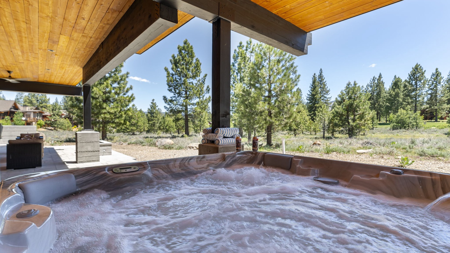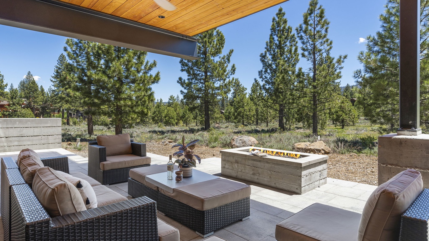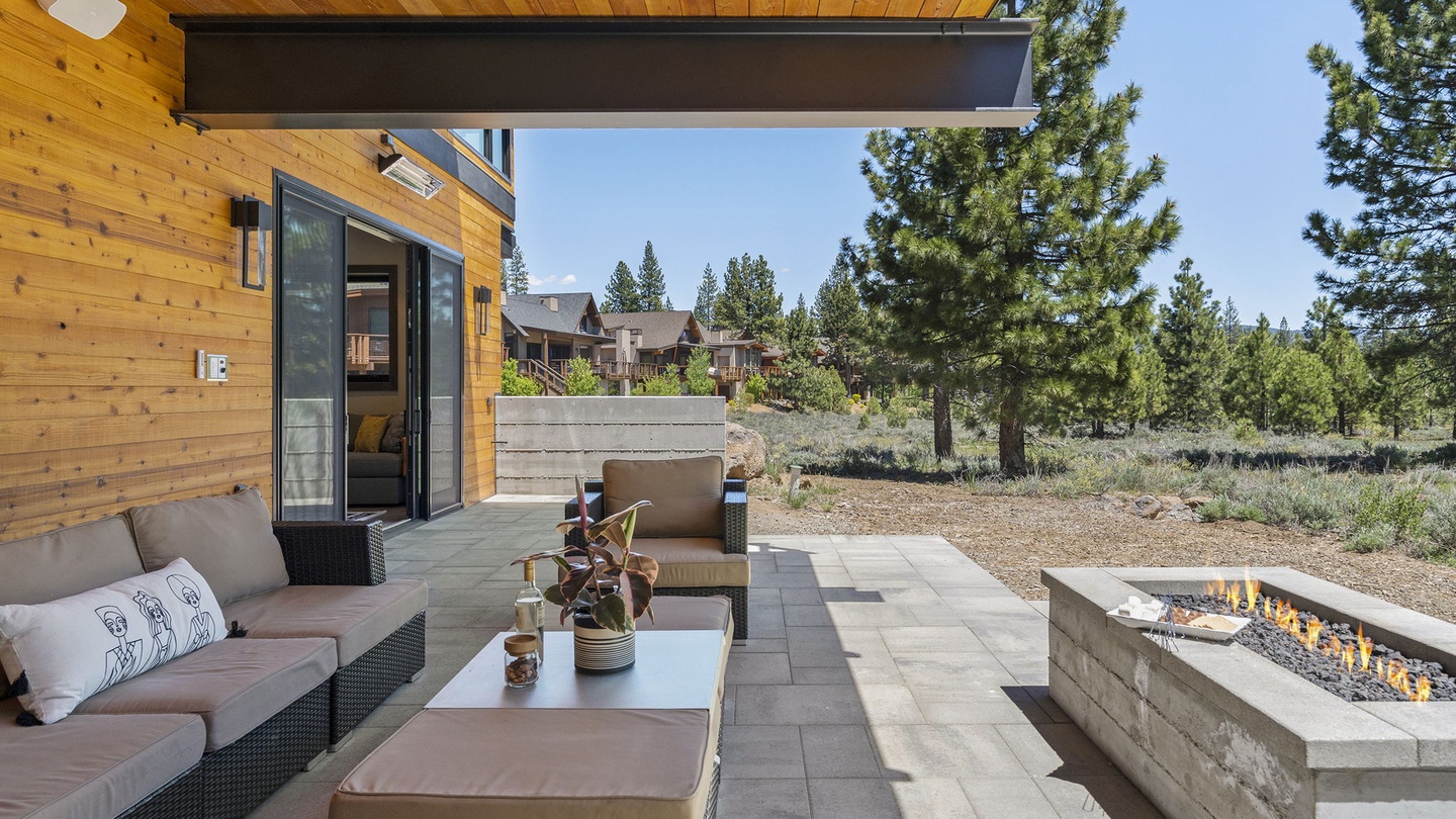 The lower floor patio has a large outdoor lounge area with comfortable seating and a fire pit and a large hot tub to enjoy the fresh, evening breeze. Both outdoor spaces have fans and heaters so guests can enjoy fresh winter afternoons and cool summer breezes in comfort!