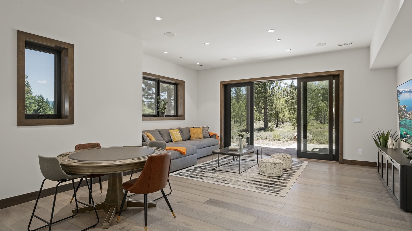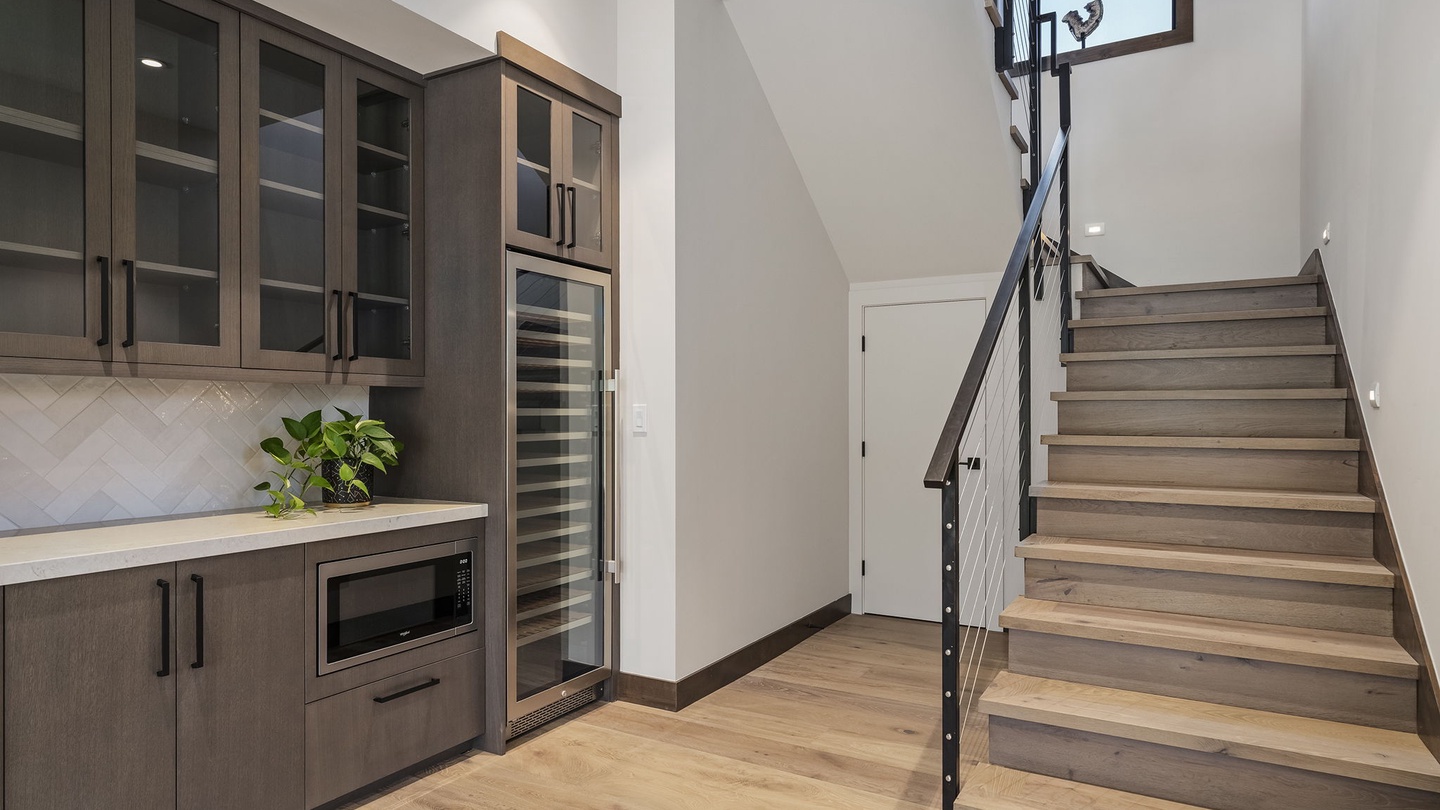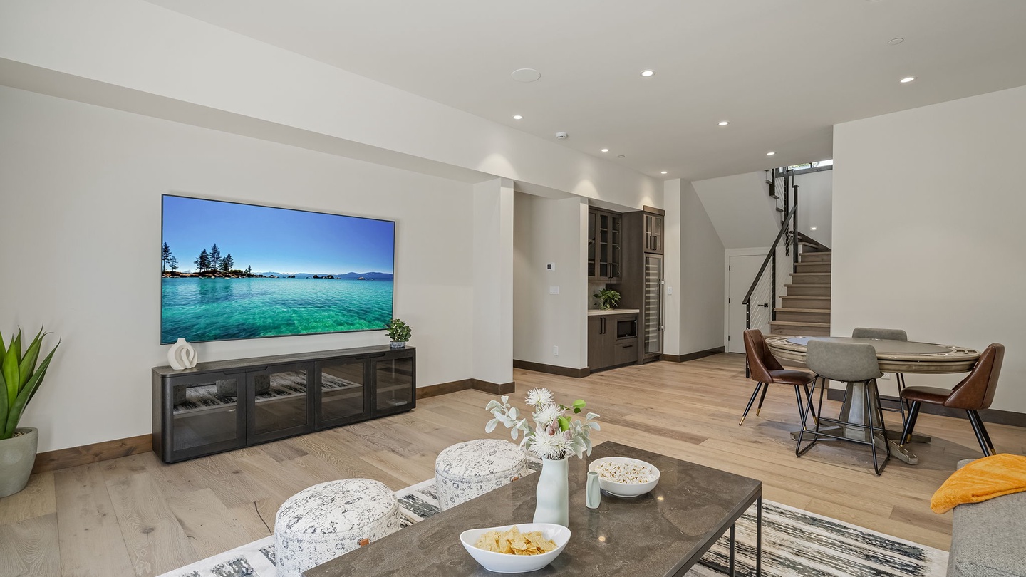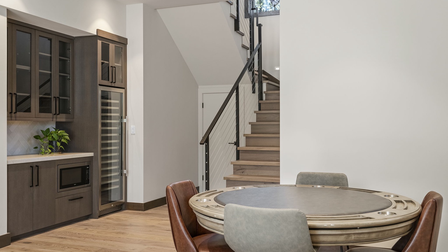 At the bottom of the stairs the home opens up to a casual den that features a poker table and a bar with a microwave and large wine fridge. A comfortable sectional with foot stools, a coffee table for games, and a large TV create an ideal space for spending time together, playing games and enjoying your favorite shows and movies.