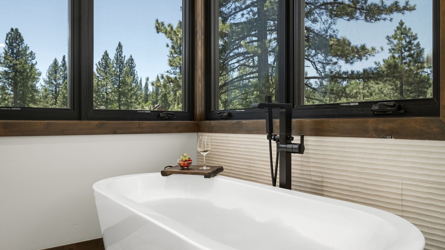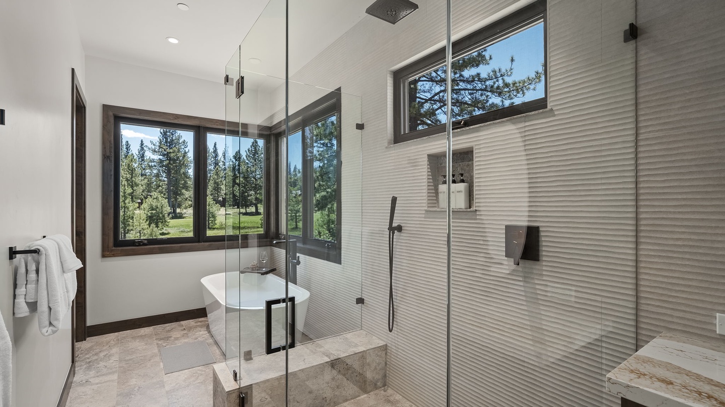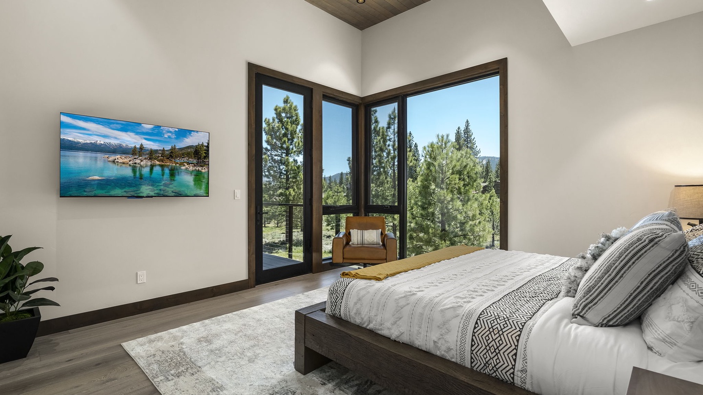 Tucked away around the corner from the main living areas, the primary suite is a serene retreat. It features a large, comfortable king-sized bed with soft, high-end linens and a large wall-mounted TV. A leather armchair provides a cozy spot for reading or relaxing. The spa-like, five-piece, ensuite boasts a large shower room, deep oval soaker tub, double sink vanity with a sleek marble top, and a separate water closet for added privacy. High ceilings and beautiful views make this suite an ideal spot for restful evenings and lazy mornings.