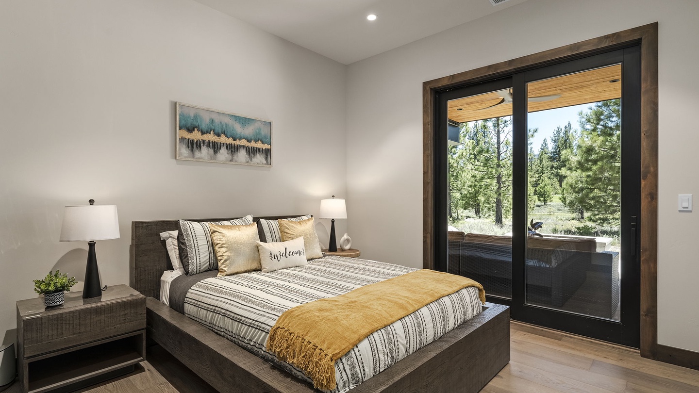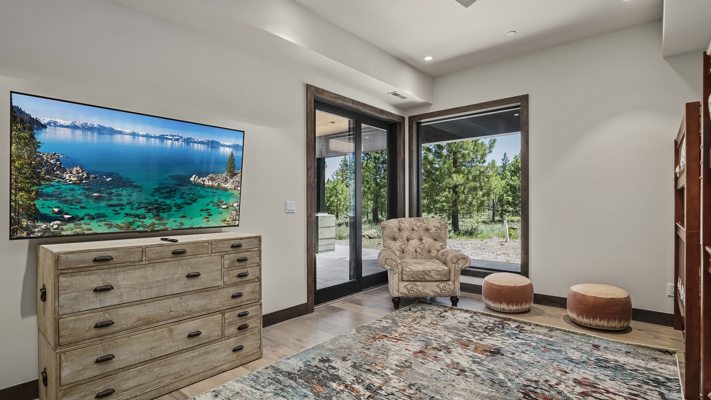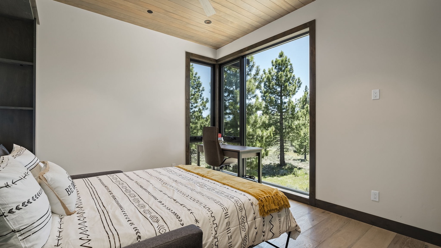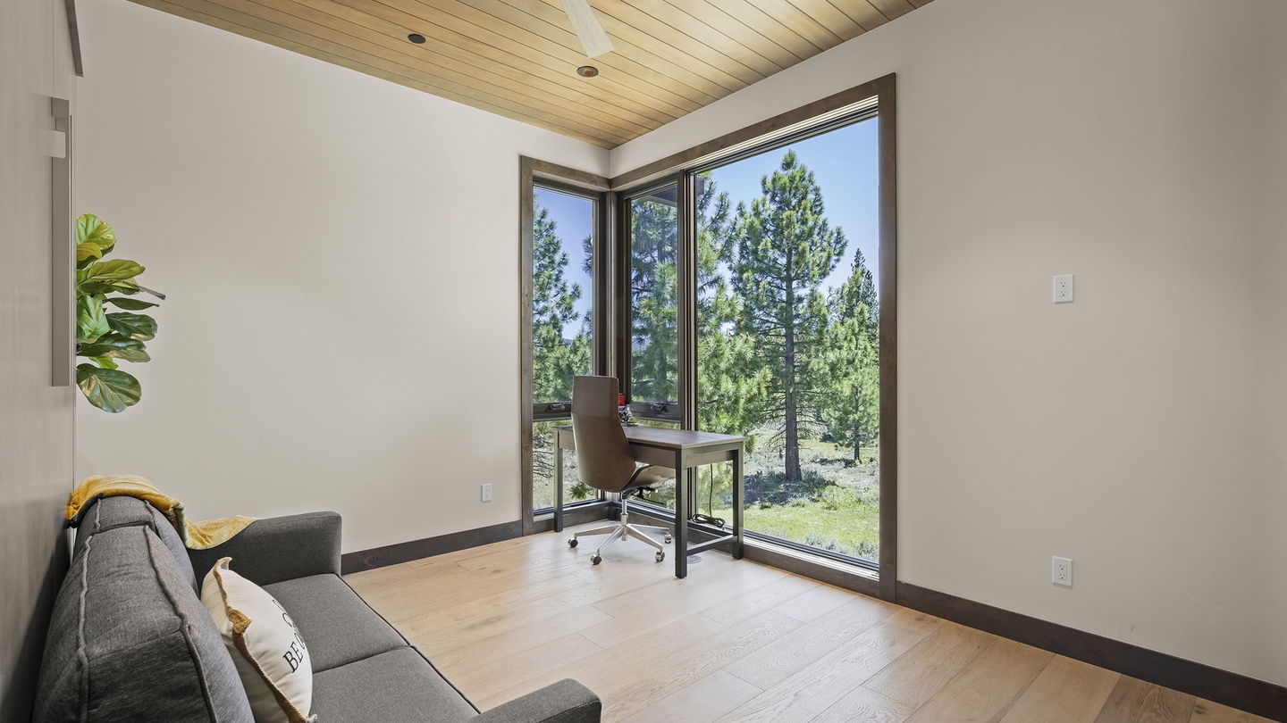 This versatile space on the main floor offers a beautiful office with a window-facing desk, allowing guests to work while enjoying the surrounding greenery. With a pull out queen bed as well, this home is both functional, comfortable and beautiful, perfect for vacations and work retreats.