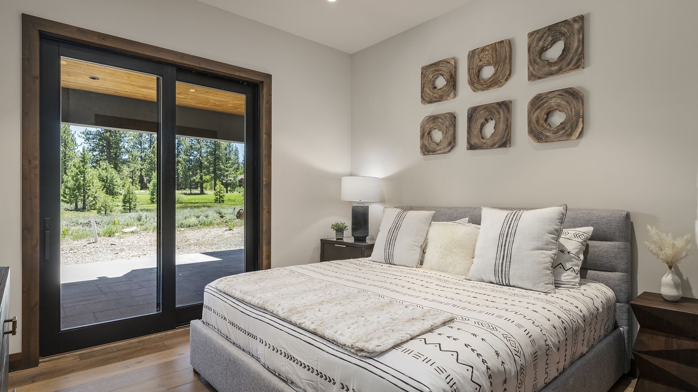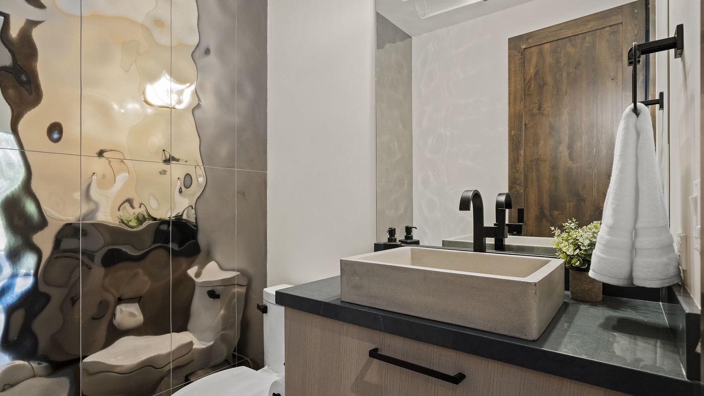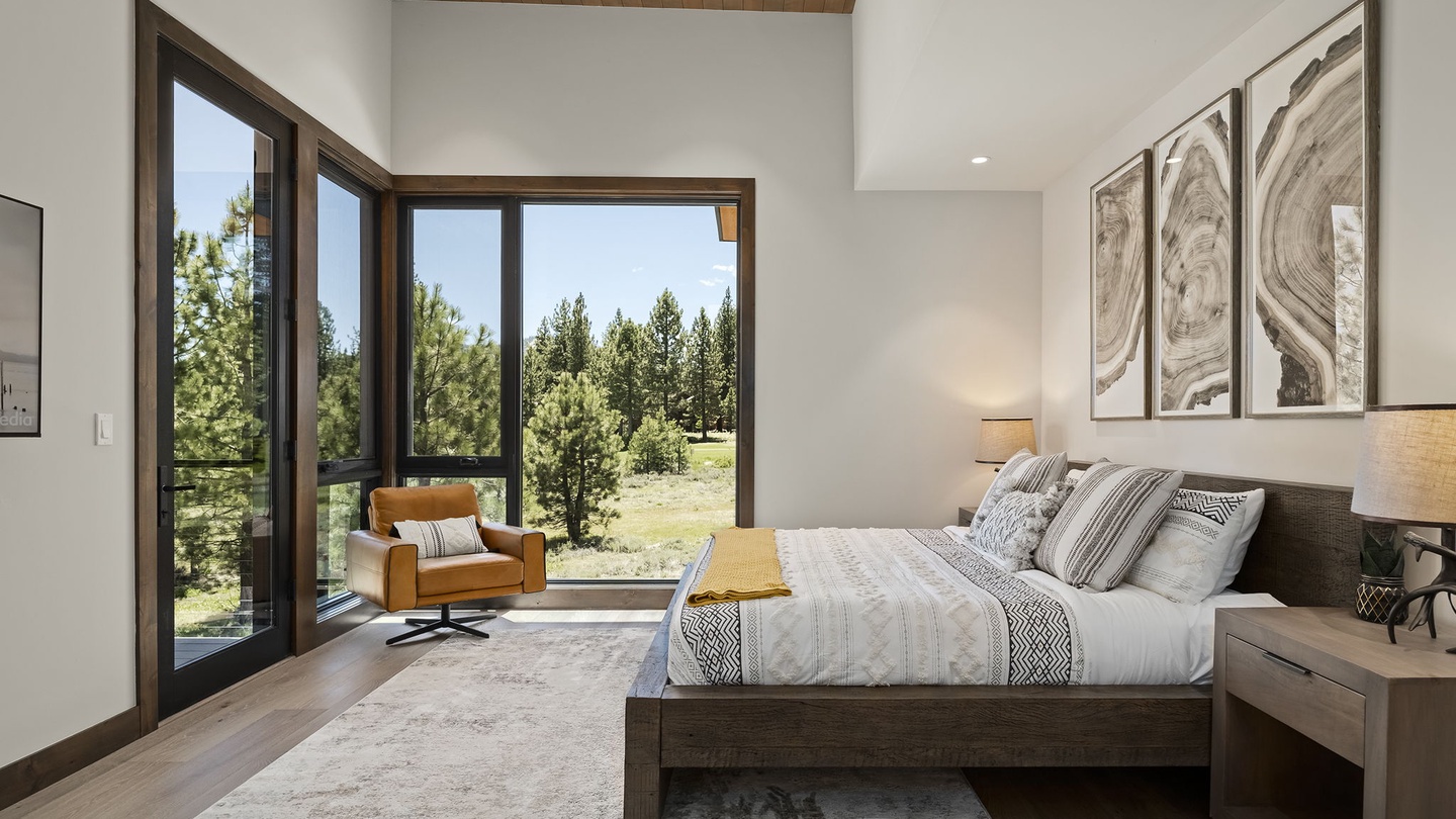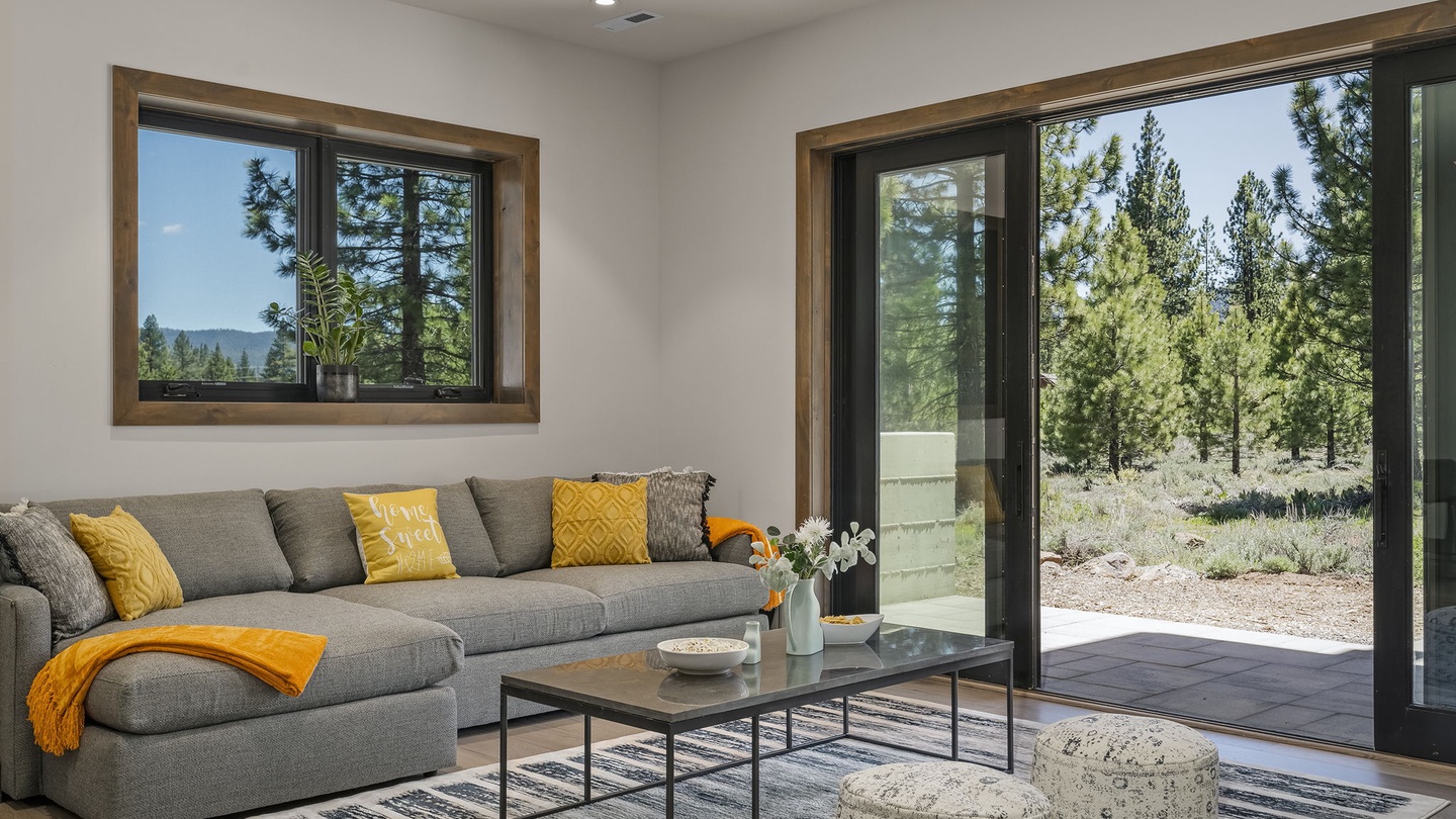 This versatile space on the main floor offers a beautiful office with a window-facing desk, allowing guests to work while enjoying the surrounding greenery. With a pull out queen bed as well, this home is both functional, comfortable and beautiful, perfect for vacations and work retreats.