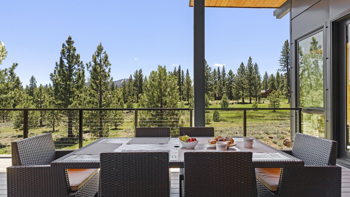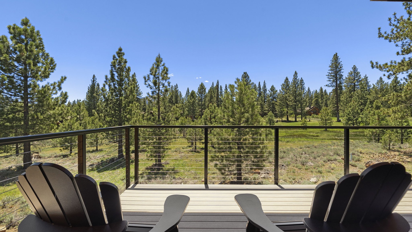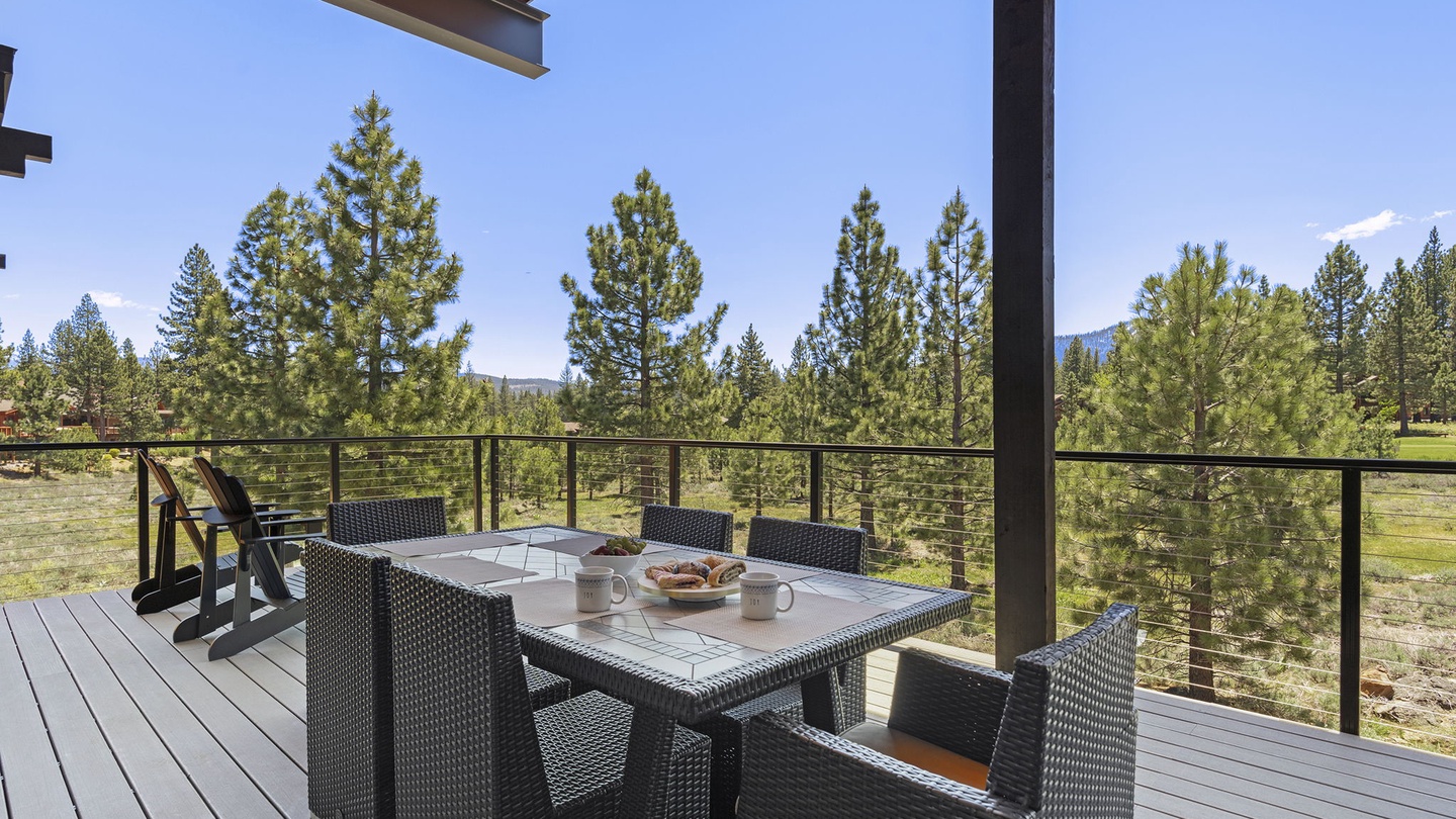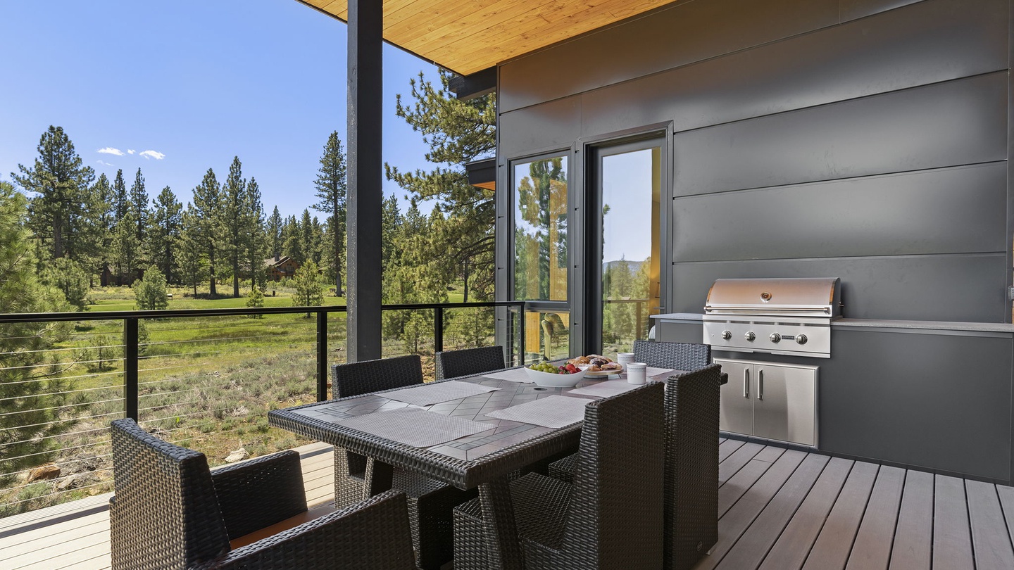 Accessible from the living room via sliding doors, the main floor patio is equipped with a six-person dining table, Adirondack chairs, and a deluxe BBQ. With fans and heaters, this outdoor space is perfect for grilling and dining year-round, regardless of the weather.