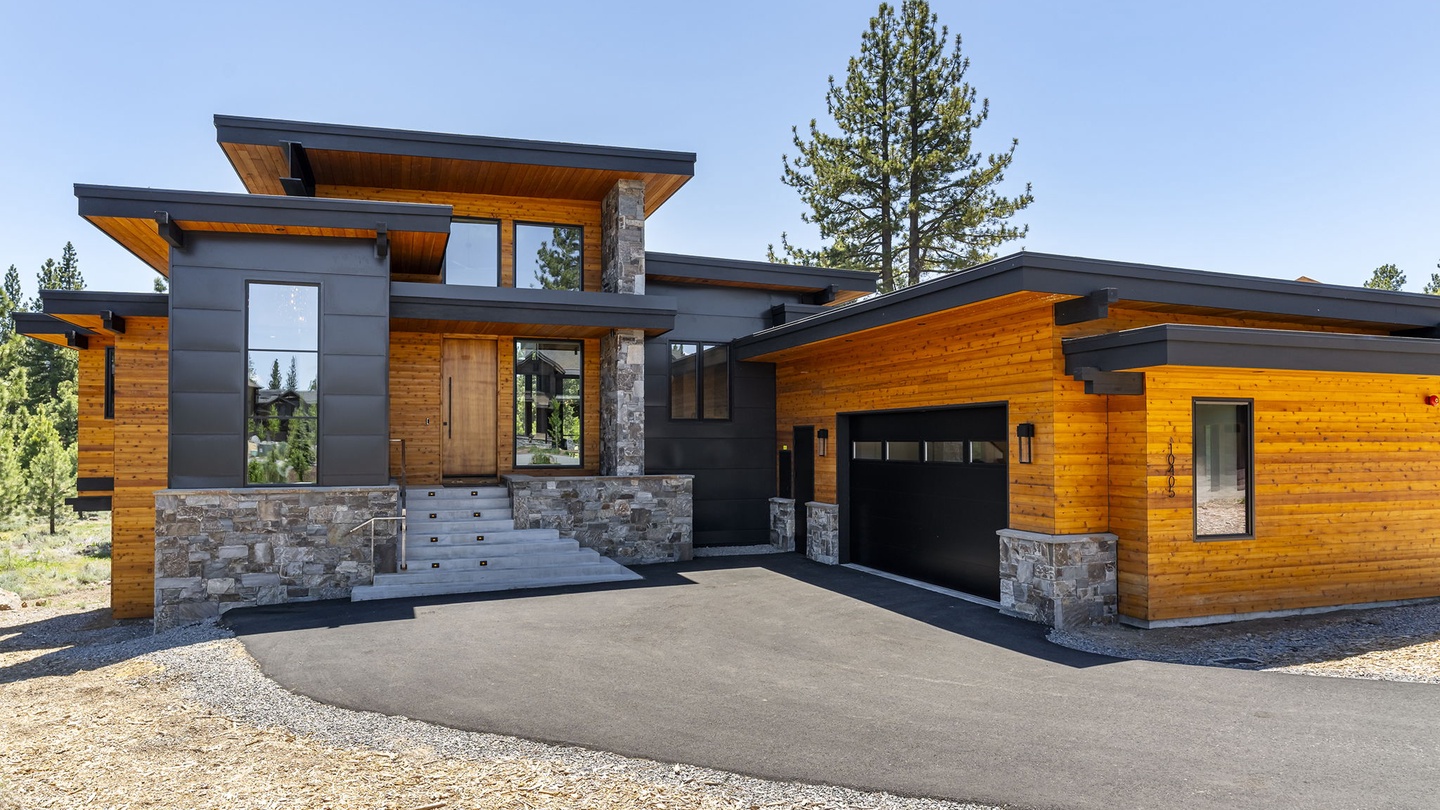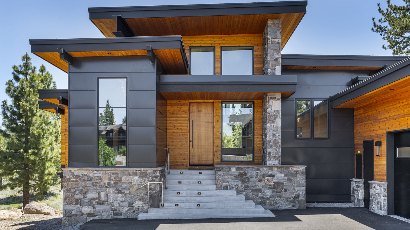 Nestled in the prestigious Schaffer’s Mill neighborhood on the serene shores of North Lake Tahoe, this five-bedroom, four-and-a-half-bathroom home seamlessly blends upscale modern design with the timeless charm of mountain living. The exterior boasts compelling architecture with dynamic lines, beautifully contrasting the organic movement of the surrounding nature. The slate gray hues and warm wood materials echo the mountainous landscape and forest that embrace this luxurious retreat.