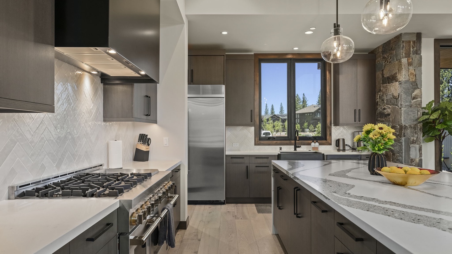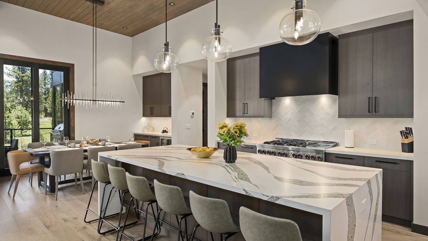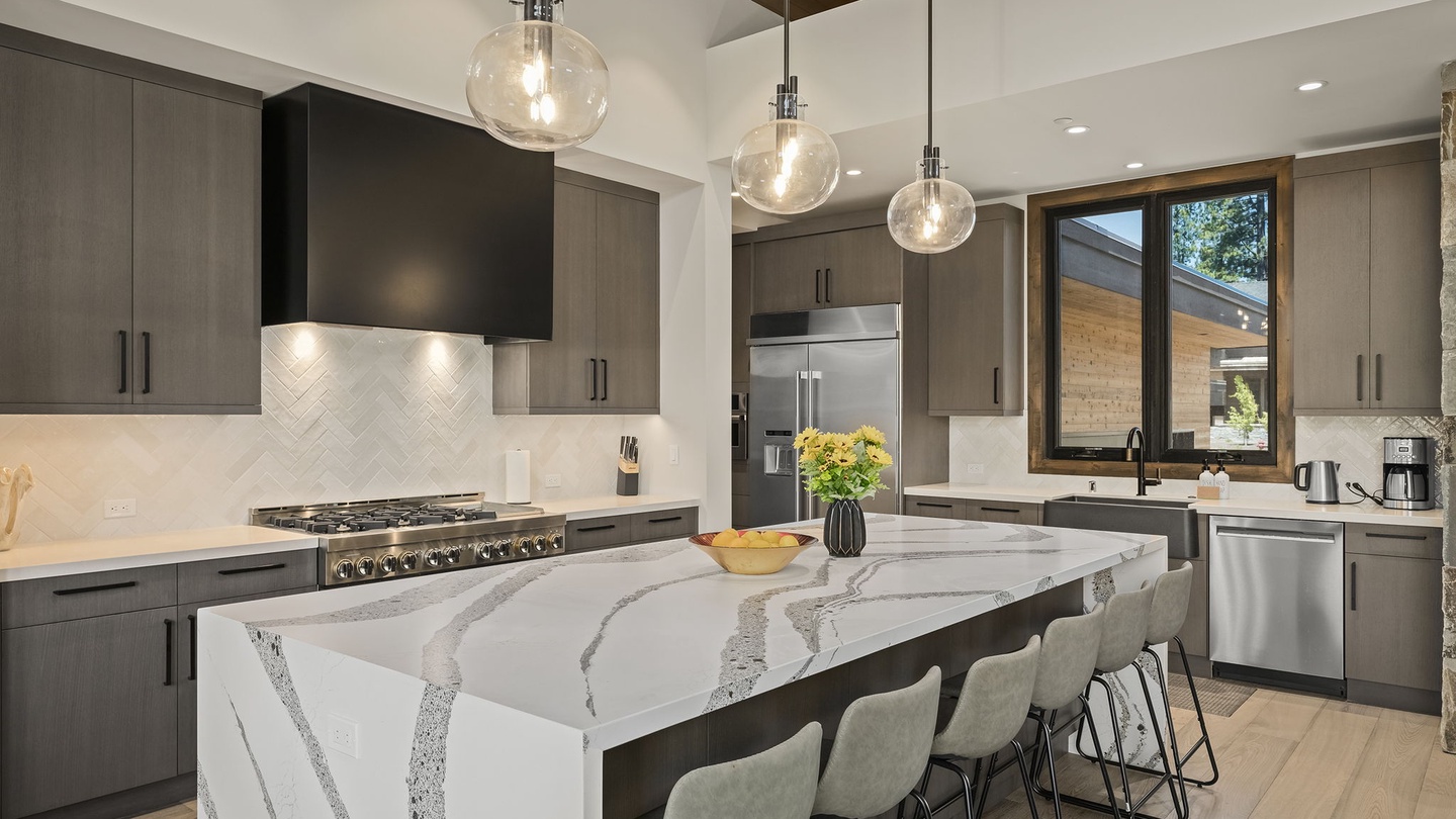 Designed for both beauty and functionality, the kitchen features beautiful countertops, sleek cabinets, and high-end appliances. The large island, wrapped in stunning striped monochrome marble, offers six comfortable, cushioned bar seats. A butler’s pantry allows for seamless meal preparation, keeping the main kitchen area tidy and inviting. It’s a fantastic space for large feasts, communal cooking or quick breakfasts before a day of adventure!