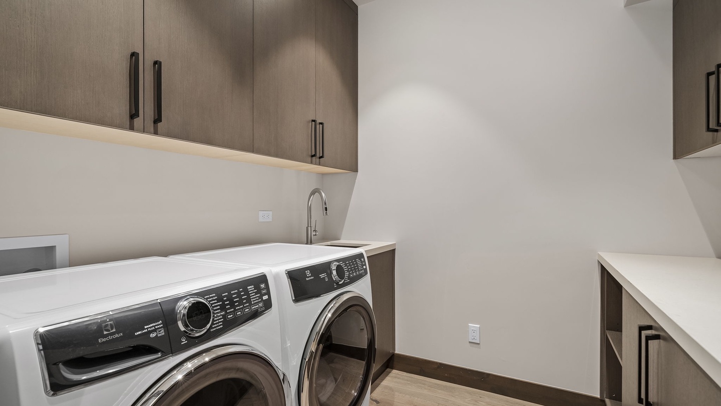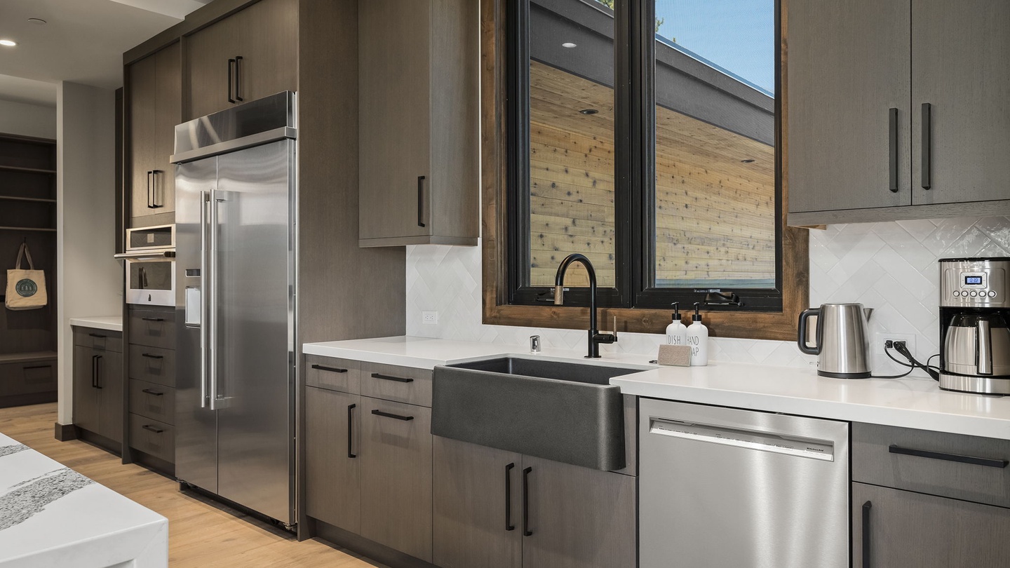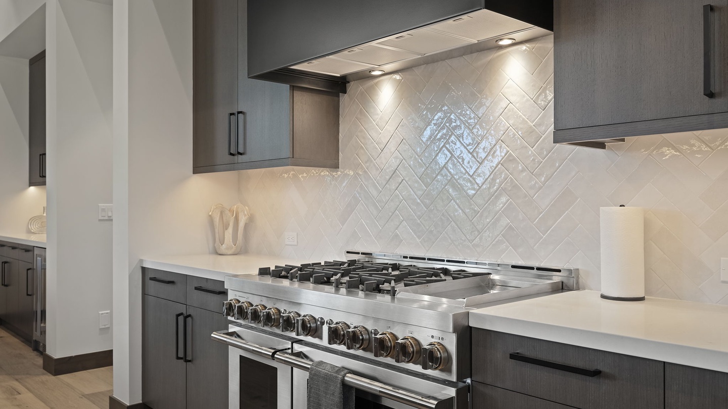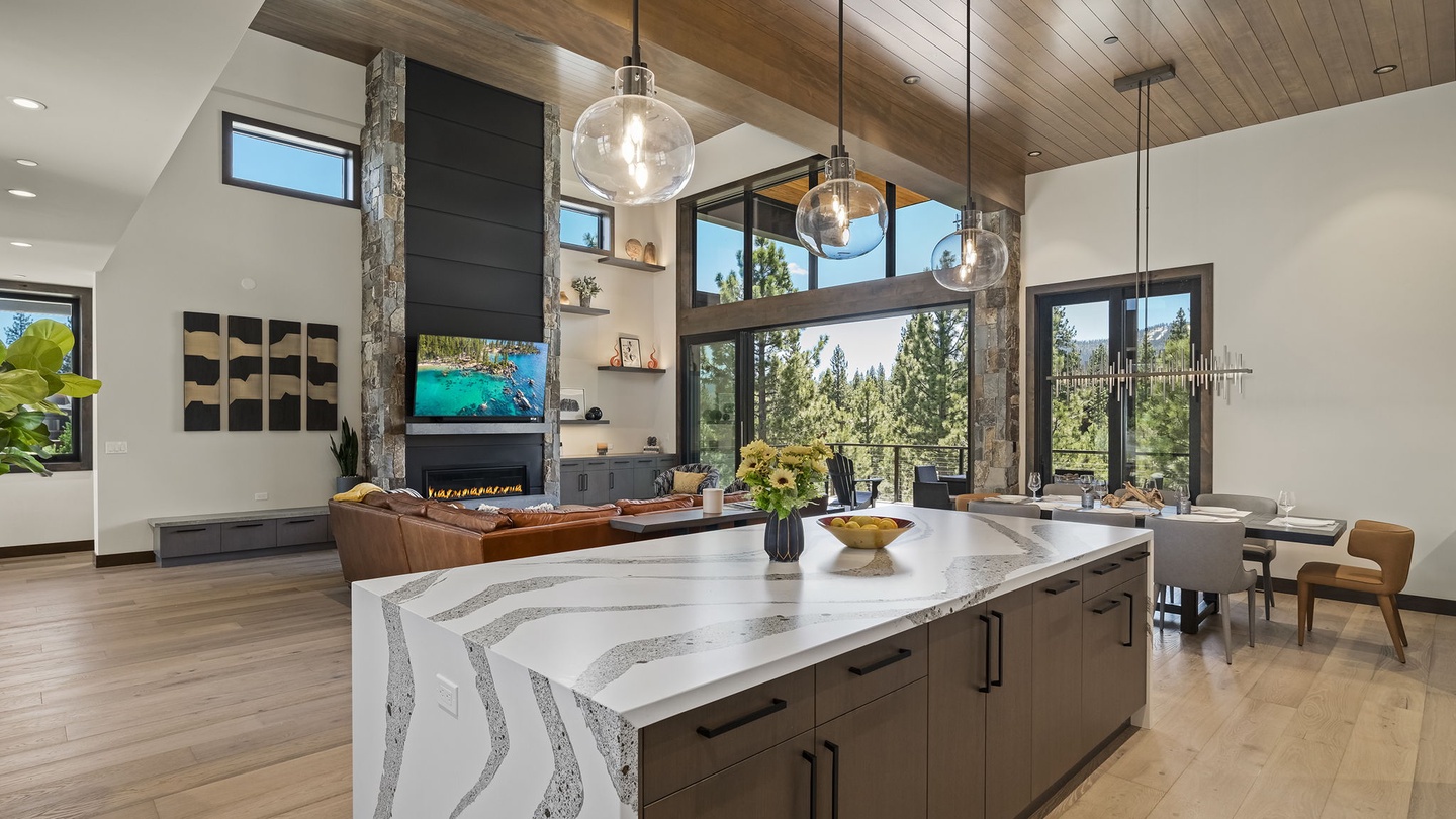 Designed for both beauty and functionality, the kitchen features beautiful countertops, sleek cabinets, and high-end appliances. The large island, wrapped in stunning striped monochrome marble, offers six comfortable, cushioned bar seats. A butler’s pantry allows for seamless meal preparation, keeping the main kitchen area tidy and inviting. It’s a fantastic space for large feasts, communal cooking or quick breakfasts before a day of adventure!