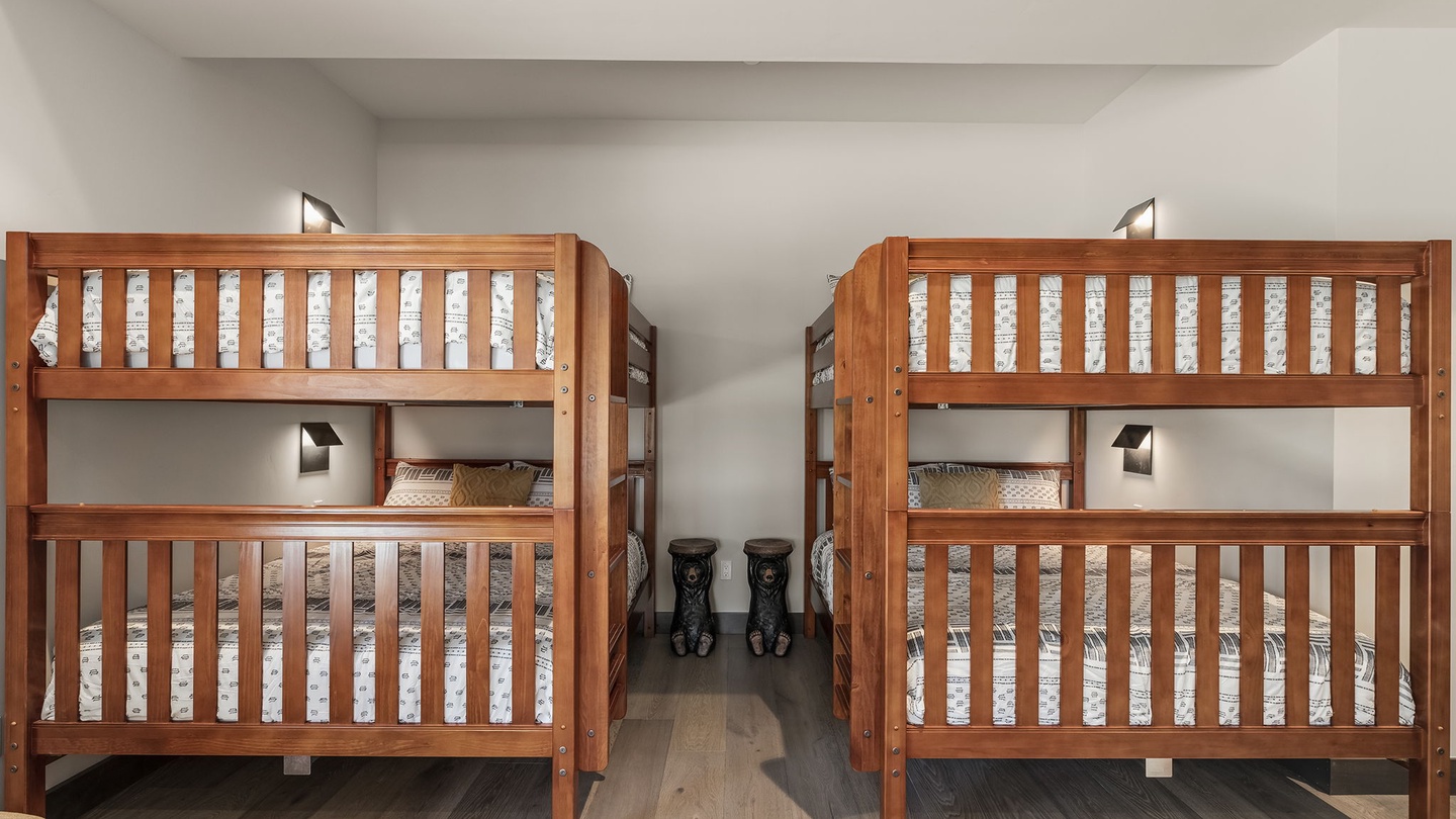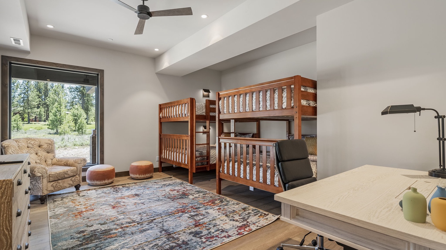 Perfect for kids and teenagers, this large bedroom at the end of the hall offers four comfortable beds, plenty of play space, a desk, and access to the lower patio. The private ensuite includes a walk-in shower and double vanity, making it a great hangout space away from the main living areas.