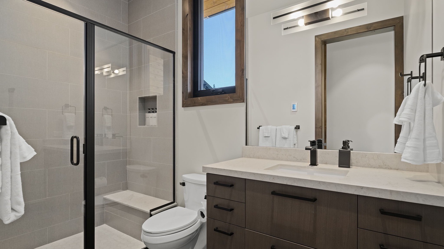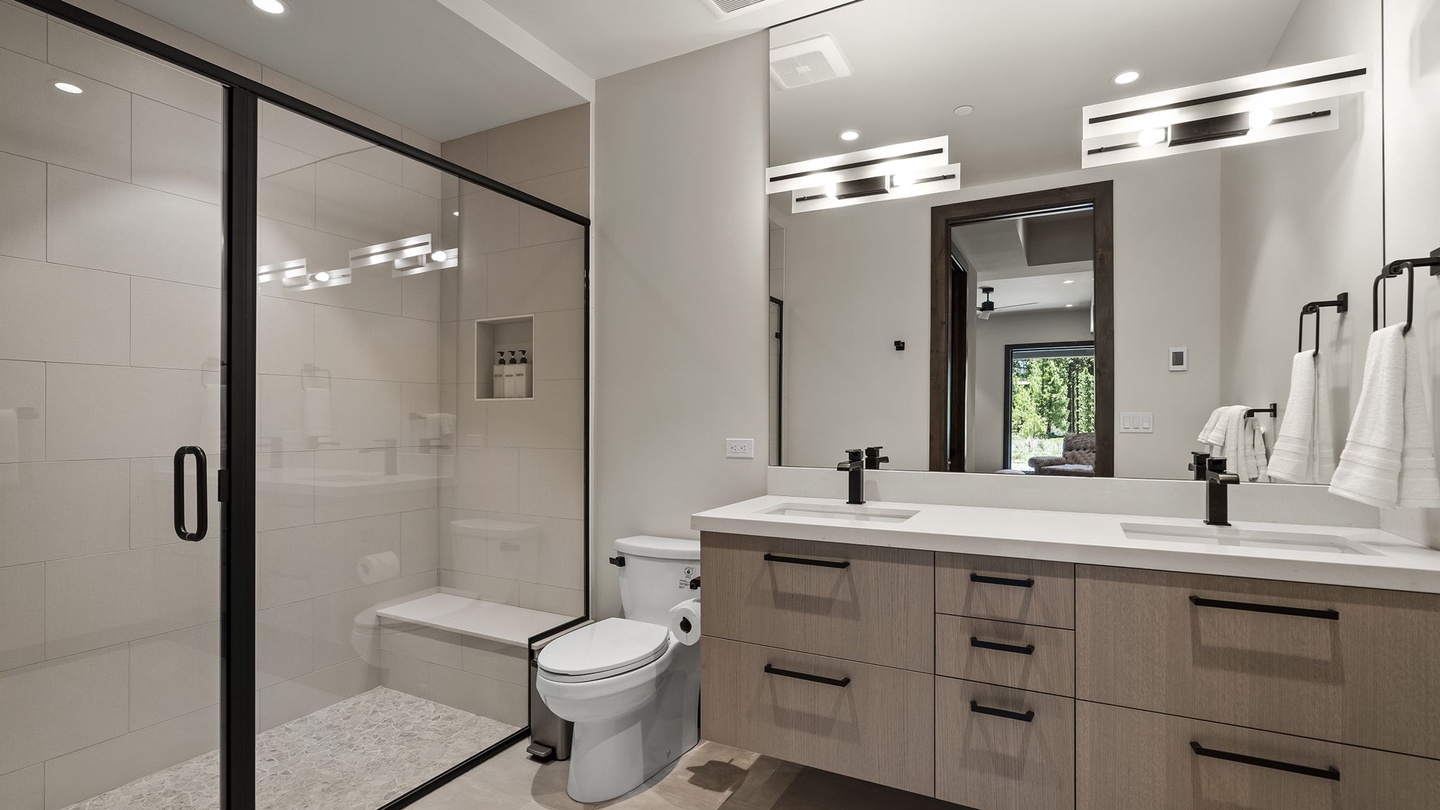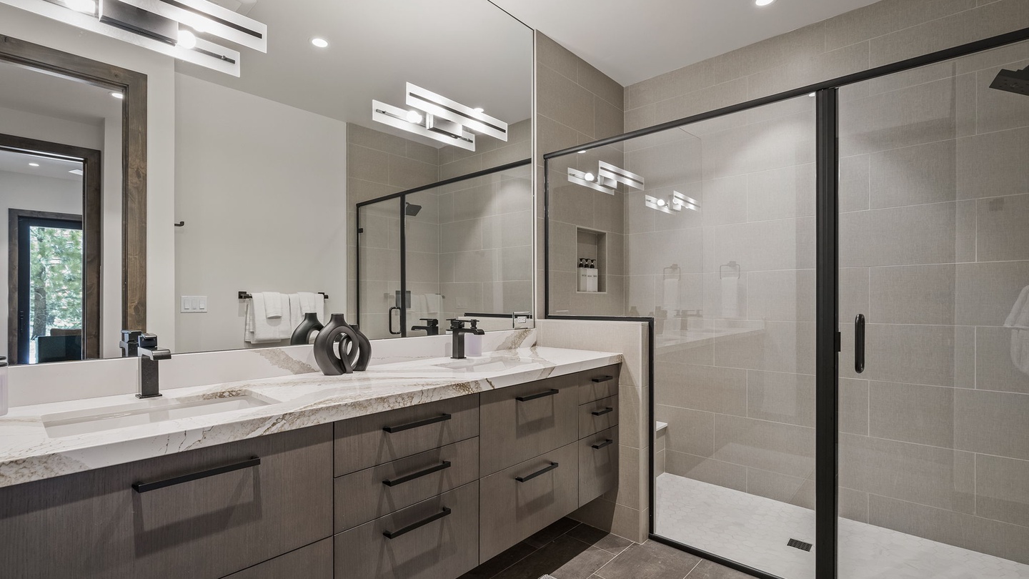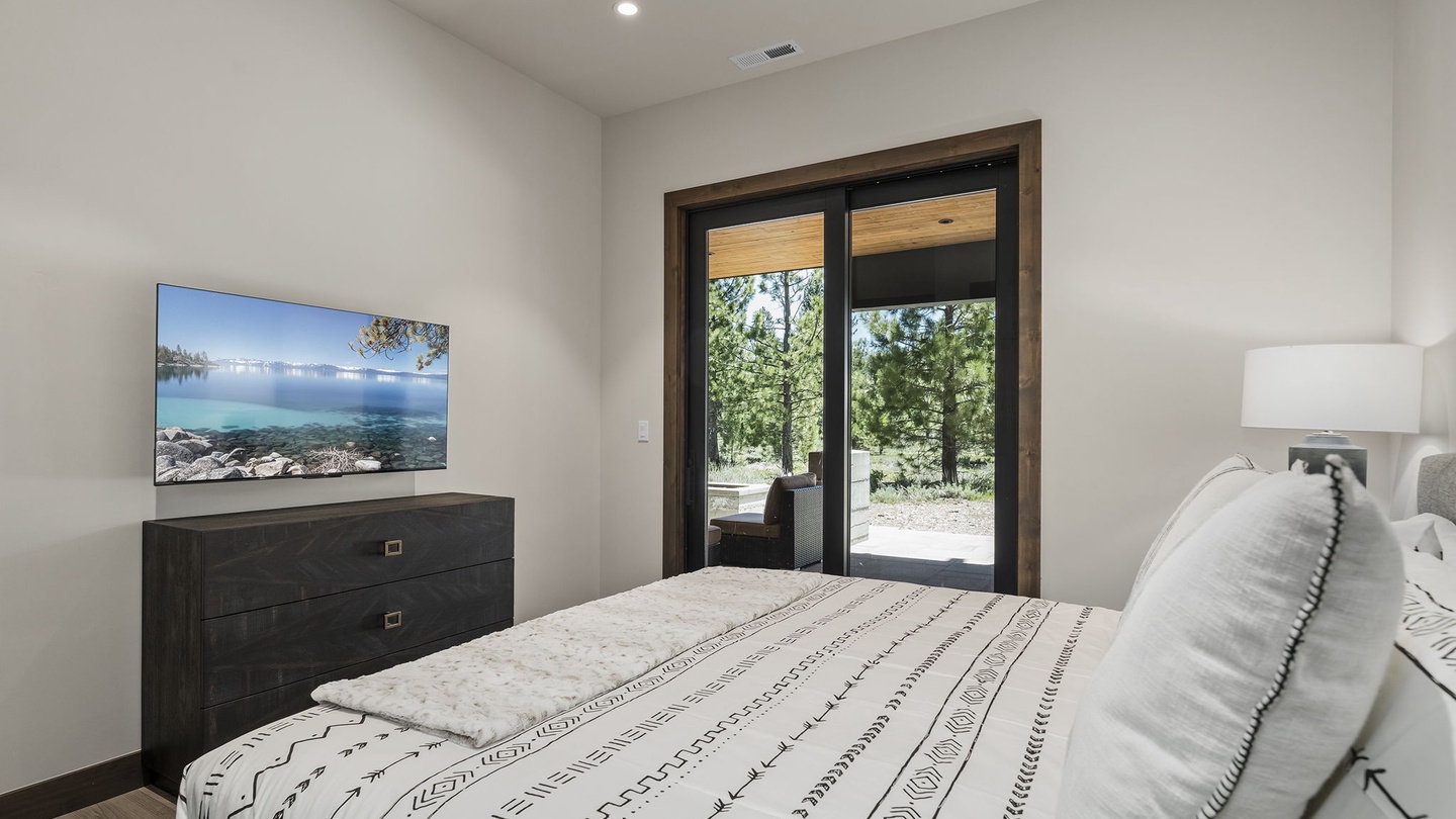 The first two bedrooms on the lower floor are bright and comfortable, each with flat-screen TVs, ample closet space, and access to the lower floor patio. They share a spacious four-piece bathroom with a large walk-in shower and double vanity.