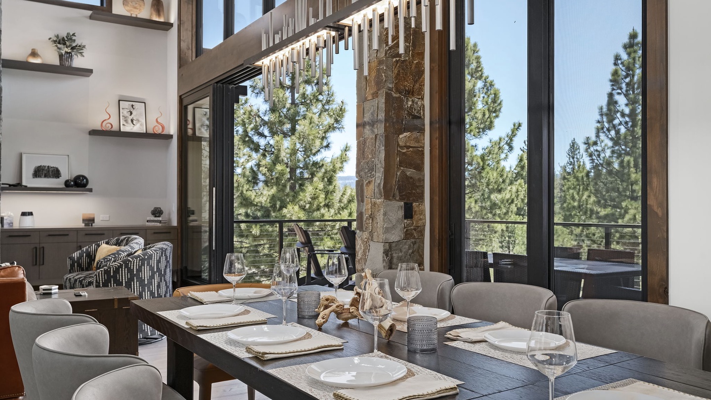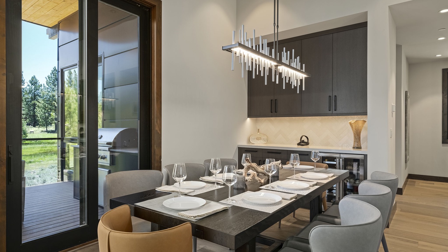 To the back of the living room, you’ll find an elegant dining room that offers a sophisticated setting for entertaining with an eight-person table. Above, a modern chandelier provides the perfect lighting for dinner parties. A side buffet and separate wine fridge make it easy to serve family-style meals, buffets, or hors d'oeuvres Whether hosting a casual meal or a gourmet dinner party, the stunning china and place settings ensure a memorable dining experience!