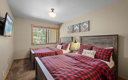 Downstairs, the lower floor offers the perfect retreat after a day of adventure. The queen bedroom is spacious and inviting, with soft linens, a flatscreen TV mounted on the wall, and tasteful mountain-inspired décor. The second bedroom, featuring two double beds, offers similar comforts, making it an excellent option for kids, teenagers, or additional guests. Despite being on the lower floor, both bedrooms feel bright and welcoming thanks to natural light streaming through the windows. A shared bathroom with modern fixtures ensures everyone has room to refresh and unwind.
