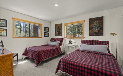 Upstairs, you'll find two more bedrooms and an additional full bathroom providing lots of comfortable sleeping options for your whole group! The first upstairs bedroom features a queen bed, while the second bedroom features two double beds, fitted with soft bed linens and decorated with nature-themed accents that enhance the mountain cabin atmosphere. The soft, Berber carpet adds to the light and bright atmosphere of the upstairs area.