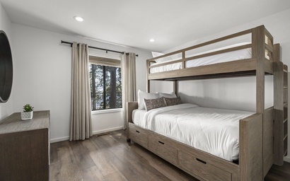 Just across the hall, the twin-over-queen bunk room brings a playful spirit without compromising on comfort. Custom-built and beautifully crafted, the bunk beds are perfect for kids, teens, or adults, adding both flexibility and fun to your group’s sleeping arrangements.
