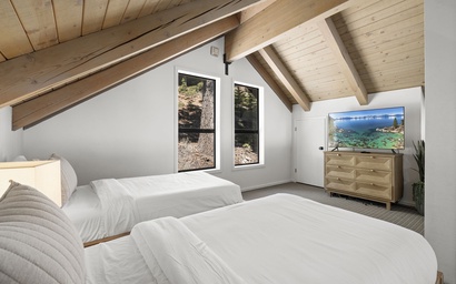 At the top of the home, the loft feels like a hidden haven above the treetops. Two twin daybeds with pull-out trundles create a light-filled, flexible space that works as a sleeping area, reading nook, or play zone. Framed by sloped ceilings and warm natural textures, it’s a whimsical, peaceful spot for kids, teens, or even adults seeking a little solitude and sunshine.