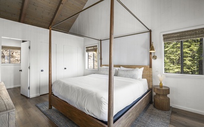 Also on the main floor, the serene primary suite feels like a luxury retreat all its own. Step into a sunlit sanctuary where soft, neutral tones and a calming design aesthetic instantly set you at ease. At the center of the room, a striking wooden four-poster bed invites long, restful mornings under crisp high-end linens and cozy throws. The space is chic yet understated, with a perfect blend of clean lines and warm textures that echo the natural beauty just outside the windows.