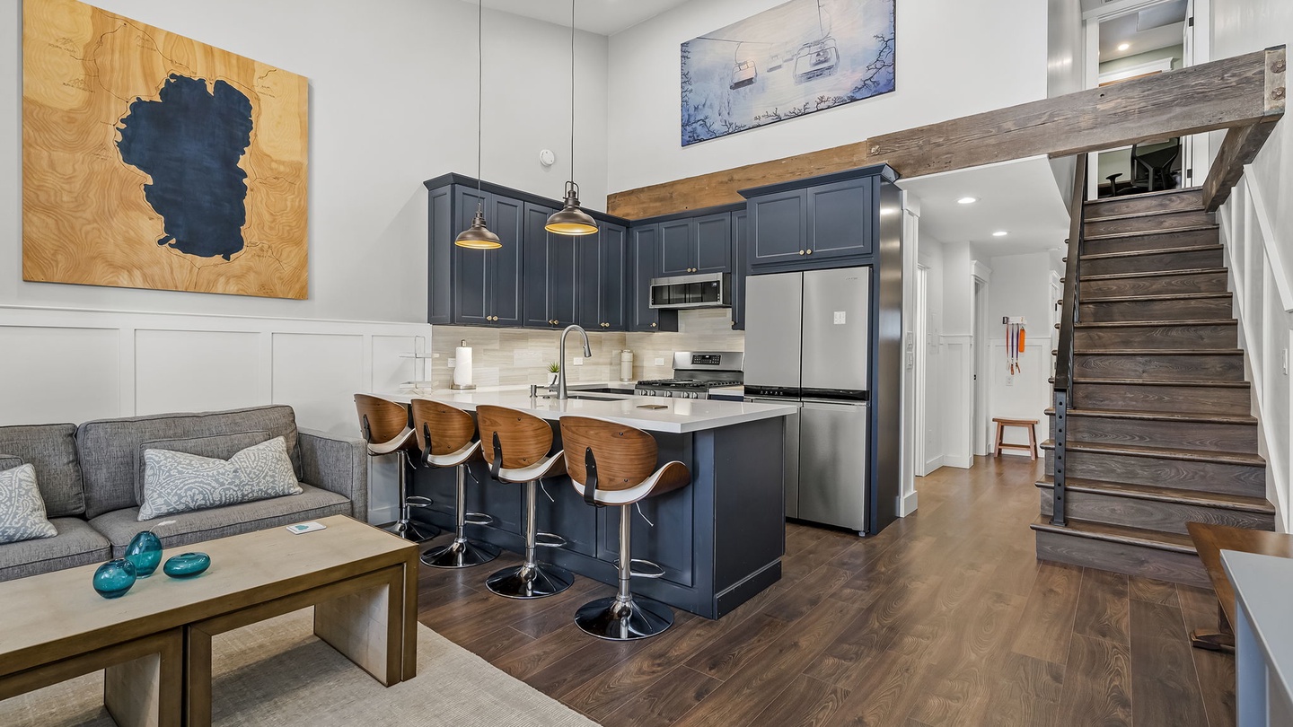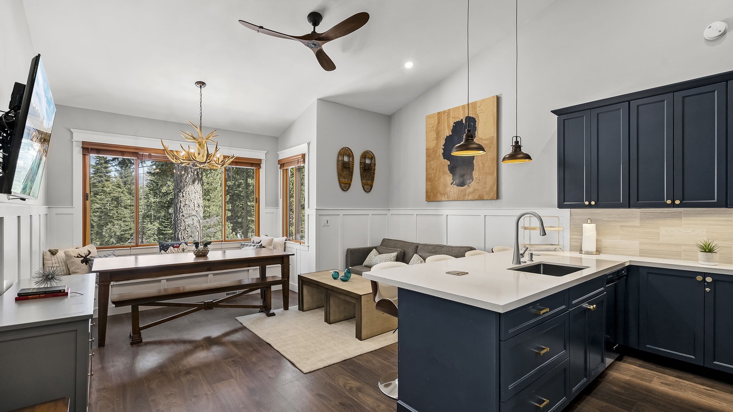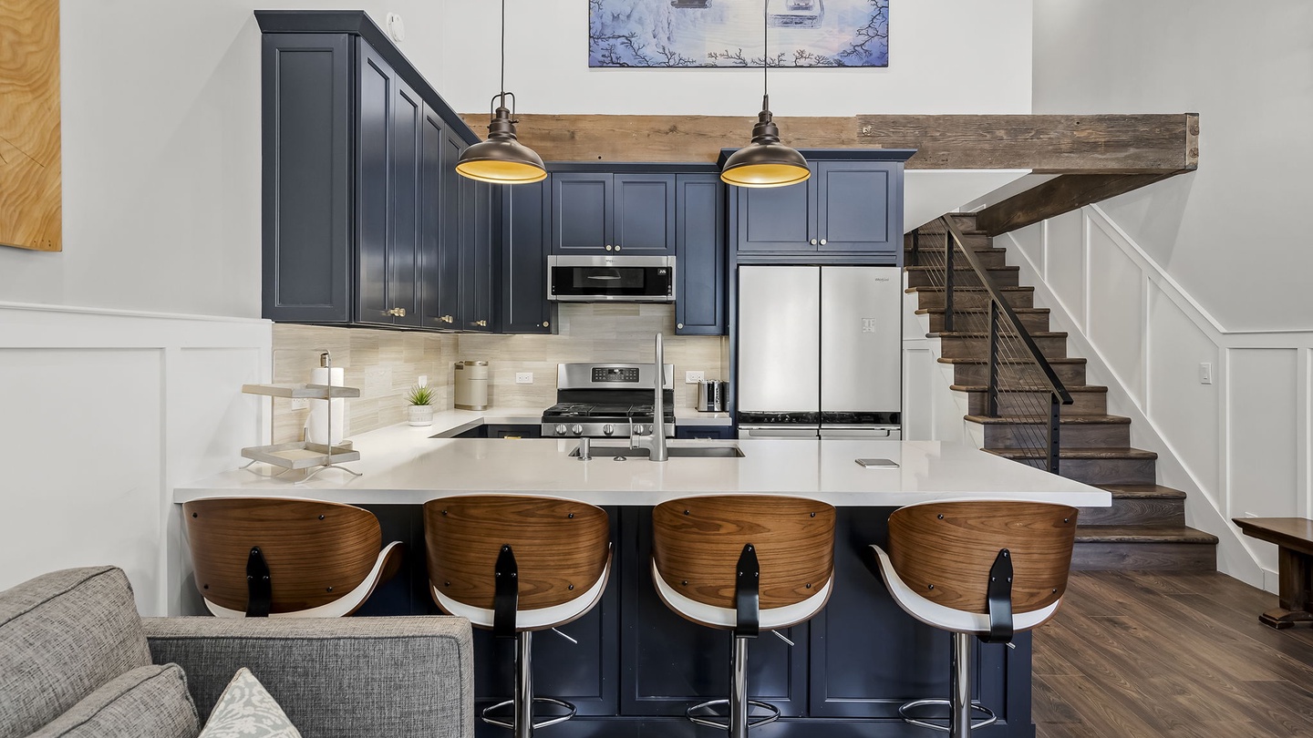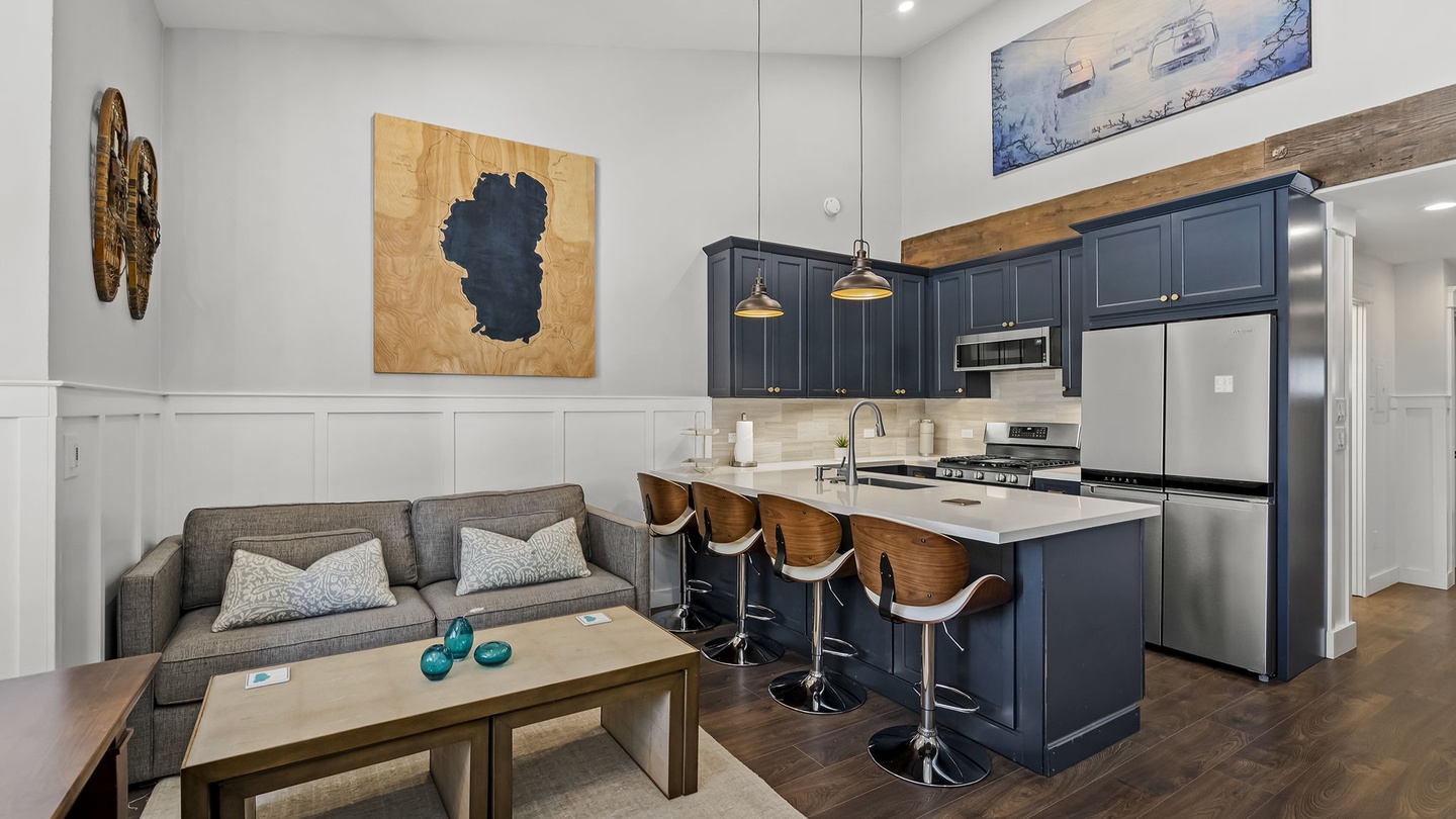 As you step into this bright and gorgeous home, you'll be greeted by a completely renovated dining area, kitchen, and sitting area. Enjoy a book on the cozy bench while glimpsing at the gondola go by. The kitchen has been thoughtfully designed and is fully equipped with enough space to make anything you need during your stay. High-end stainless steel appliances, beautiful blue cabinets, and gorgeous countertops make this space a joy to cook in. Comfortable bar seating for four people is perfect for casual meals, coffee in the mornings, or drinks and hanging out with the chef in the evenings.