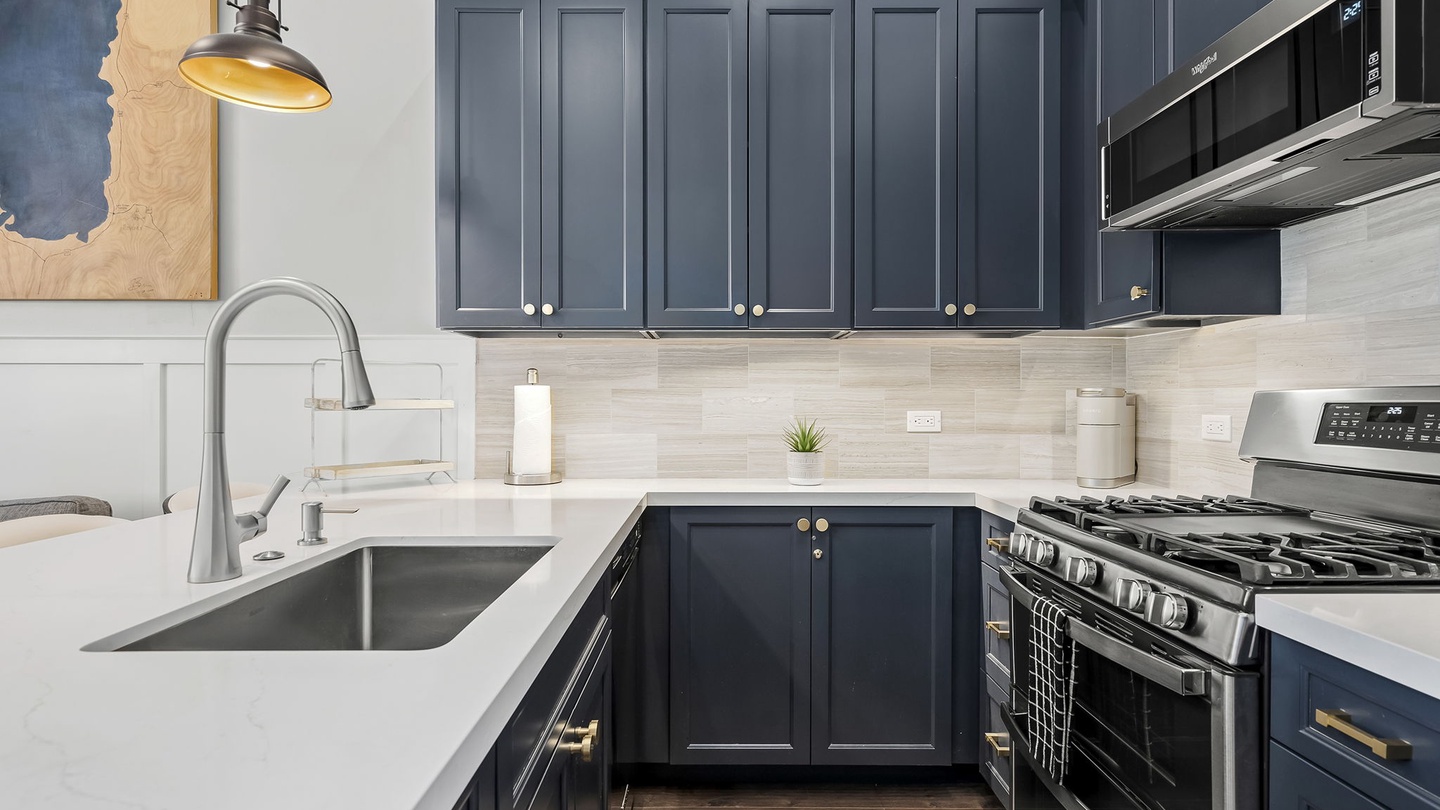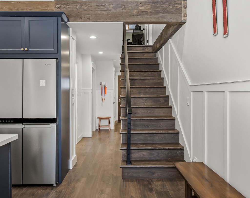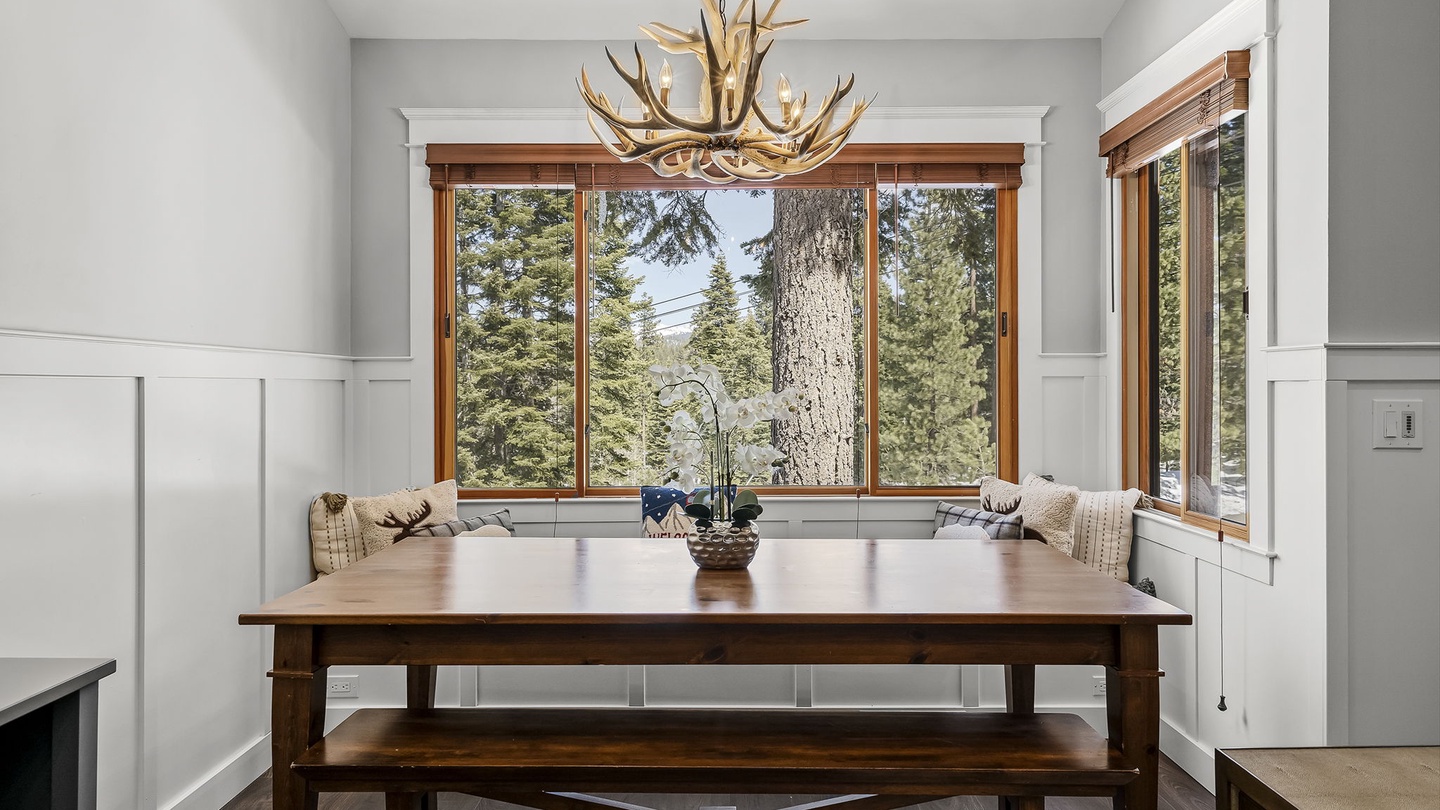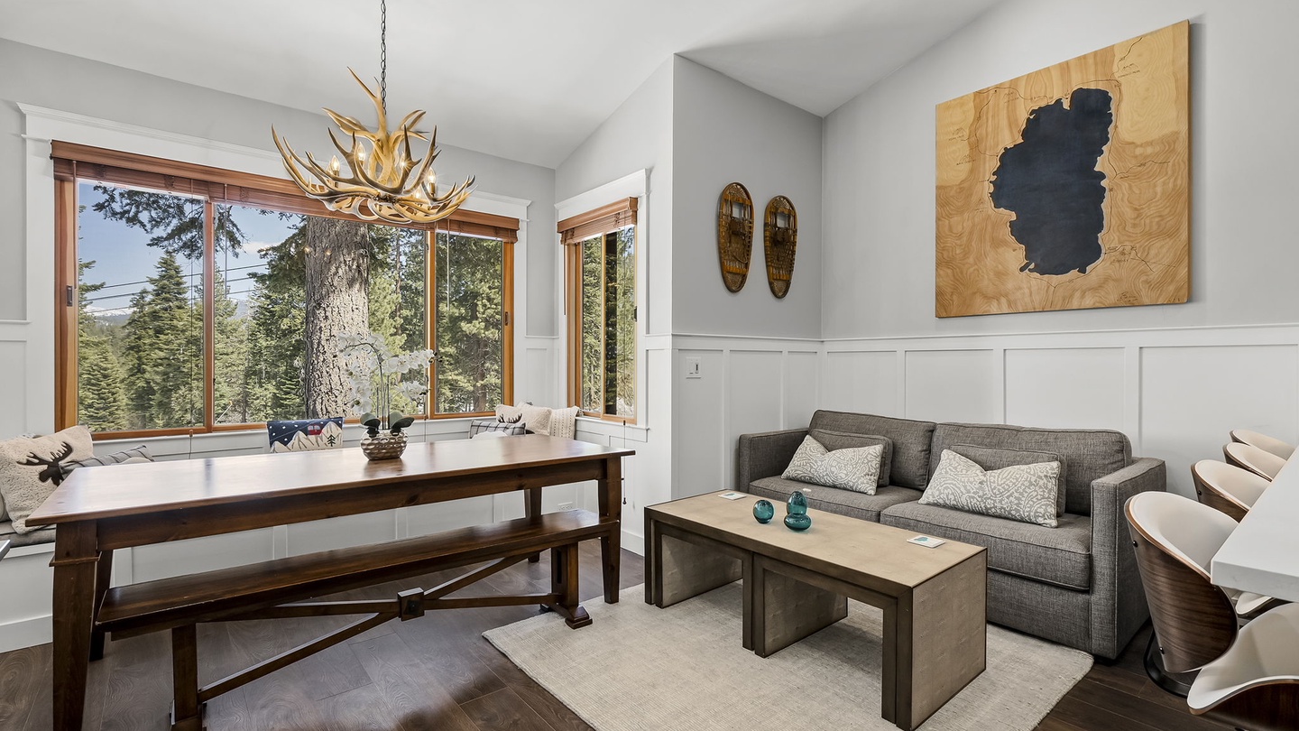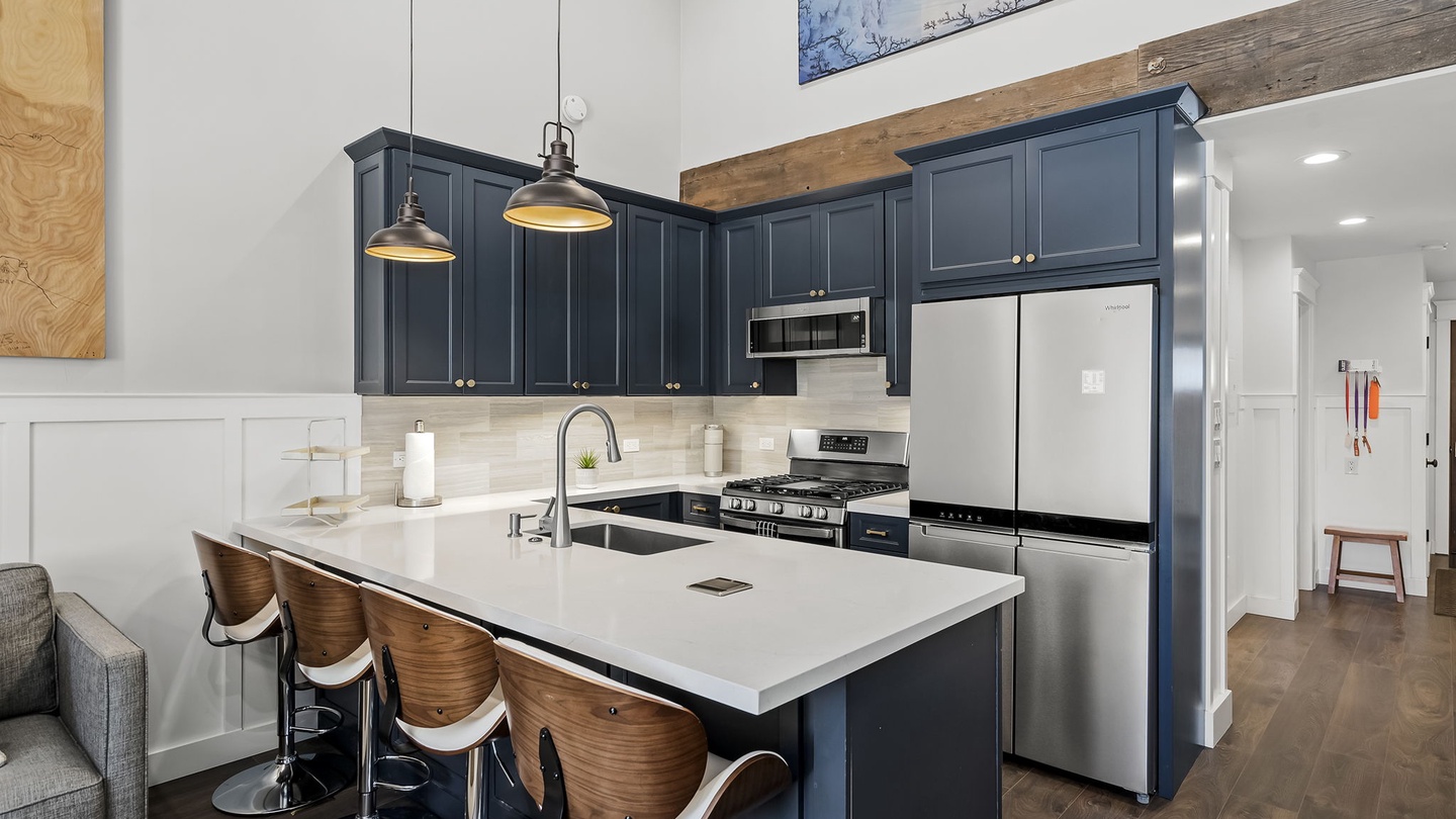 As you step into this bright and gorgeous home, you'll be greeted by a completely renovated dining area, kitchen, and sitting area. Enjoy a book on the cozy bench while glimpsing at the gondola go by. The kitchen has been thoughtfully designed and is fully equipped with enough space to make anything you need during your stay. High-end stainless steel appliances, beautiful blue cabinets, and gorgeous countertops make this space a joy to cook in. Comfortable bar seating for four people is perfect for casual meals, coffee in the mornings, or drinks and hanging out with the chef in the evenings.