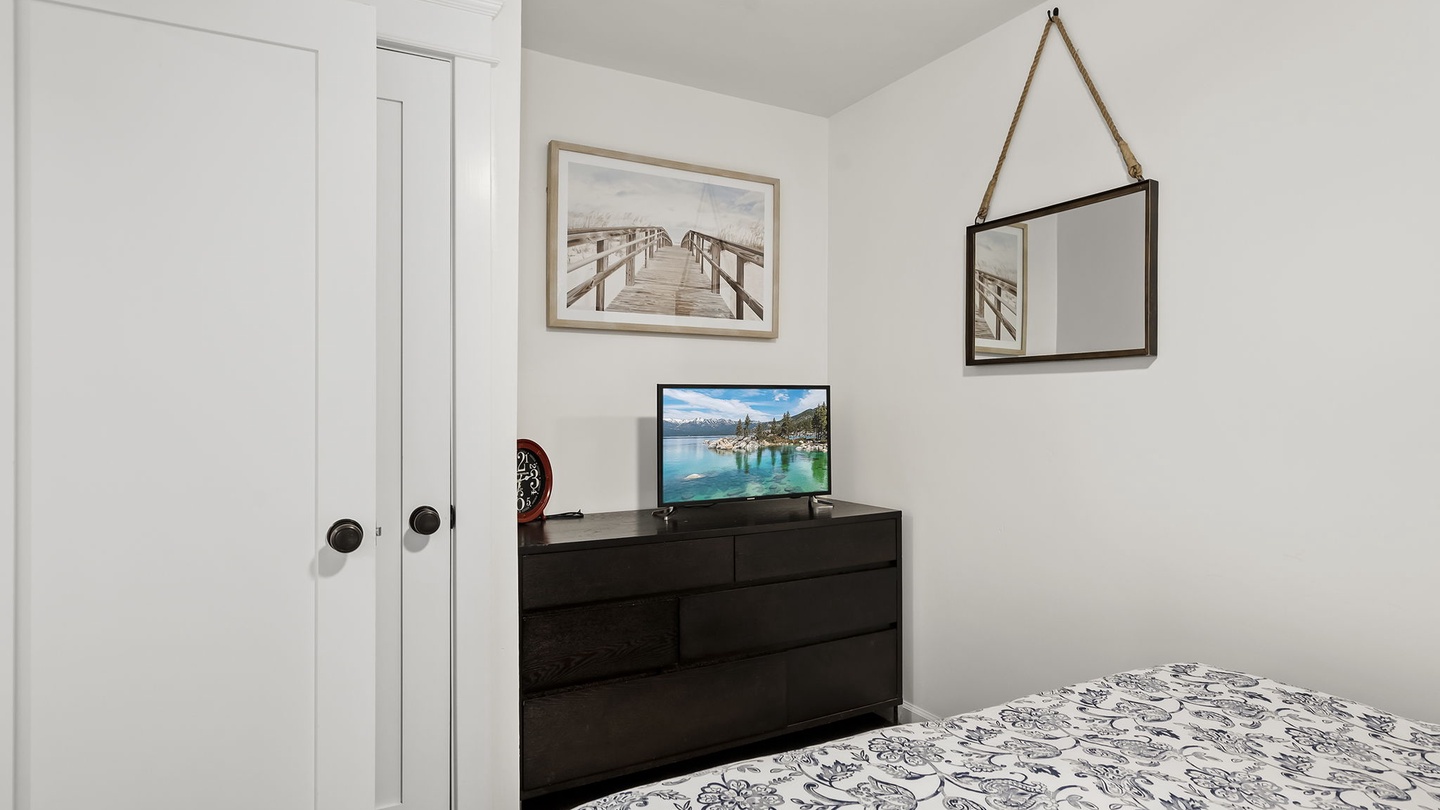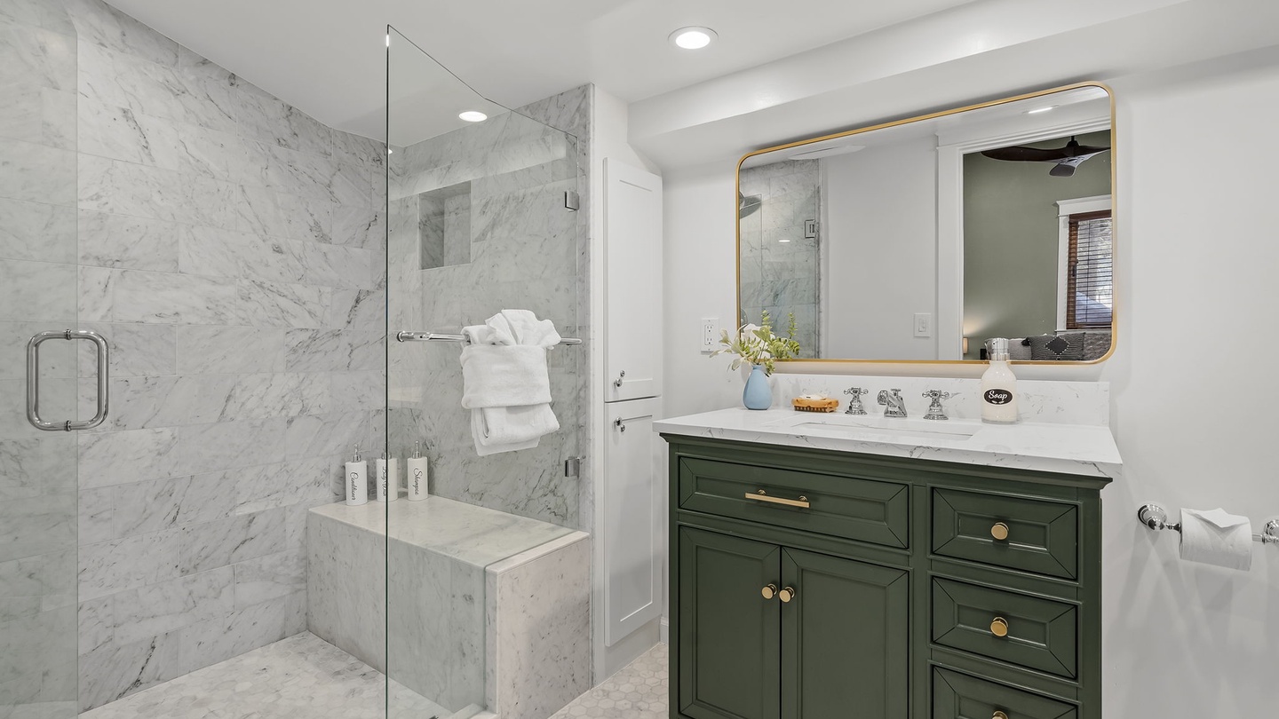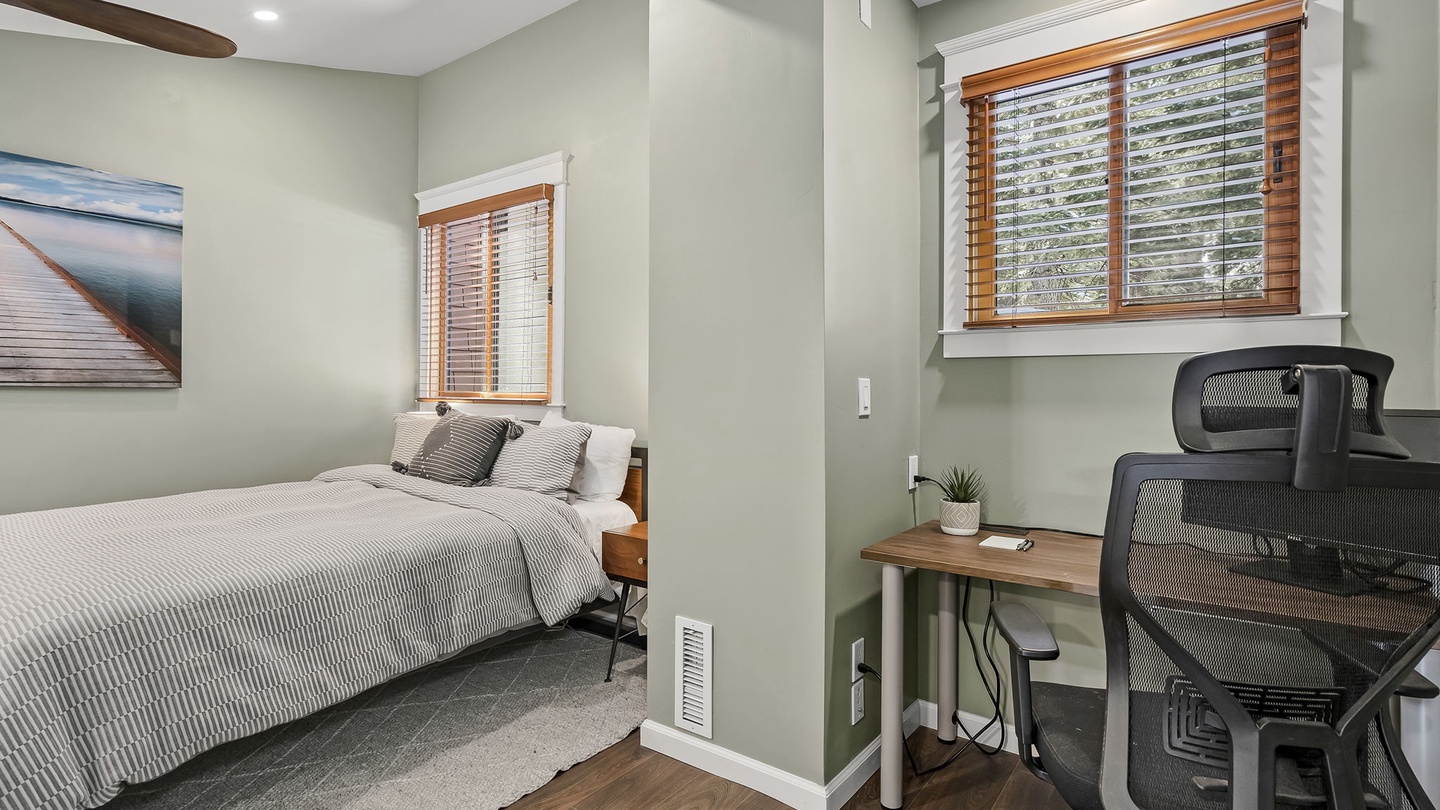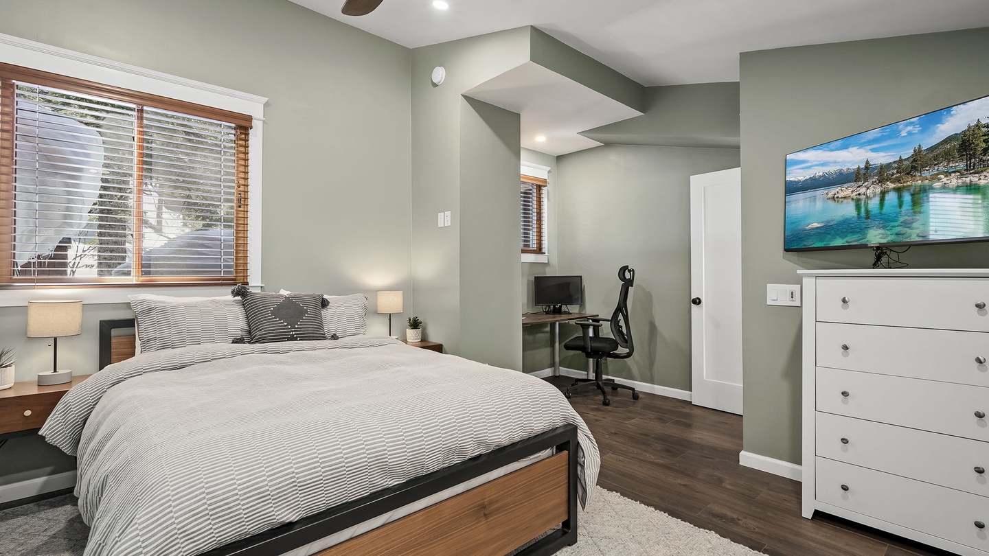 The primary suite on the upper floor features a comfortable queen bed, soft, high-end linens, a bright and calming neutral color scheme, and minimalist decor. A flat-screen TV and office area make this space a perfect retreat from the rest of the house where you can watch a movie, get some work done, or send a few emails in privacy. The large ensuite bathroom boasts a marble walk-in shower, providing a relaxing space to unwind after a day of outdoor activities.