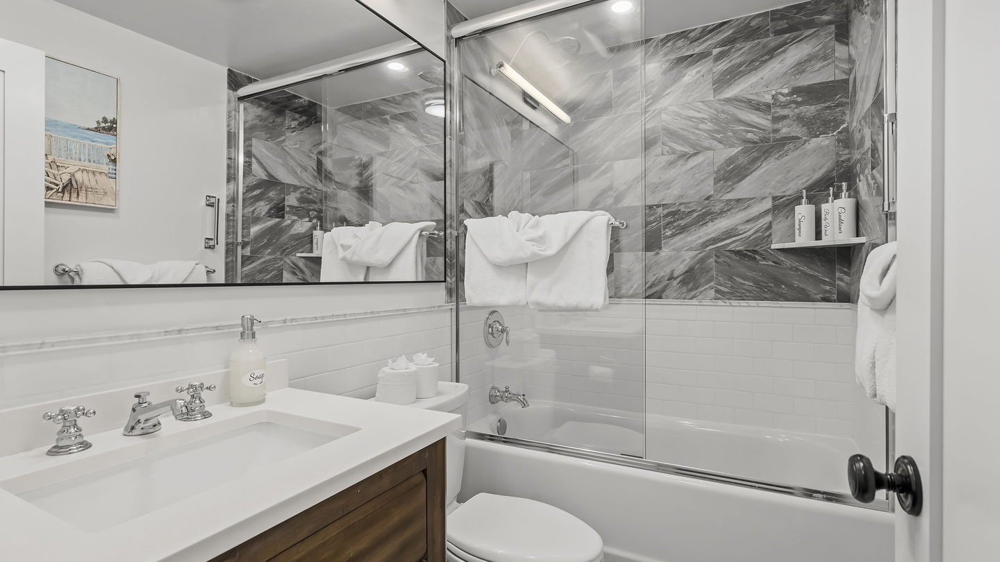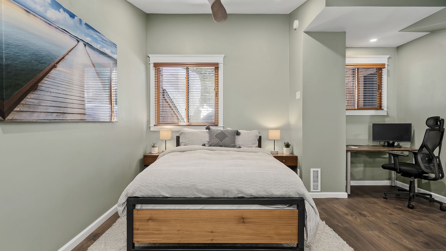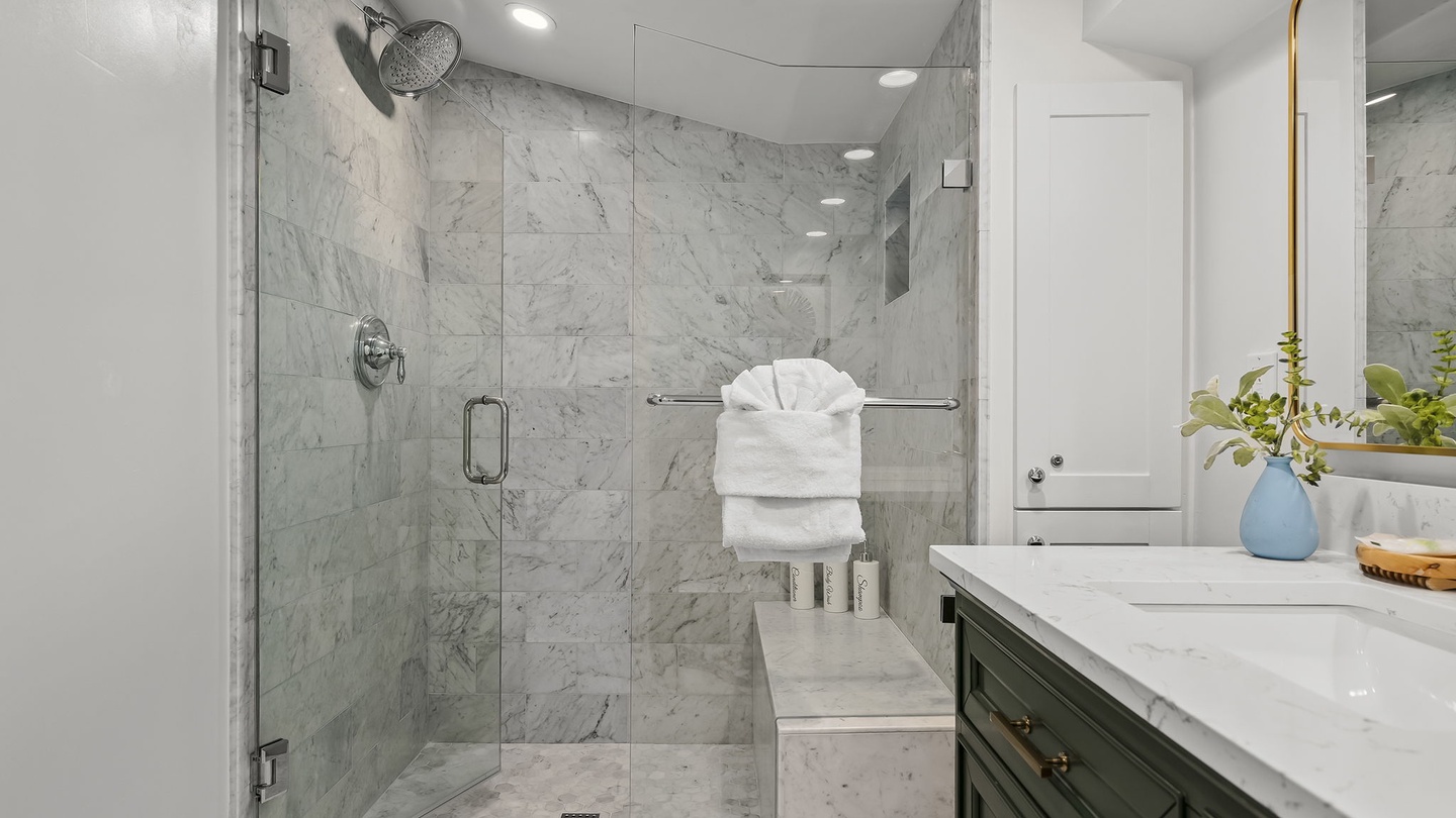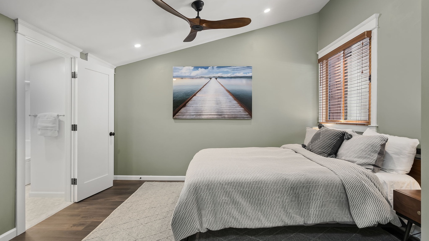 The primary suite on the upper floor features a comfortable queen bed, soft, high-end linens, a bright and calming neutral color scheme, and minimalist decor. A flat-screen TV and office area make this space a perfect retreat from the rest of the house where you can watch a movie, get some work done, or send a few emails in privacy. The large ensuite bathroom boasts a marble walk-in shower, providing a relaxing space to unwind after a day of outdoor activities.