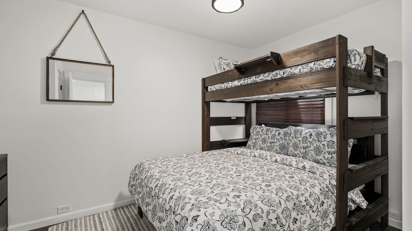 The bedroom on this floor features staggered bunks with a queen bed below and a twin bed above, a configuration that can easily accommodate a couple, teens, or young adults! A flatscreen TV is perfect for entertaining kids and the beautiful linens on the beds are cozy and perfect for everyone to get lots of sleep. The shared four-piece bathroom is large with plenty of space.Â