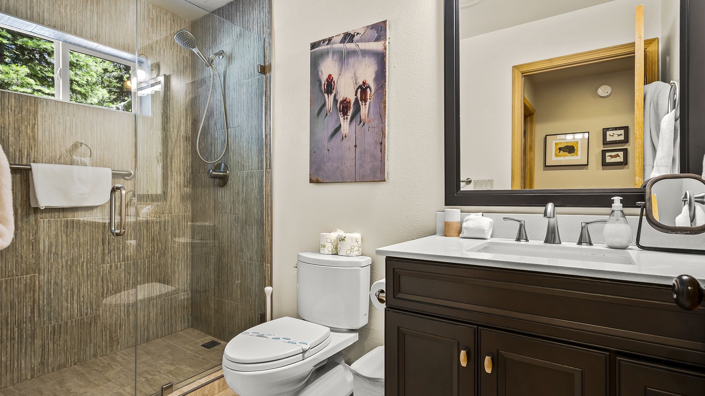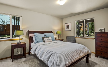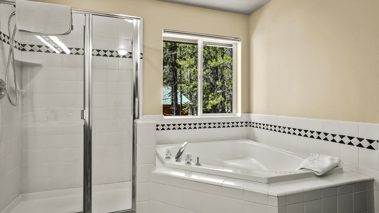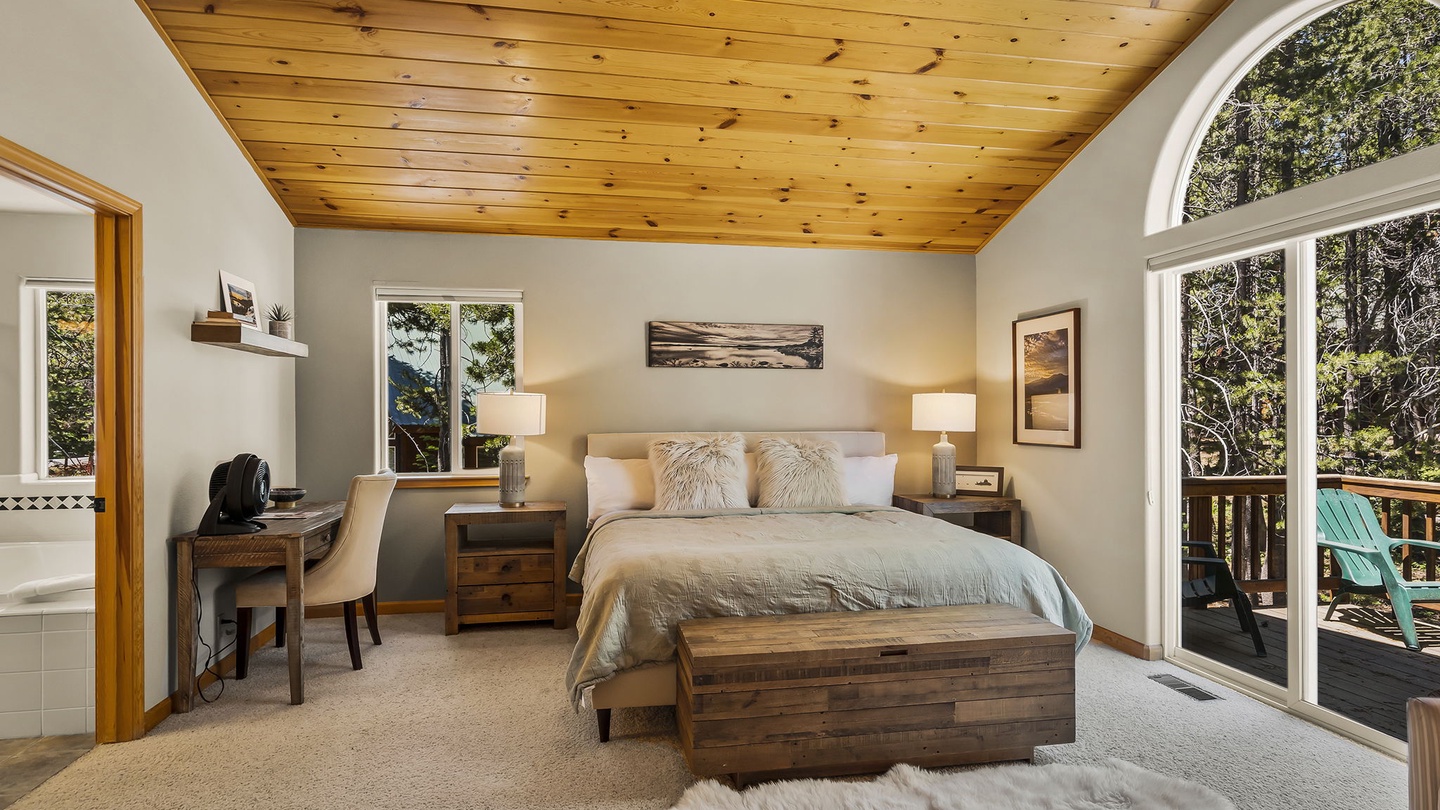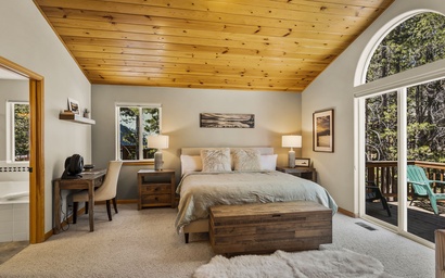 The lodge's second level houses the beautiful and spacious primary bedroom, furnished with a comfortable king-sized bed and offers a private patio and large spa ensuite. With soft linens, high ceilings, a deep soaker tub, and a separate walk-in shower, this suite is a retreat away from the rest of the home and provides the perfect place to unwind after a long day exploring Tahoe Donner!Â