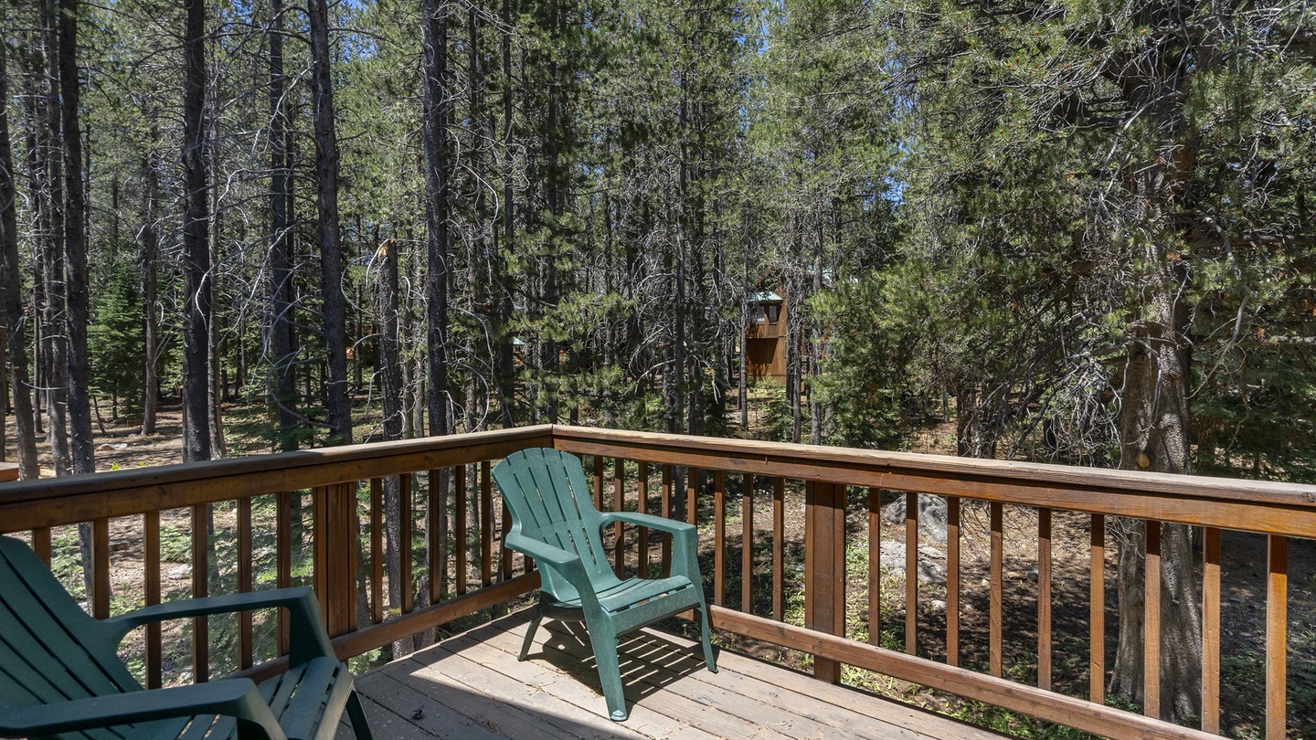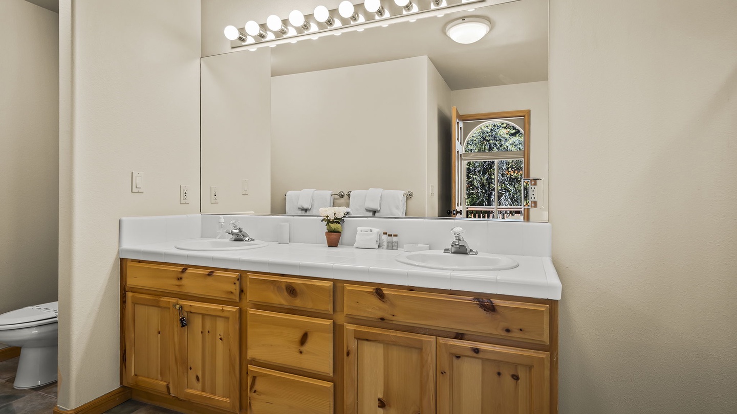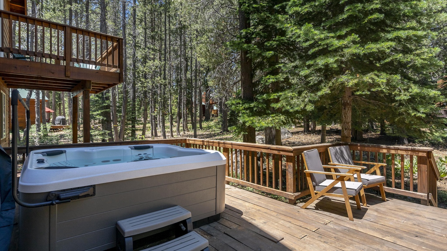 The lodge's second level houses the beautiful and spacious primary bedroom, furnished with a comfortable king-sized bed and offers a private patio and large spa ensuite. With soft linens, high ceilings, a deep soaker tub, and a separate walk-in shower, this suite is a retreat away from the rest of the home and provides the perfect place to unwind after a long day exploring Tahoe Donner!Â