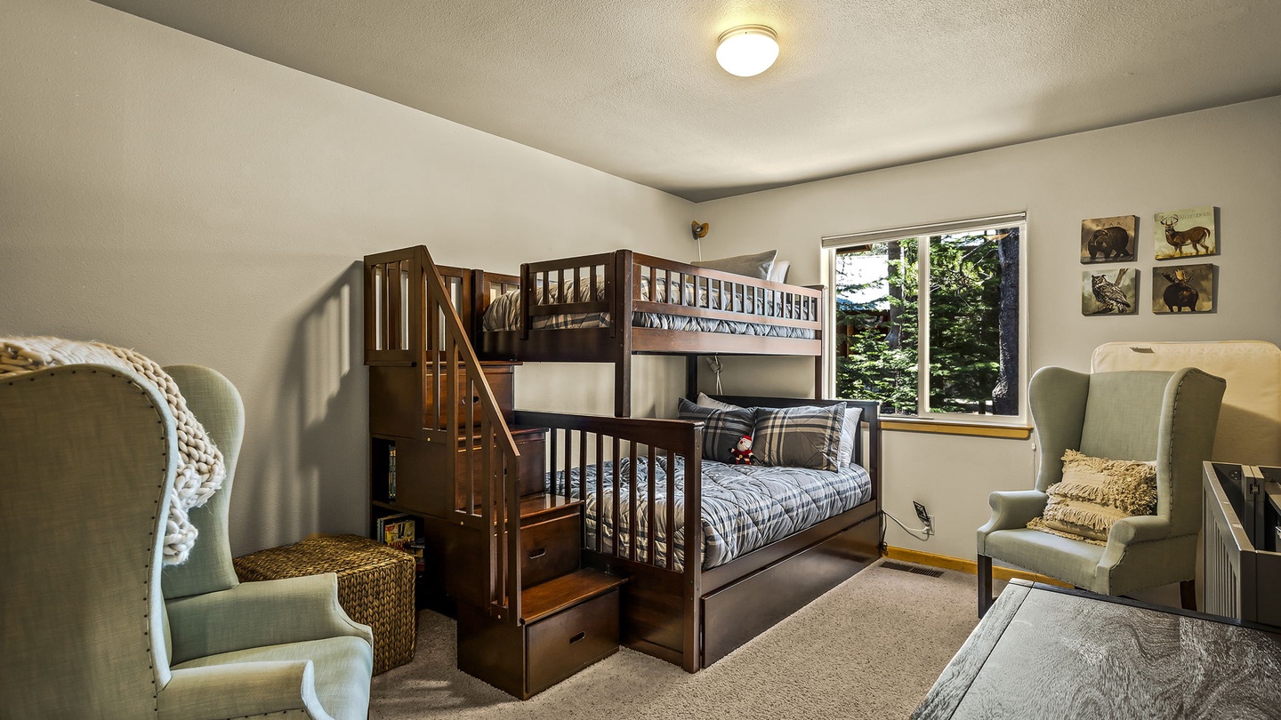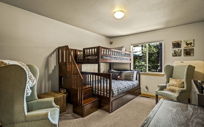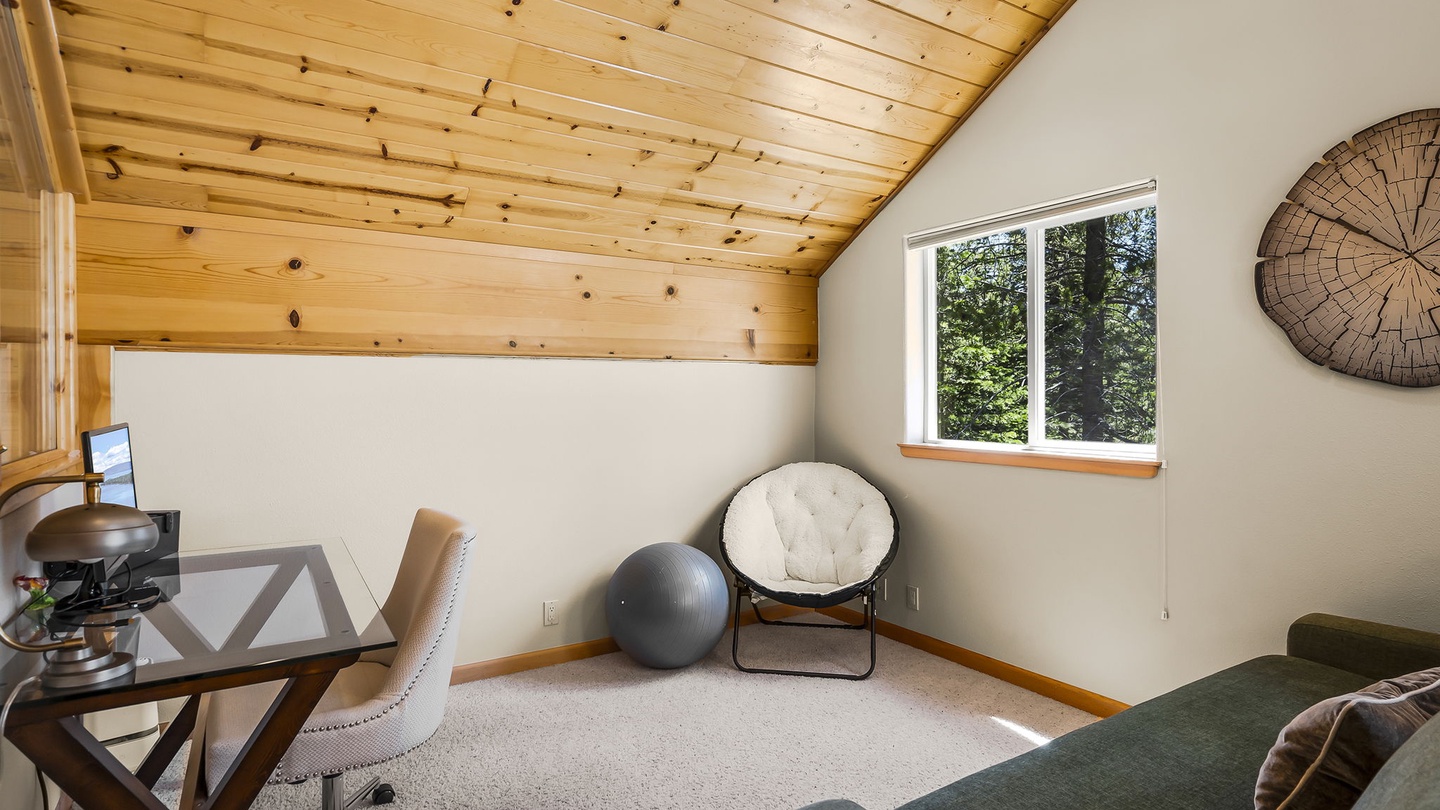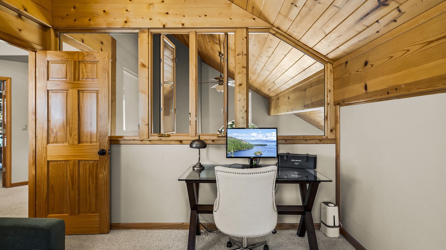 With a neatly designed den and office area upstairs, this home provides guests with a quiet space to send emails or catch up on work quickly so you can join the family on your favorite Tahoe activities!