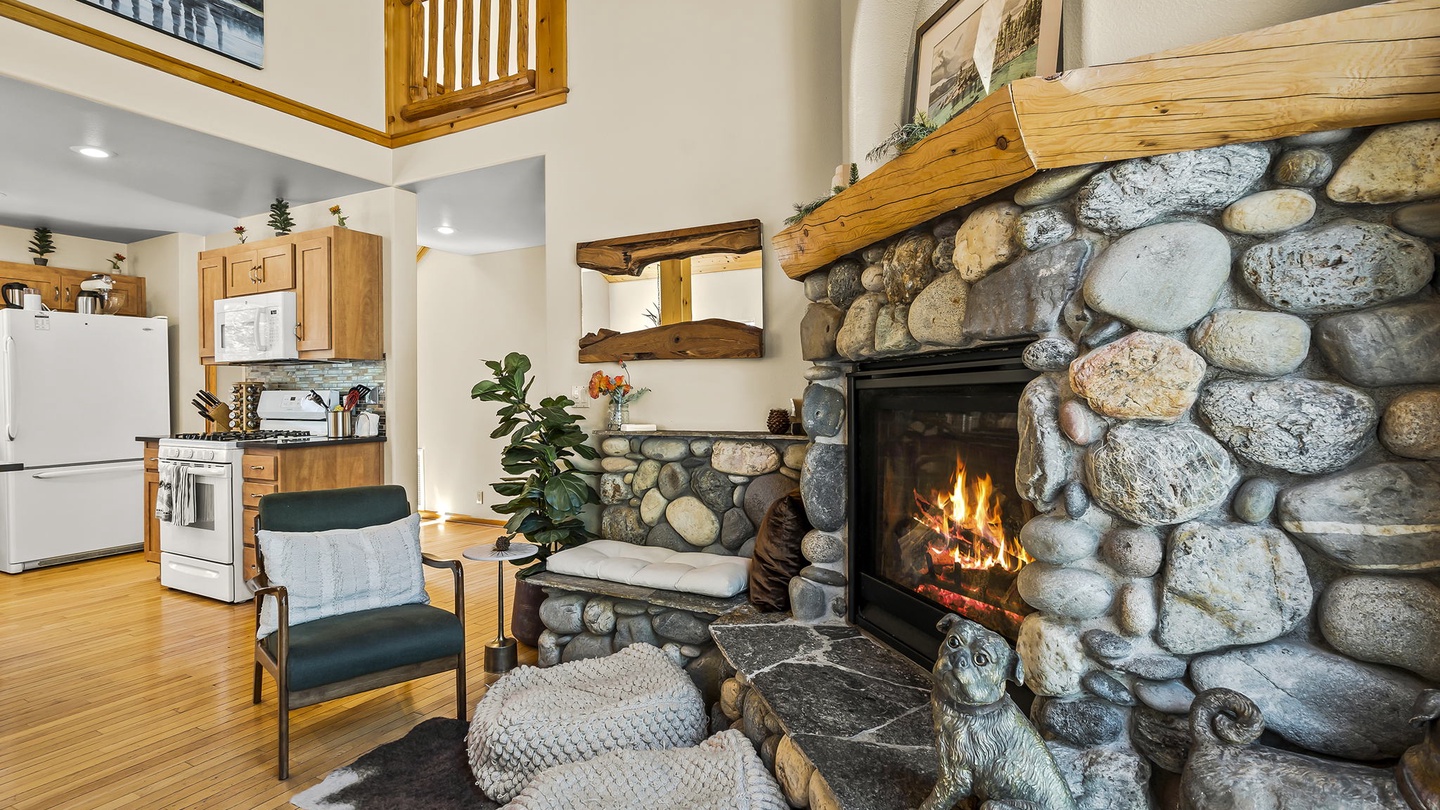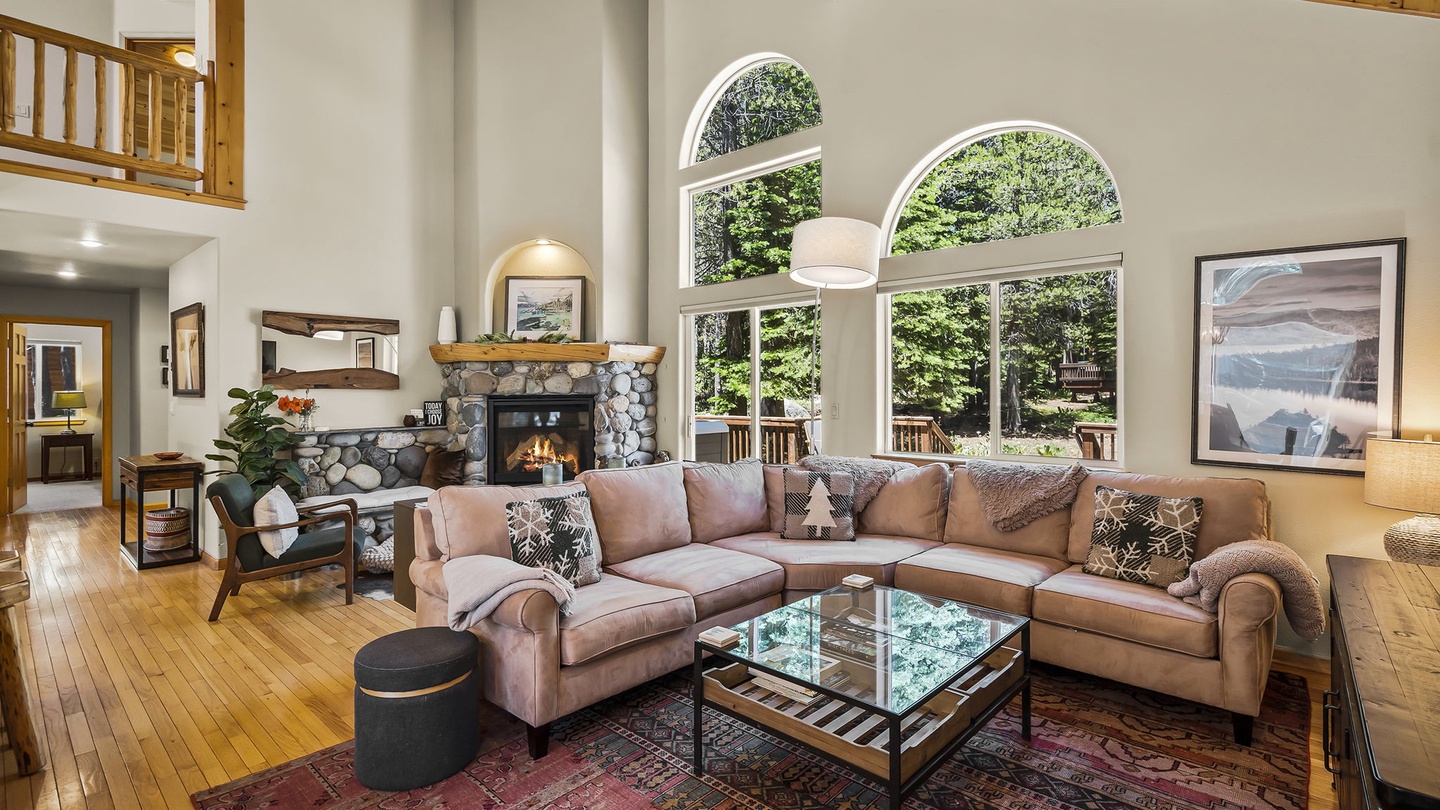The comfortable living room is furnished with a large, curved sectional that offers plenty of seating for everyone making this room ideal for family movie nights. With a large, natural rock fireplace, this living room is a cozy space to spend cozy evenings together!Â
