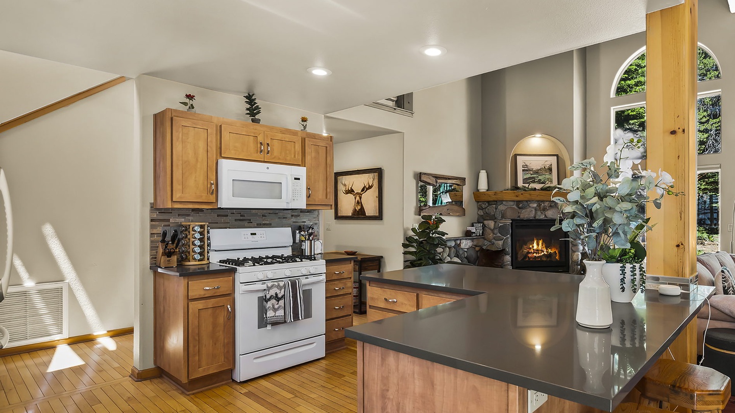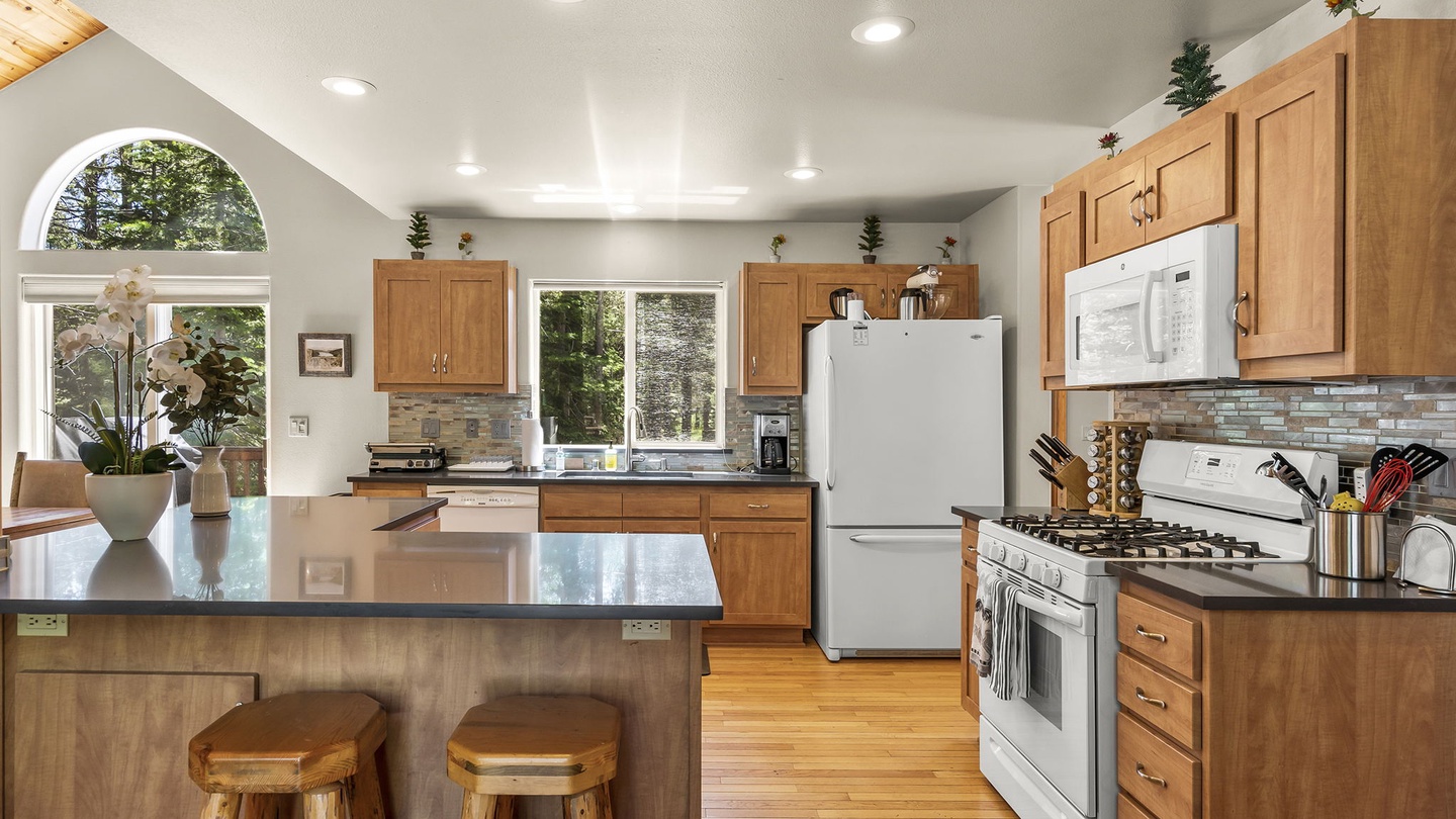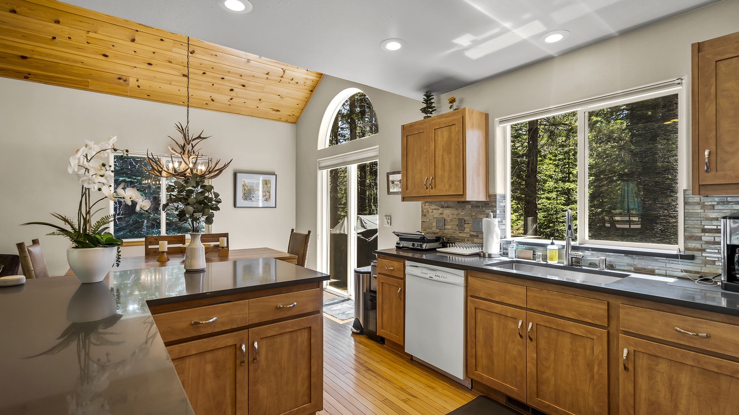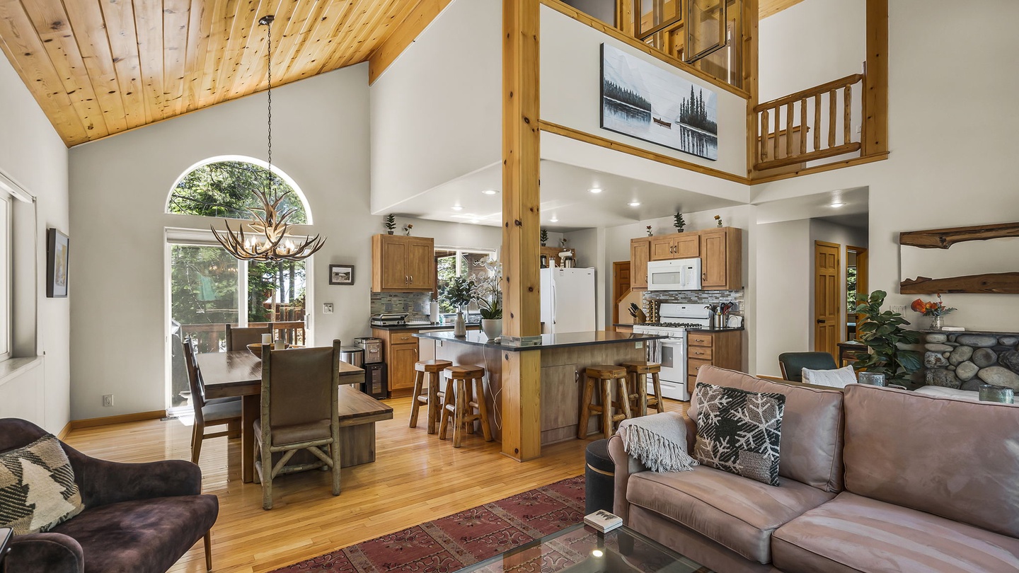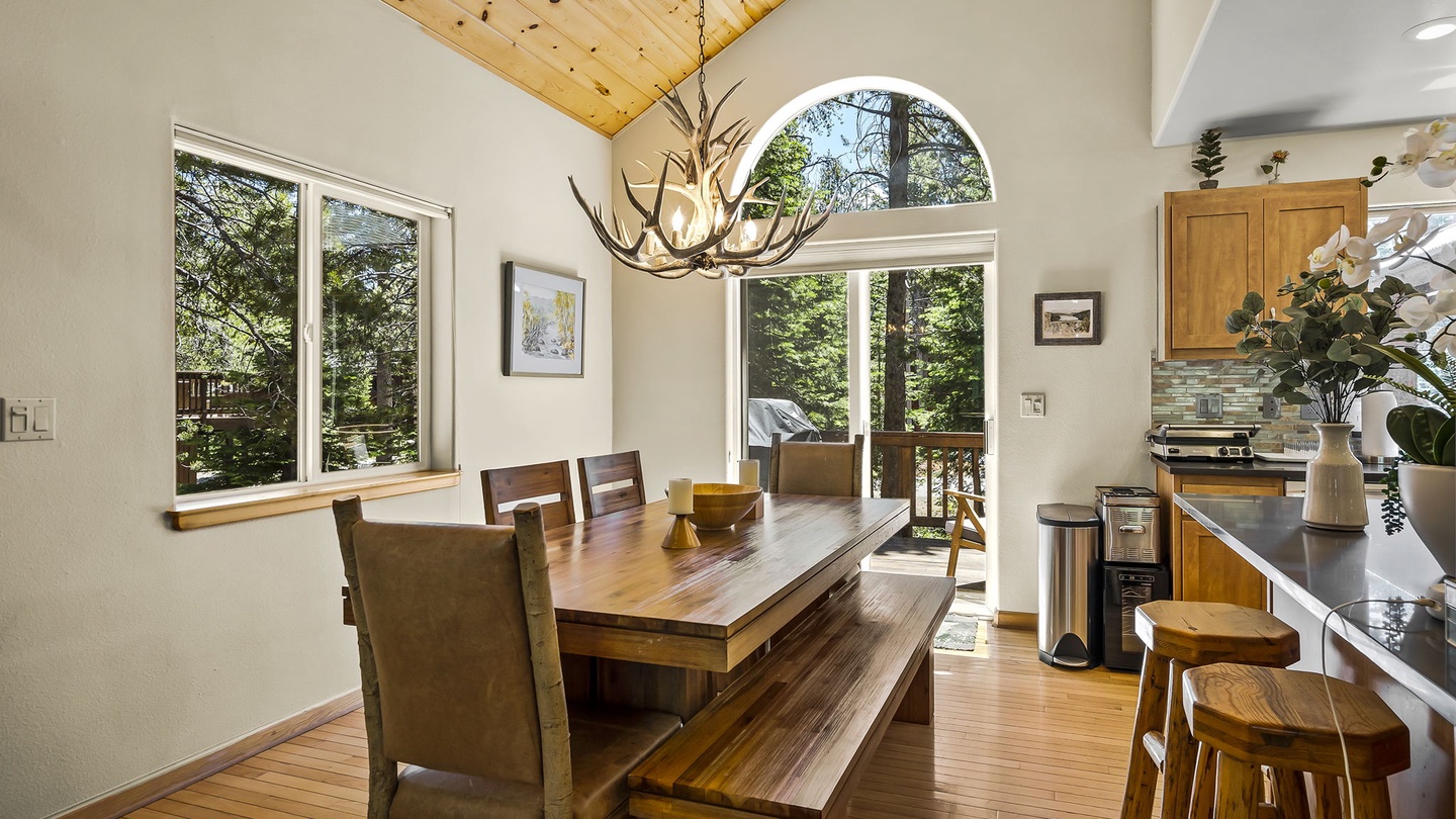 The bright kitchen offers deep counters and modern appliances for easy meal prep and overlooks the living room and dining room so everyone can spend time together no matter where they are. In the adjoining dining area, there is a large farmhouse table with a unique antler chandelier, perfect for sit-down dinners.Â