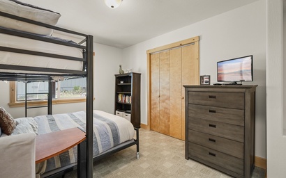 Kids will love the bunk-bed guest bedroom, featuring a double bed on the bottom and a twin bed on top. With plenty of space to play and a small desk for drawing, this room becomes a haven for young adventurers. It's the perfect spot for kids to hang out and create lasting memories.