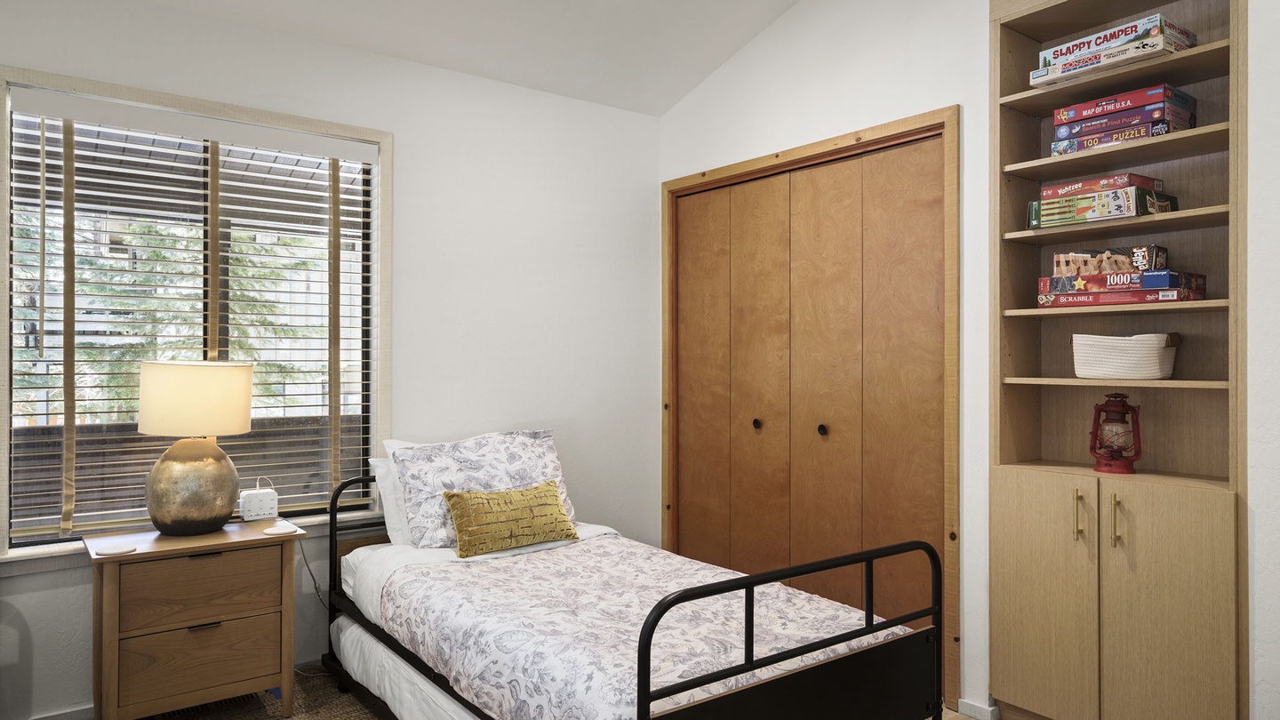 The second bedroom is designed with kids in mind, offering two twin beds and a fun selection of games.