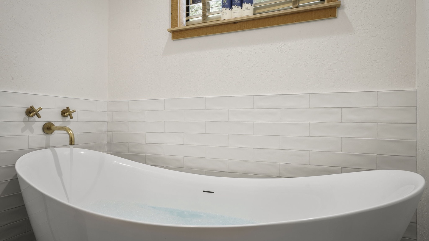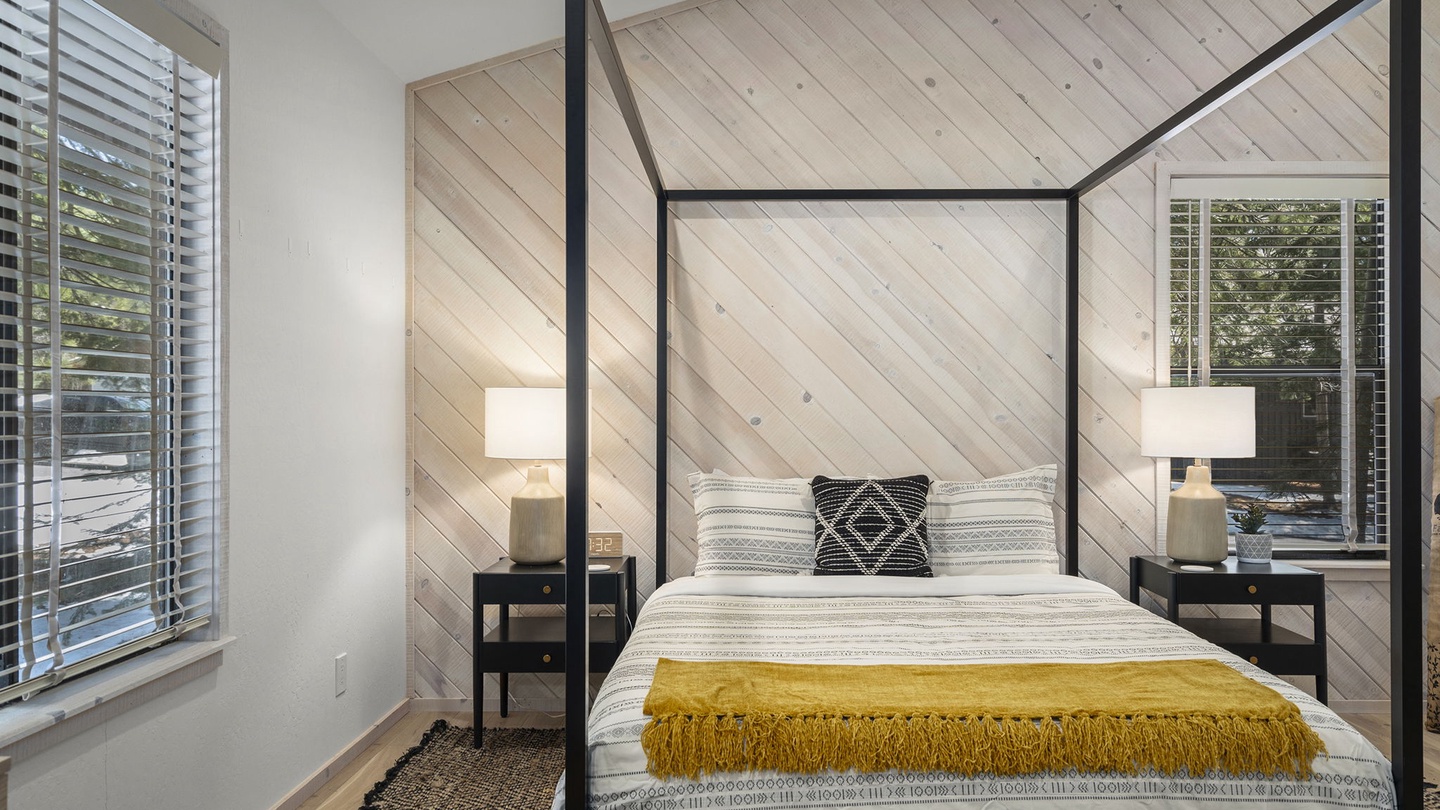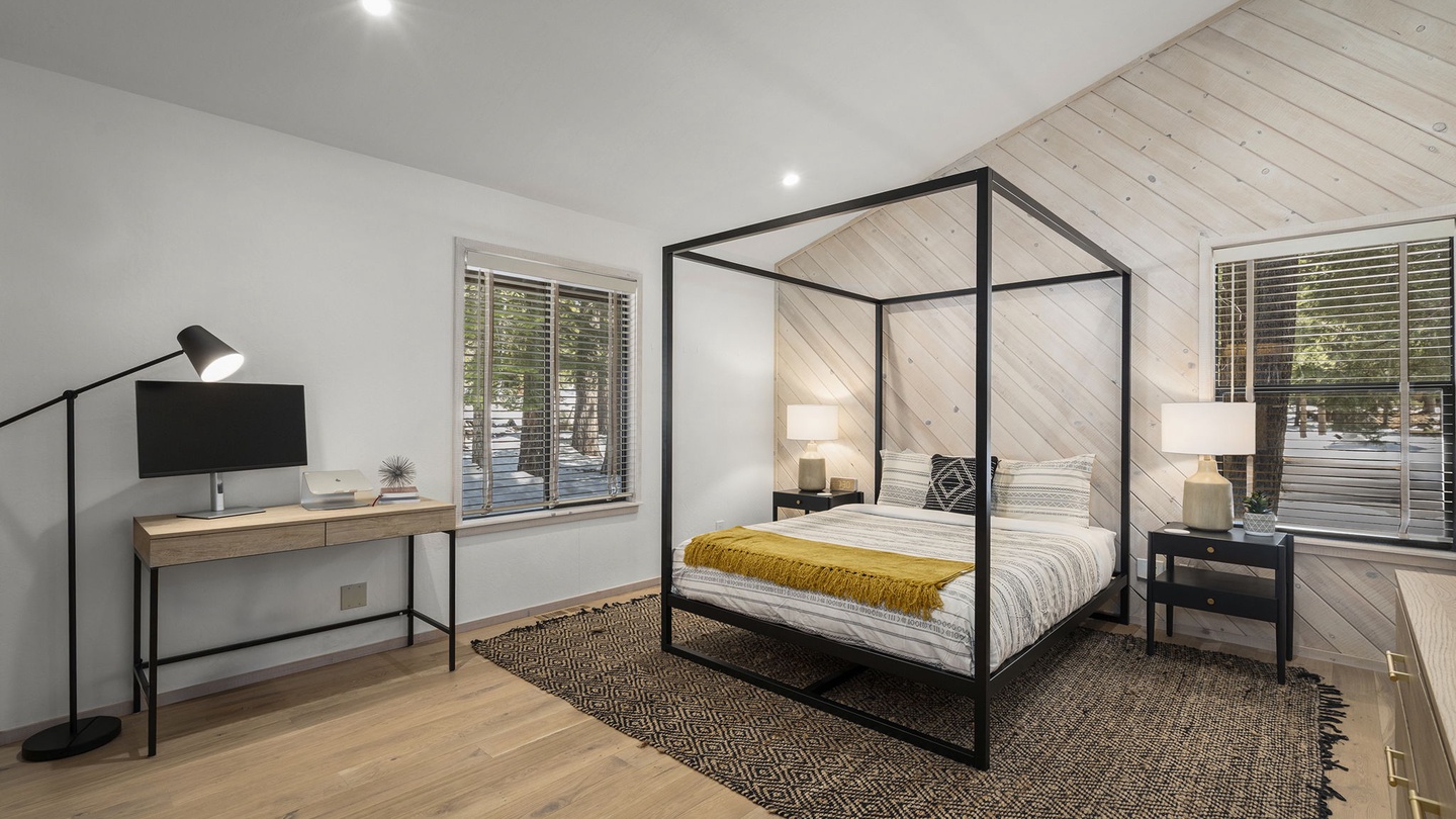 The primary suite features a plush queen bed and a spa-style en-suite bathroom with a deep soaking tub—perfect for unwinding after a day on the trails or slopes.