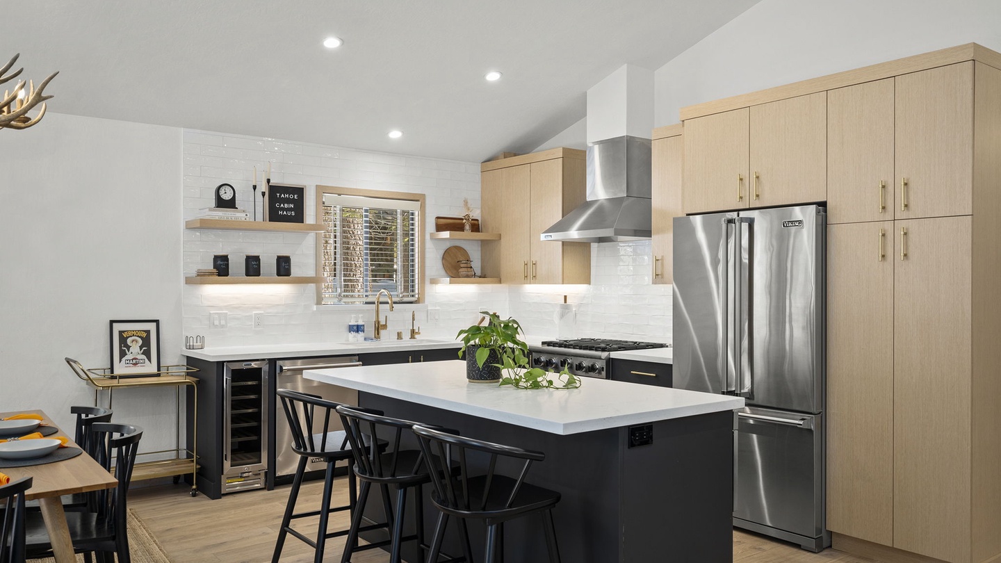 The fully remodeled kitchen is a dream for foodies, featuring modern cabinetry, sleek countertops, stainless steel appliances, and a built-in wine fridge.