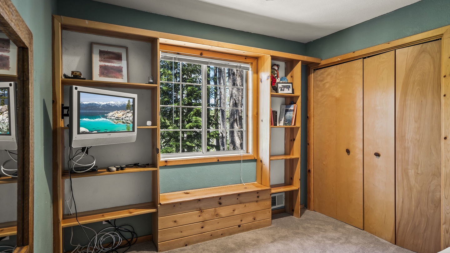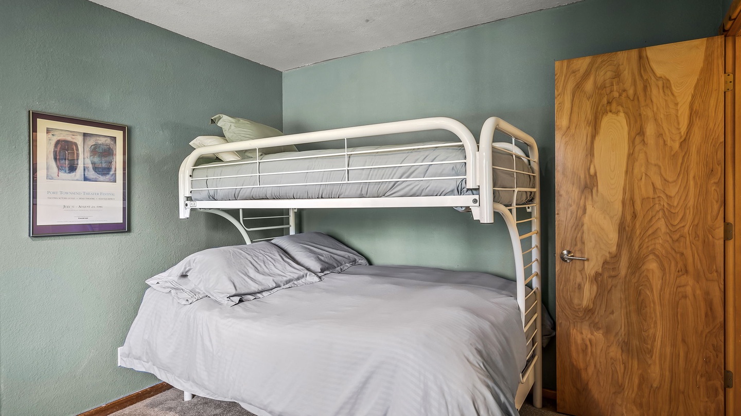 The bunk bed guest room features a double bed on the bottom and a twin bed on top, with a flat-screen TV and built-in shelving around the window. This room is perfect for kids who will love the bunk beds and offers a perfect place for them to play or enjoy cartoon mornings so you can sleep in.