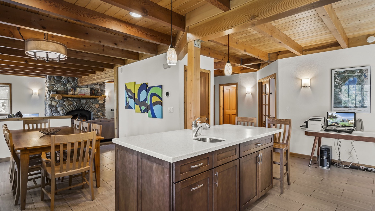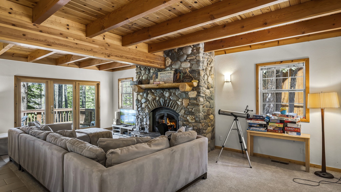 The living room is the ideal family room, spacious and airy, with comfortable couches, lots of games, and a stunning river rock fireplace. Sink into the plush furniture and enjoy cozy family nights together by the fire.Â