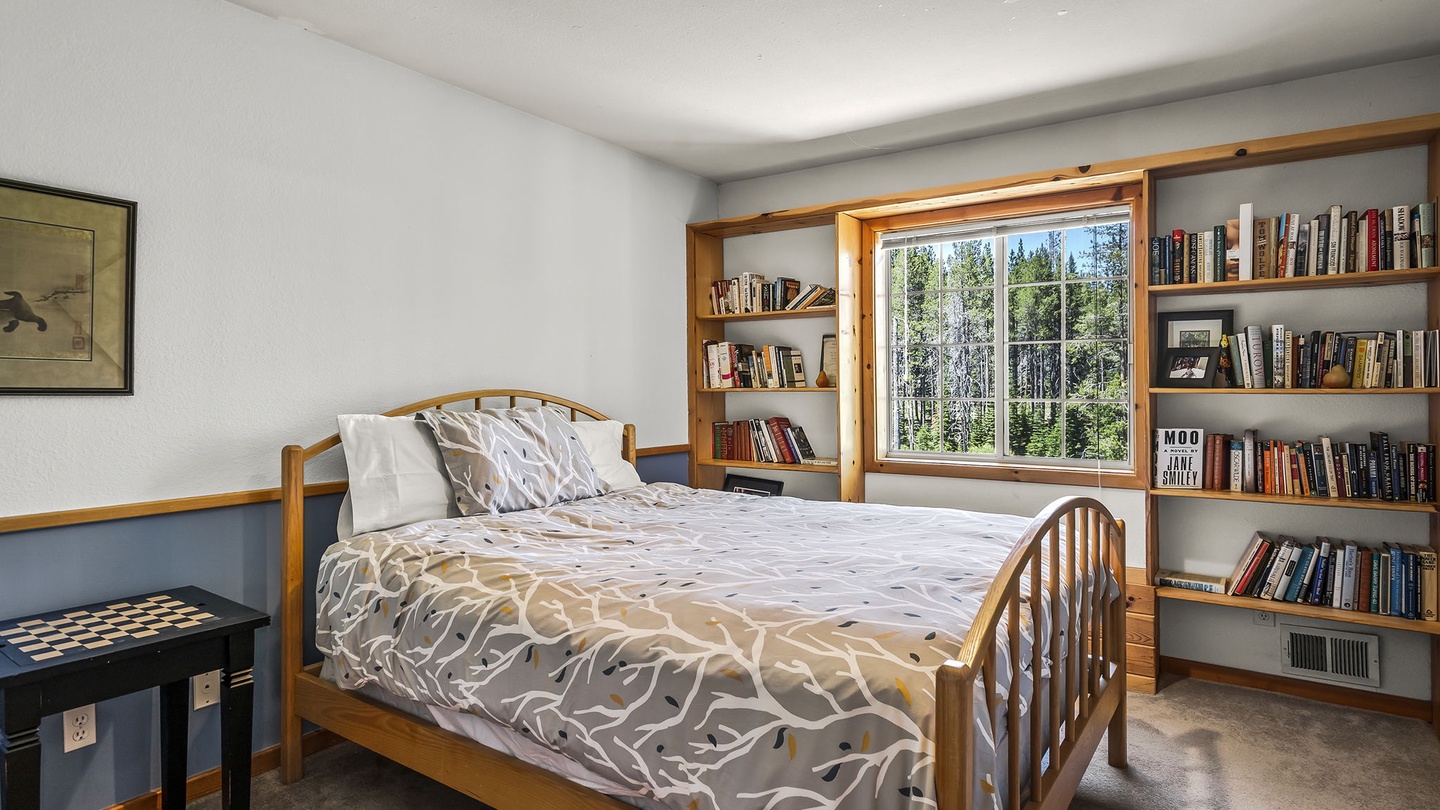 The queen guest room is a bright space with a queen bed and built-in shelving, providing a calming space for relaxing and getting lots of quality rest during your stay. The tasteful decor and stunning views out the window make this room a perfect spot to recharge.Â