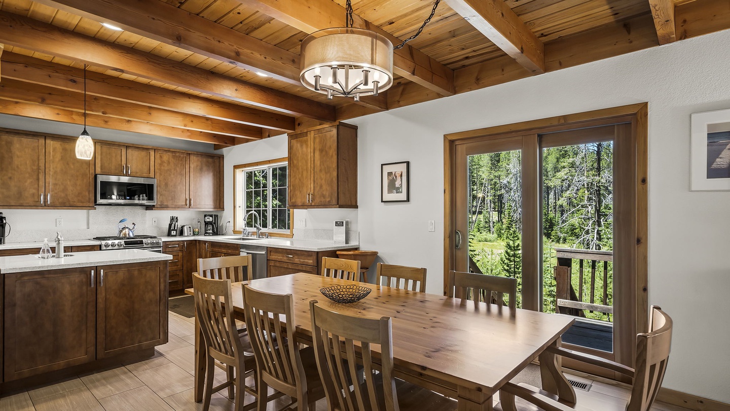 The main floor of this beautiful cabin features a spacious kitchen, dining room, large living room, powder room, and deck.Â