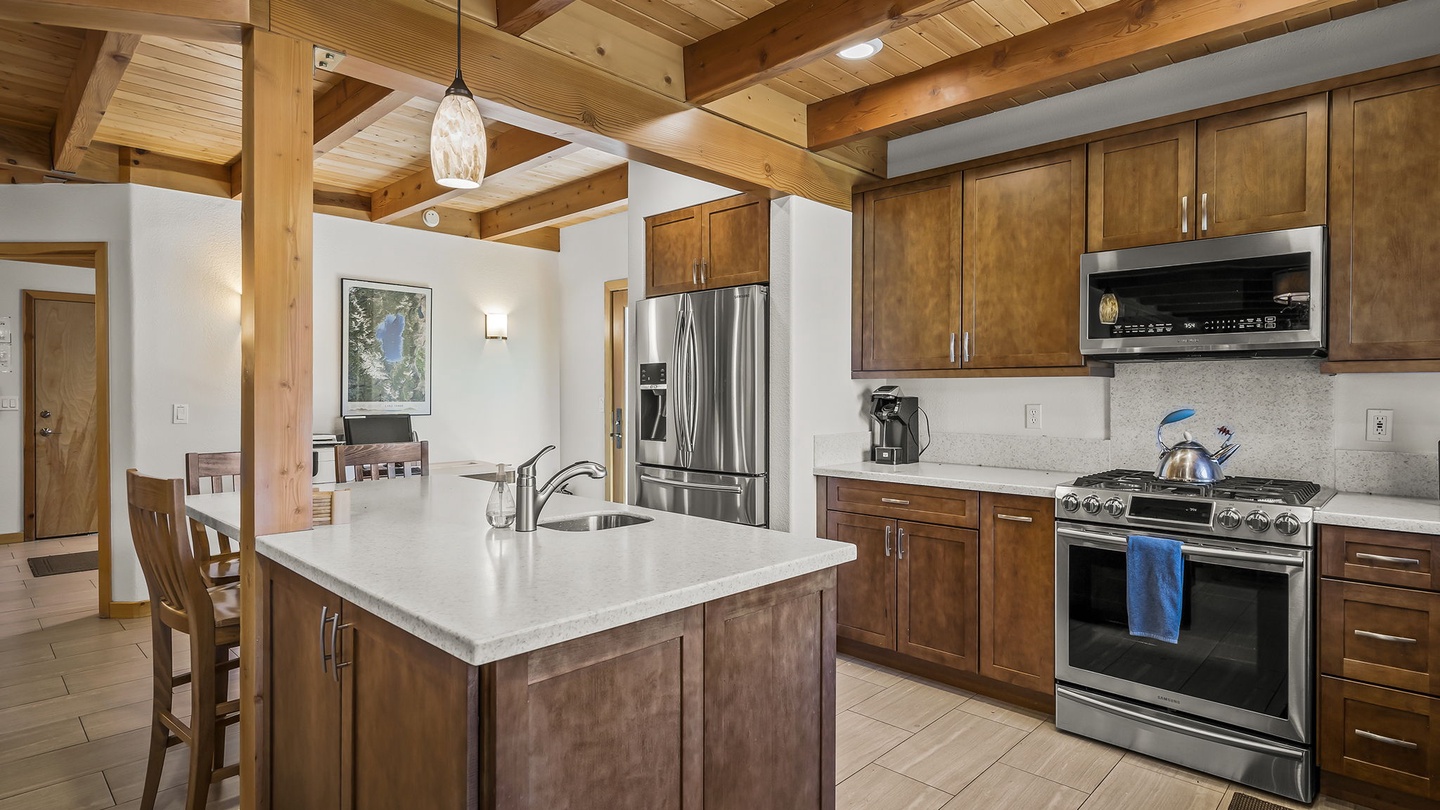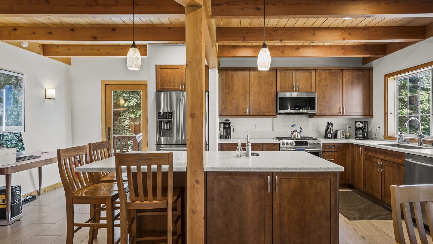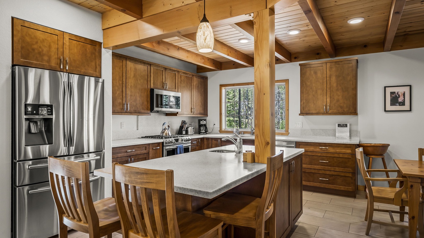 The kitchen is spacious and bright, with sleek wood cabinets that reflect the natural surroundings, lots of counter space, and large windows that flood the room with light. The fully stocked cabinets, top-of-the-line appliances, including a gas range for cooking, make it easy to whip up all your favorite meals from light lunches to full, roast family meals. In this kitchen, you can gather around the large island that provides lots of seating, perfect for casual, quick breakfasts, snacks or just spending time together in the kitchen.