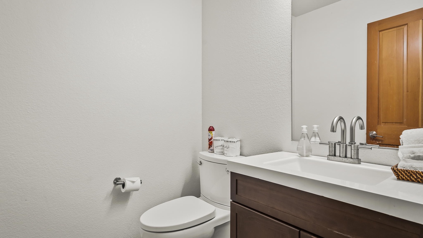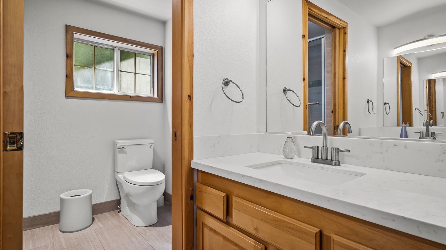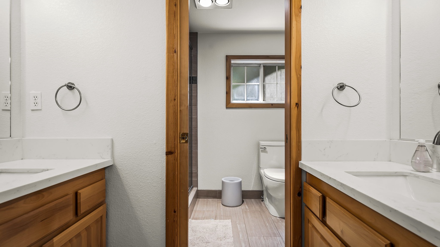 The shared bathroom on the upper floor features two vanities and a water closet with a walk-in shower, providing lots of space for everyone.