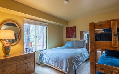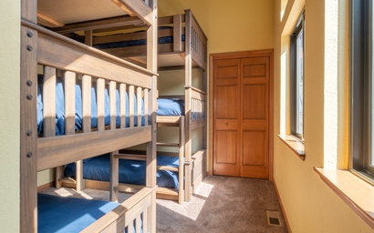 The upper floor of the Tahoe Donner Vacation Lodge features a second living room, with a large, comfortable sectional, a four-person table, and flatscreen TV. This space is perfect for family movie nights, playing cards, or just hanging out together. The large windows and peaked ceilings create a bright and inviting atmosphere, making it the perfect place to read or relax. This living room also leads to a fourth bedroom, featuring a six-bed bunk bedroom that kids will love.