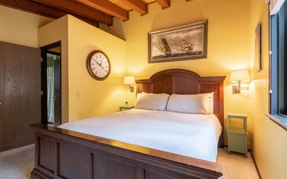 The primary suite is just off the main living spaces down a short hallway, offering a cozy and comfortable retreat from the rest of the home where you can curl up in the easy chair with a good book or catch a movie on the flat screen TV. Furnished with a comfortable king bed, views of the greenery outside, and a private four-piece ensuite, this quaint and cozy room is the perfect place to unwind and wake up feeling refreshed.Â