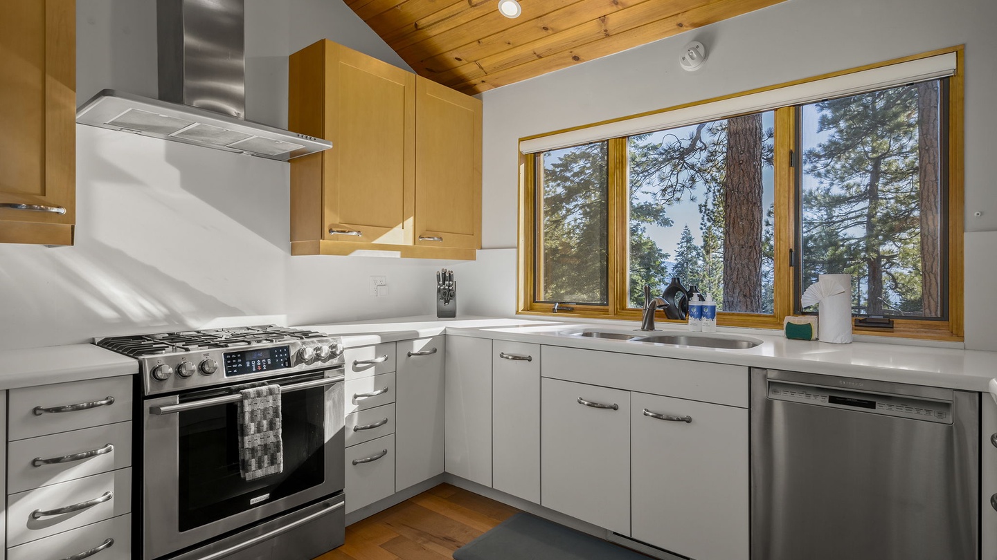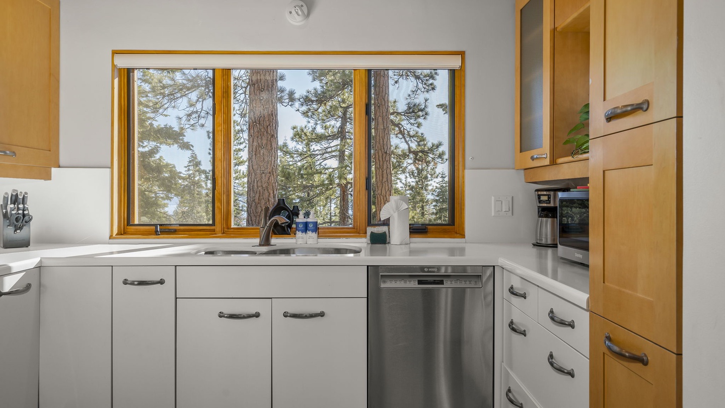 The dining area leads seamlessly into the modern kitchen, where culinary magic happens. Doing dishes here is a delight, thanks to a window that frames picture-perfect views of the forest and filtered glimpses of the lake beyond.