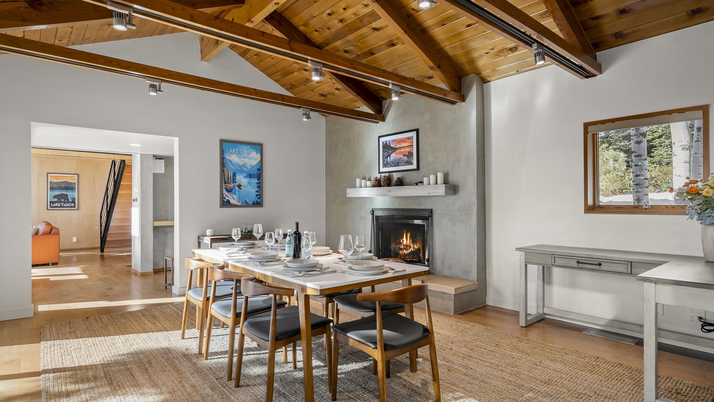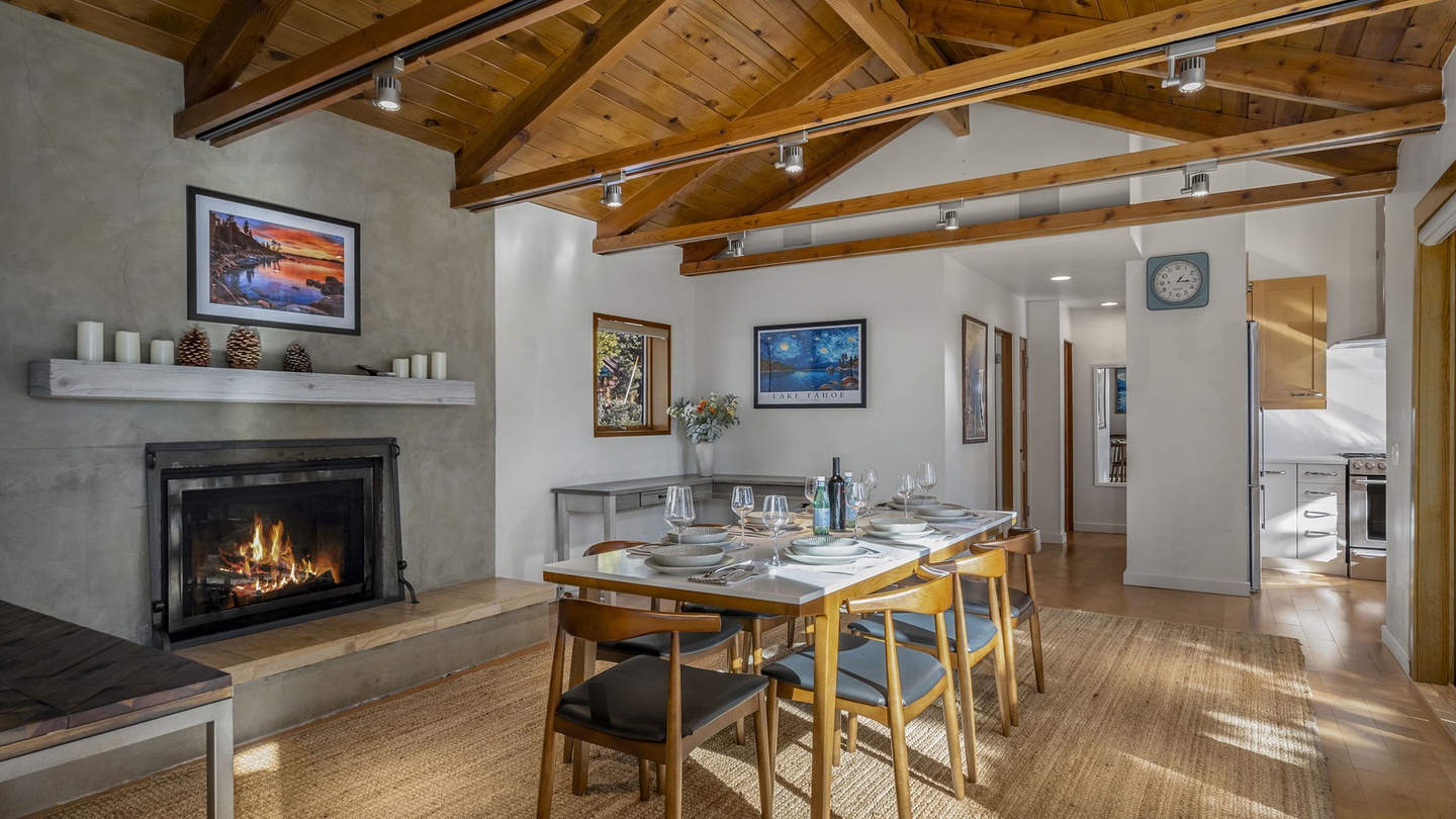 A fireplace is the heart of the room, casting a warm glow as you enjoy a meal at the table for eight.