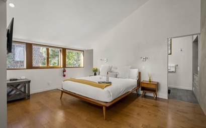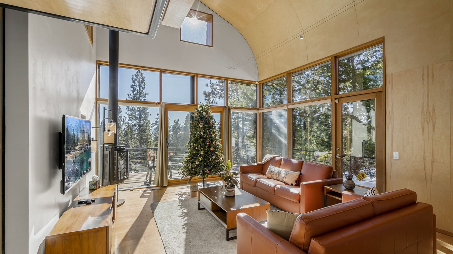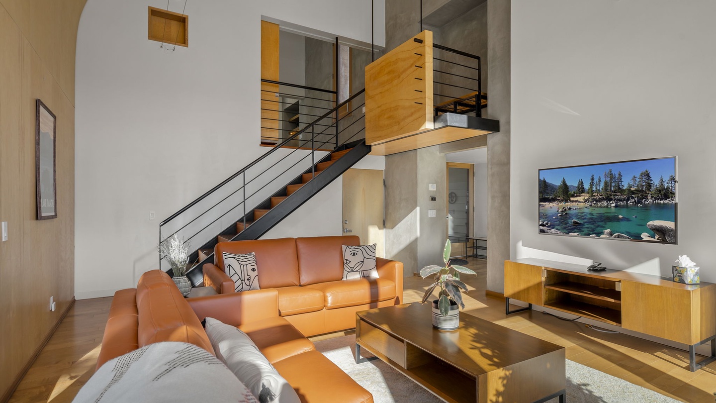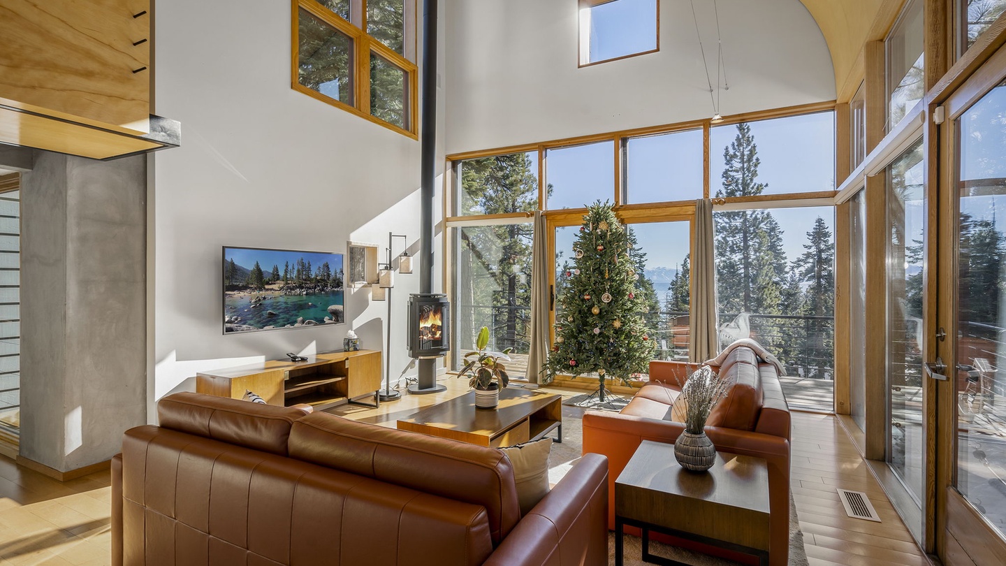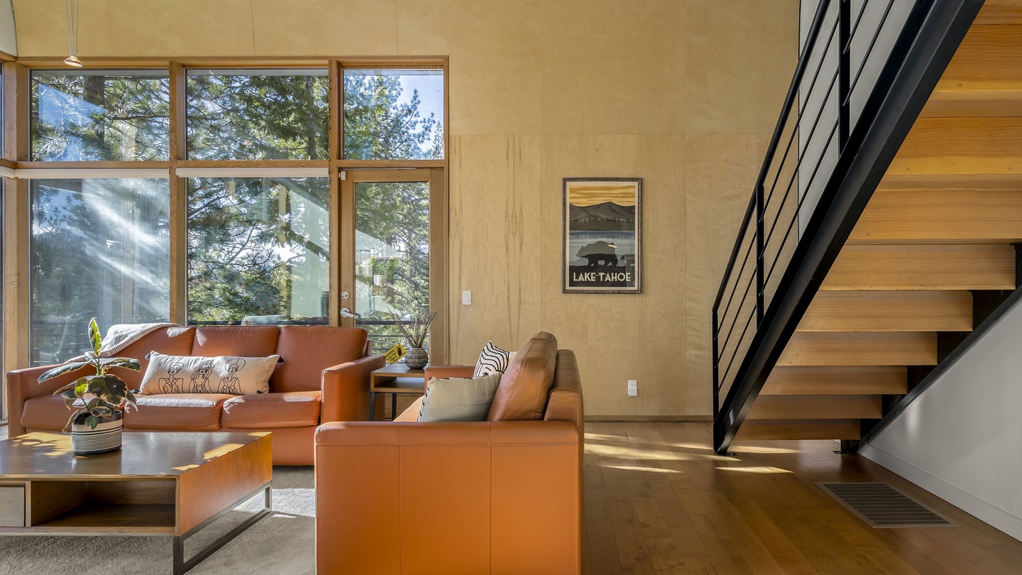 Step inside to a Great Room filled with natural light streaming through expansive floor-to-ceiling windows. The modern leather seating provides a cozy spot to relax while enjoying stunning views of the Tahoe landscape—or a movie night on the wall-mounted flat-screen TV. A stylish wood-burning stove adds an extra layer of warmth, perfect for chilly evenings after a day on the slopes.