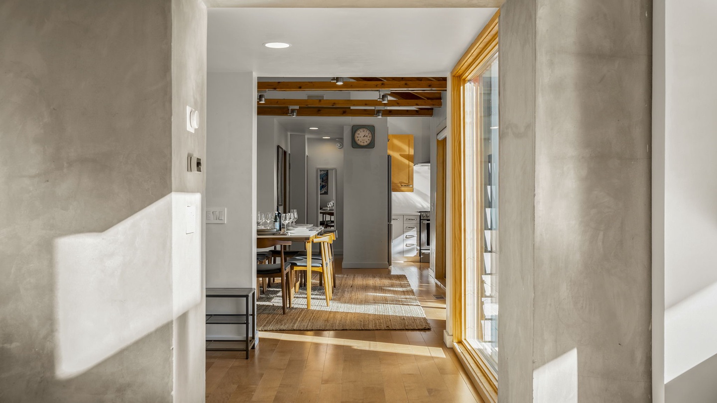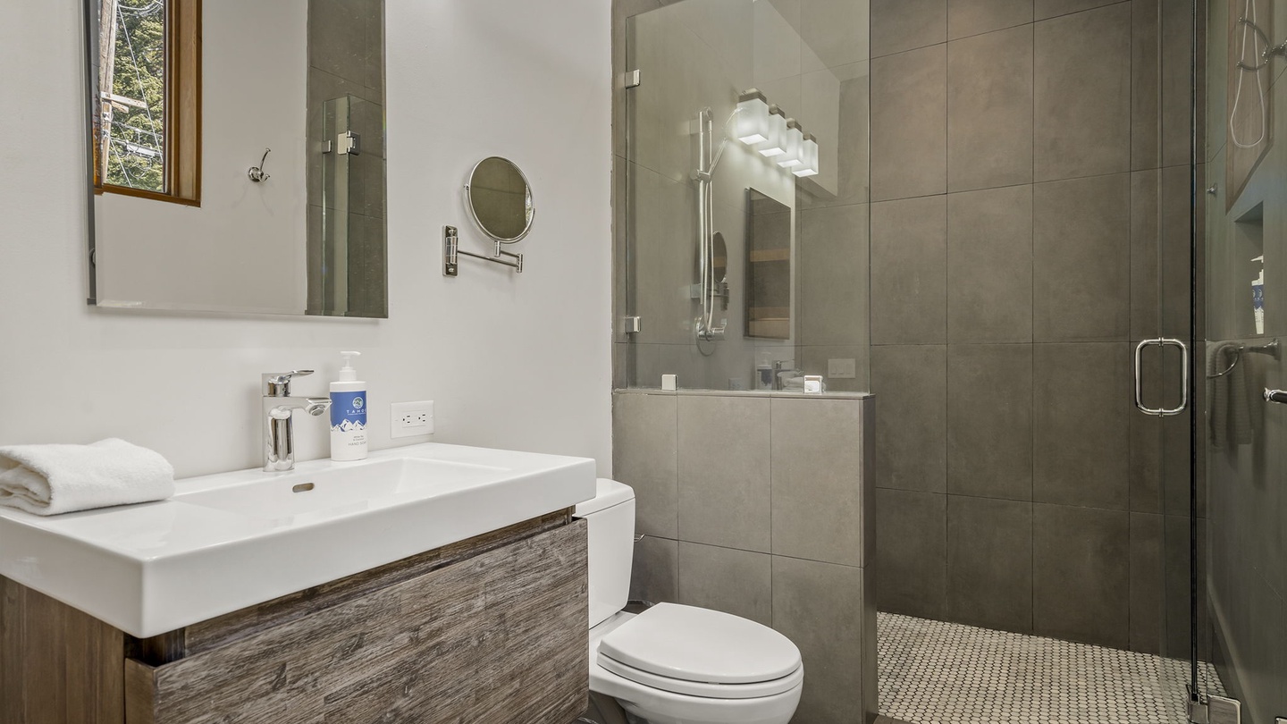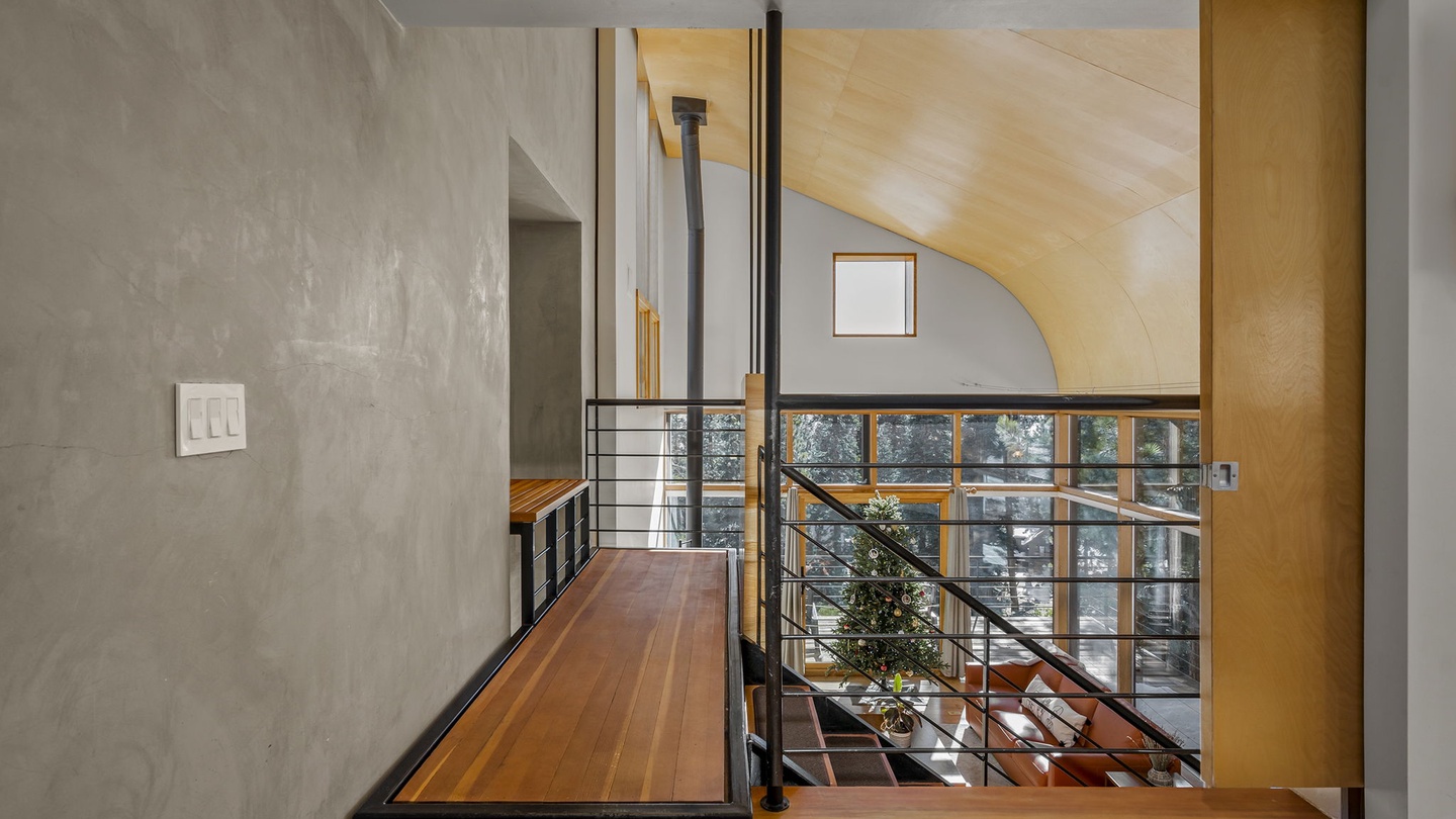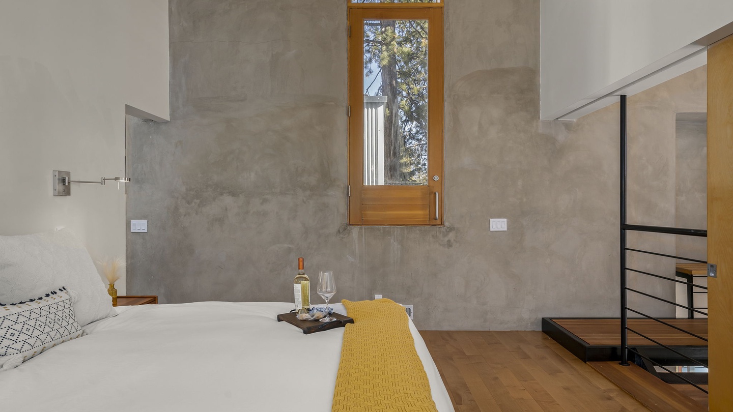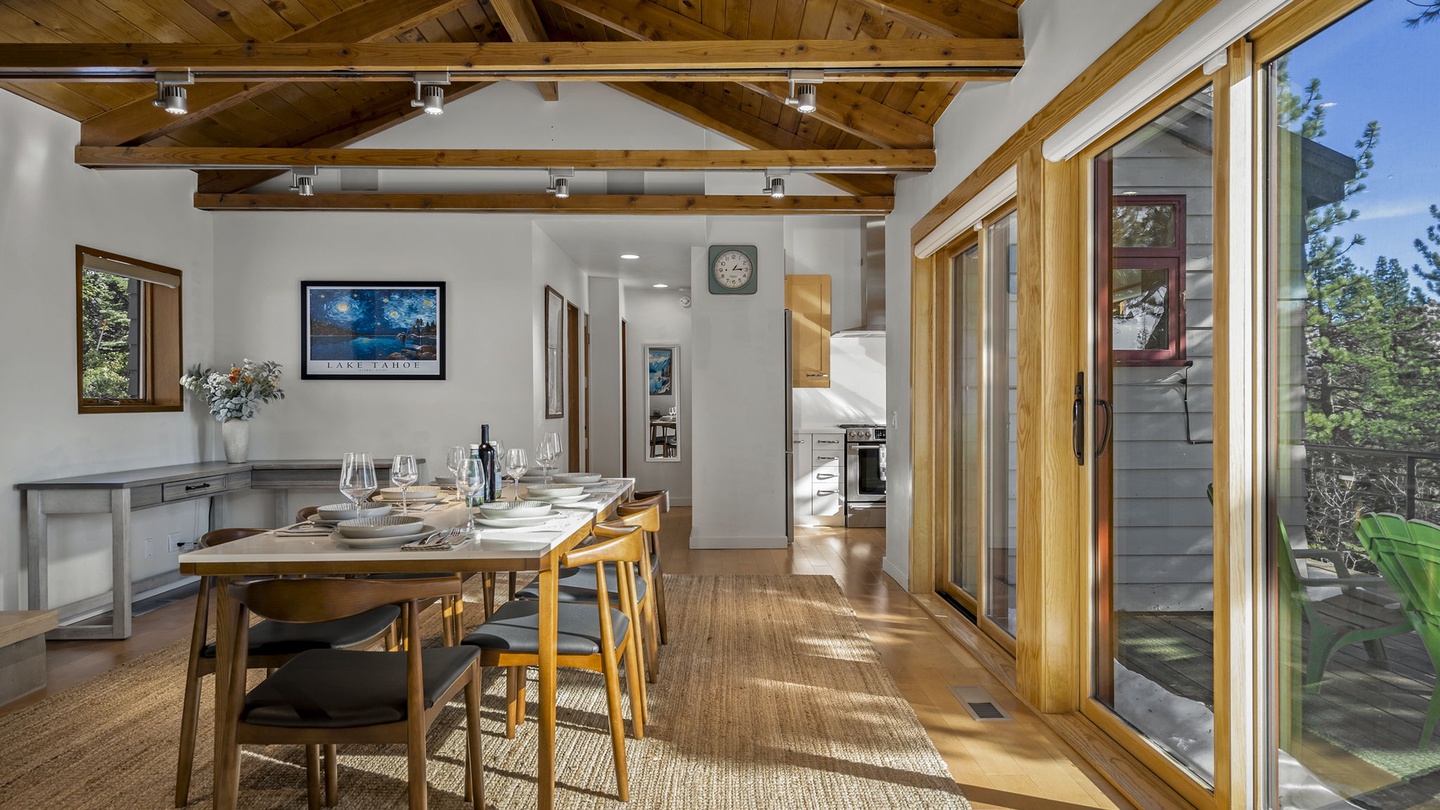 Step inside to a Great Room filled with natural light streaming through expansive floor-to-ceiling windows. The modern leather seating provides a cozy spot to relax while enjoying stunning views of the Tahoe landscape—or a movie night on the wall-mounted flat-screen TV. A stylish wood-burning stove adds an extra layer of warmth, perfect for chilly evenings after a day on the slopes.