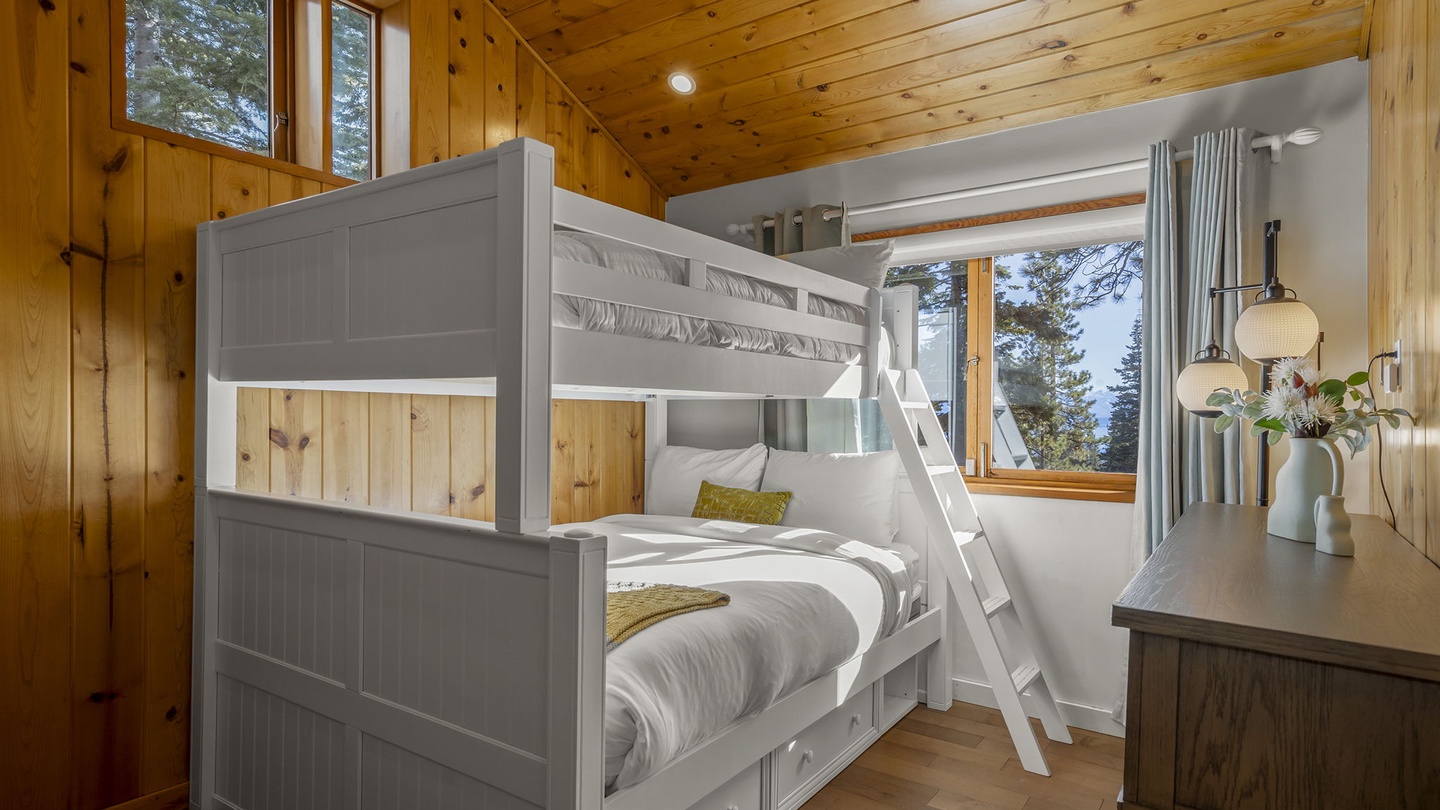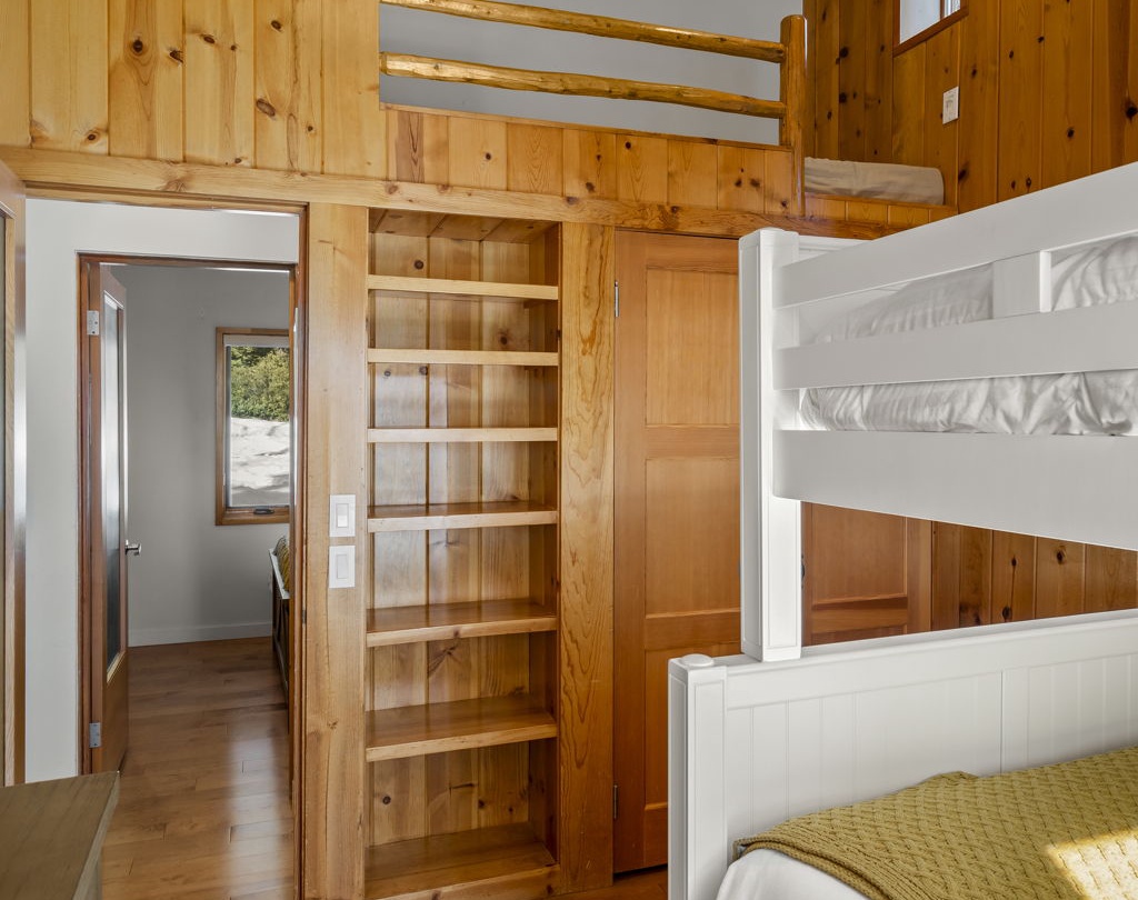 A bunk room featuring a double-over-queen bunk bed, ideal for families or groups, with charming wood-paneled walls adding a cabin-like touch.