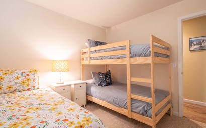 The primary suite features a comfortable queen bed, ample storage, and a five-piece ensuite with a double vanity, tub-and-shower combo, and water closet for added privacy. You'll feel right at home in this cozy and bright space and wake every morning feeling refreshed and ready for the day! The first guest bedroom features a comfortable queen bed and chic decor, offering a cozy space for a good night’s sleep. The second guest bedroom is perfect for kids, with twin beds and a twin-over-twin bunk bed, sure to keep the little ones comfortable during their stay.