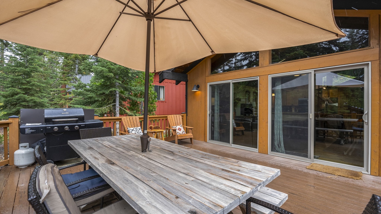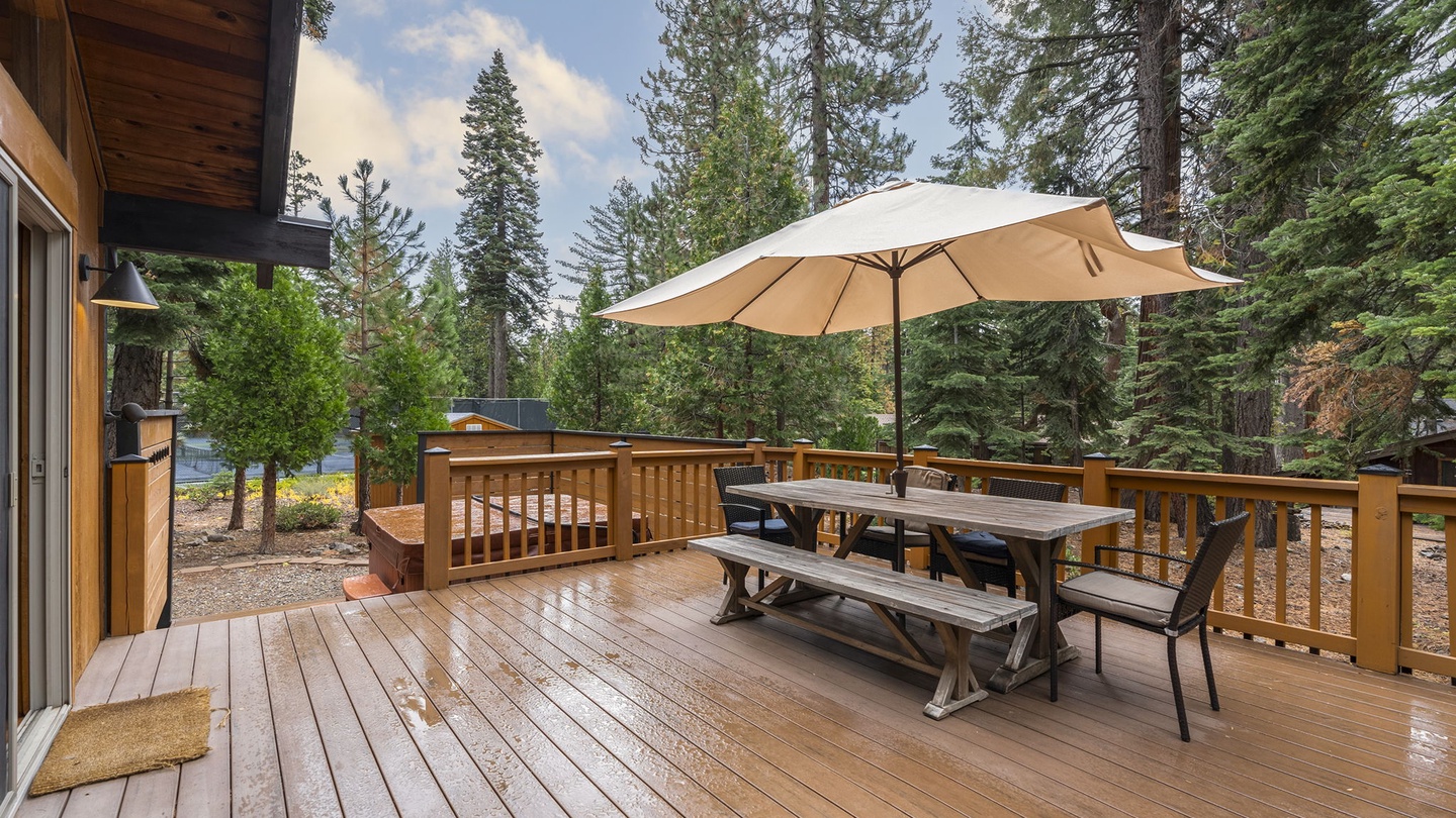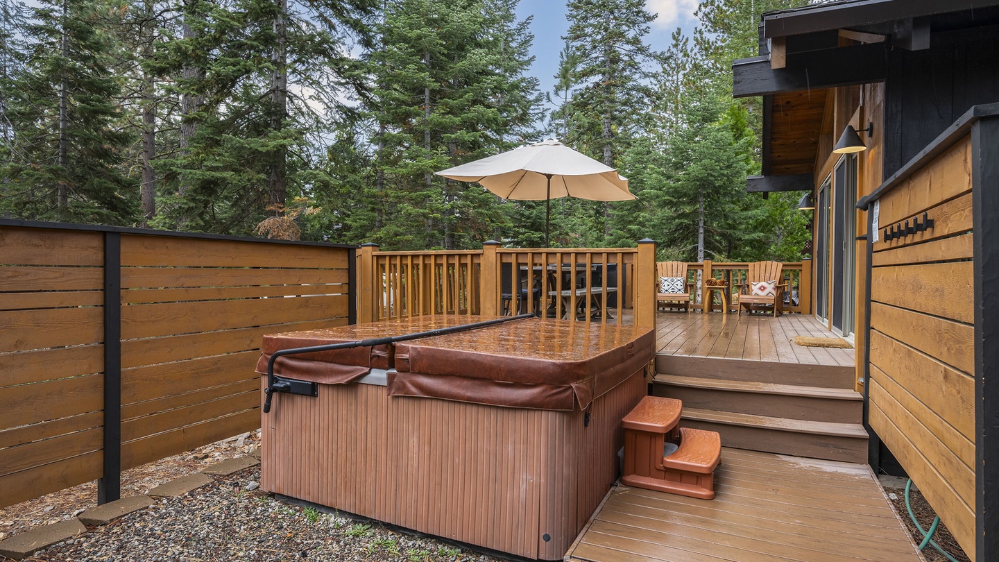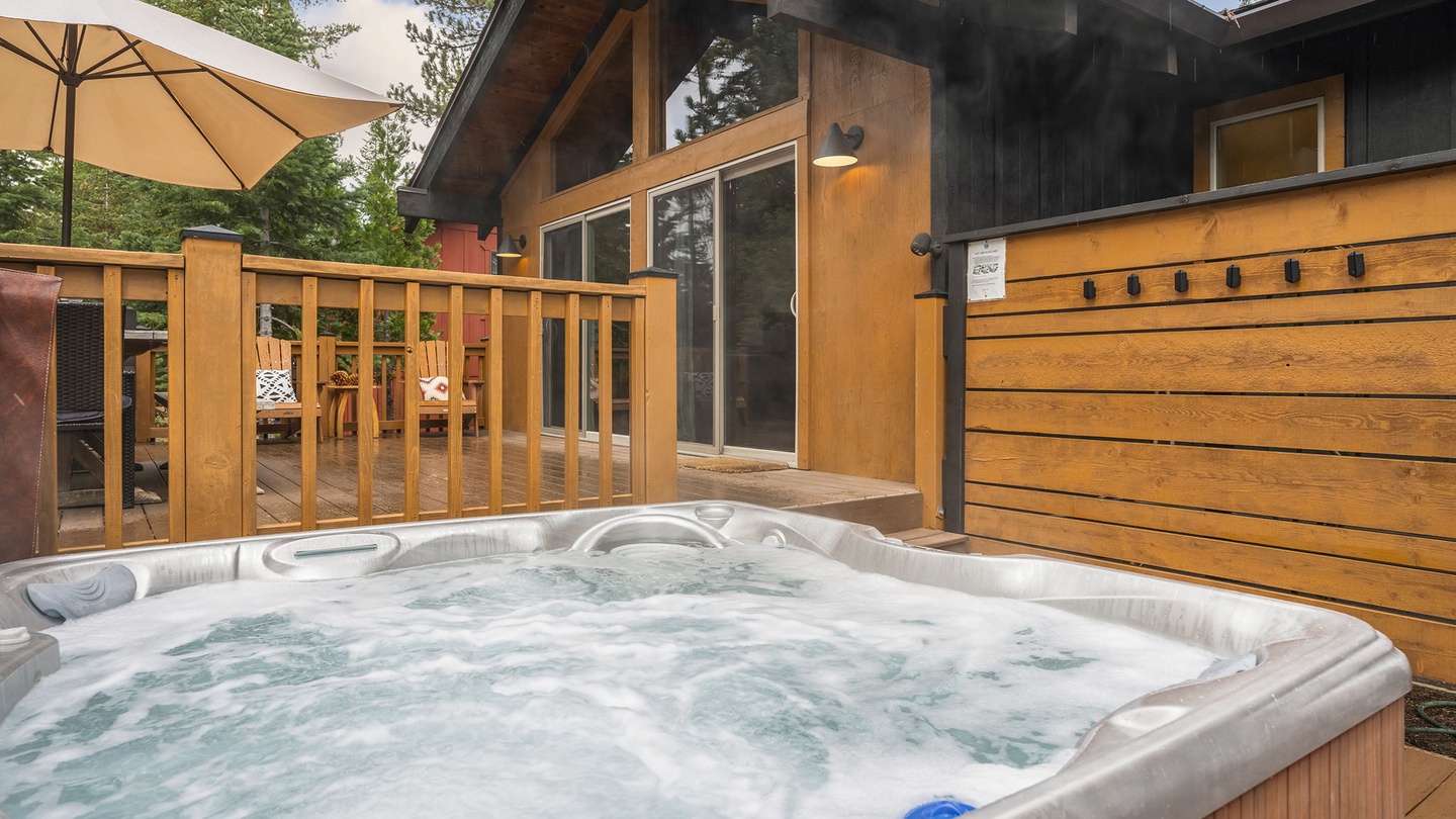 Outside, you’ll find a private hot tub, BBQ grill, and picnic table—perfect for morning coffee, afternoon lounging, or starlit soaks after a day on the slopes or lake.