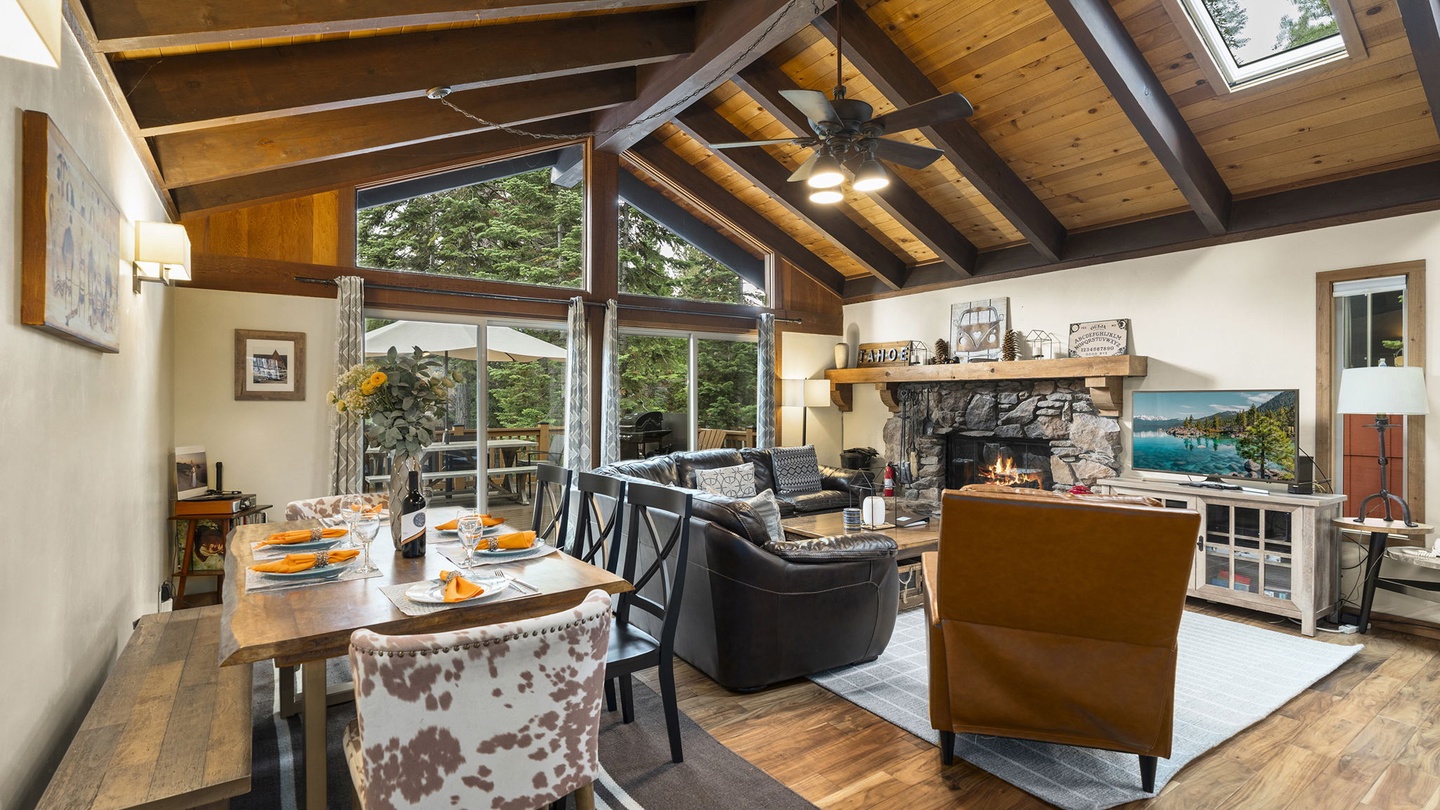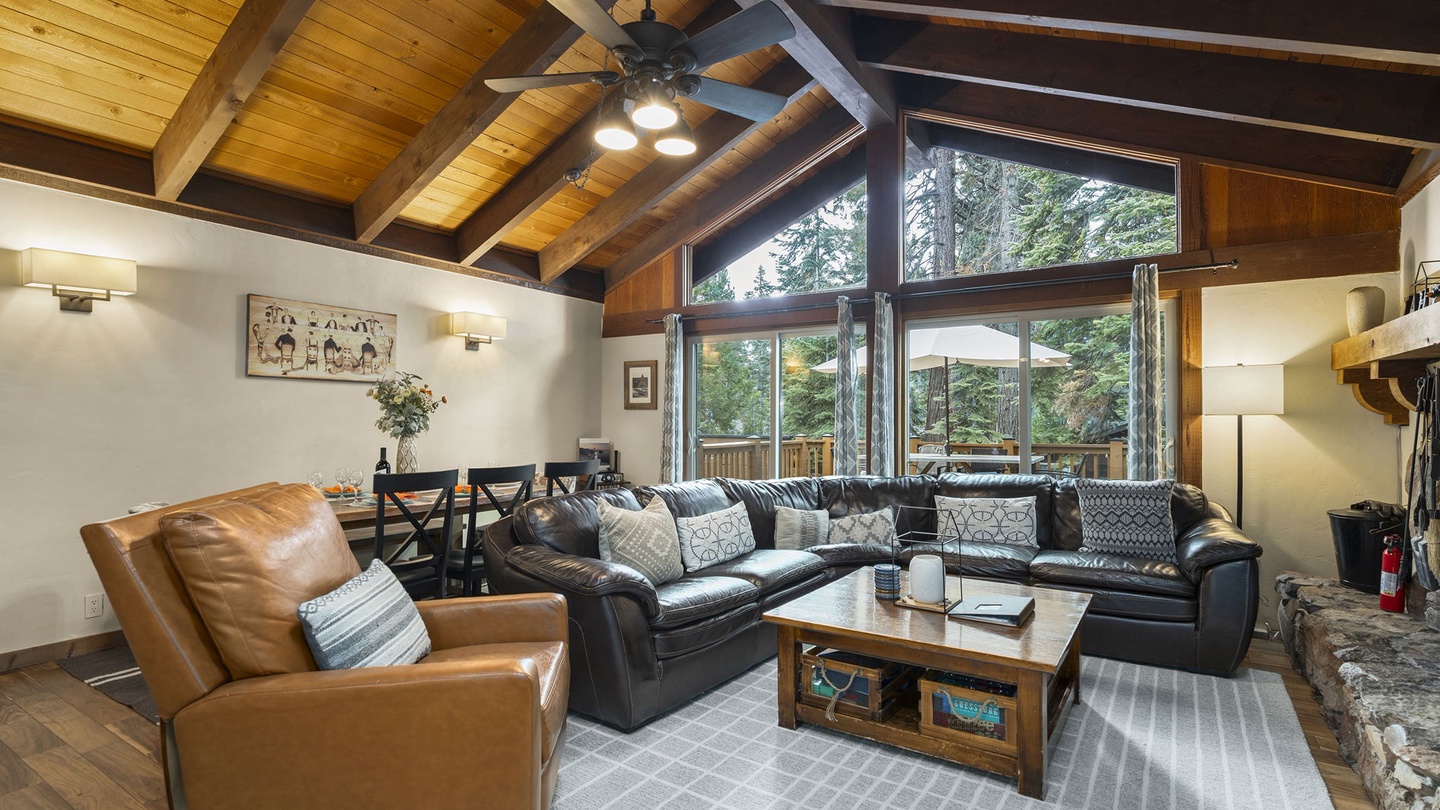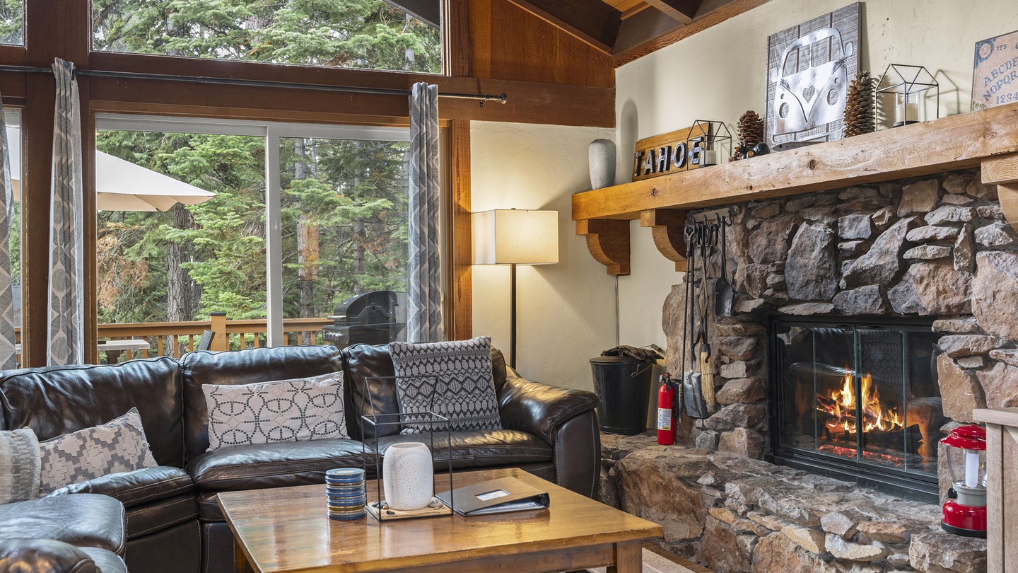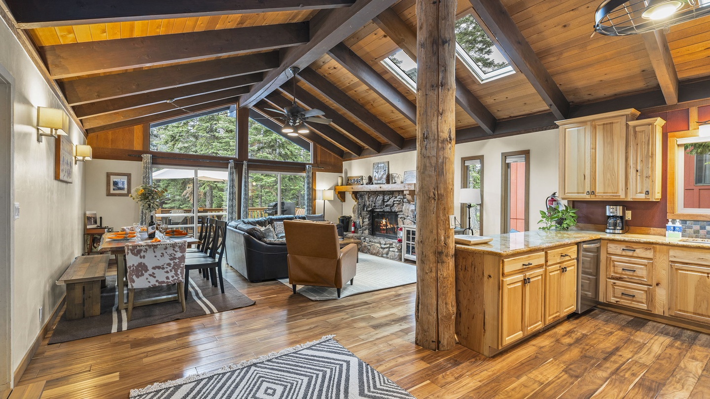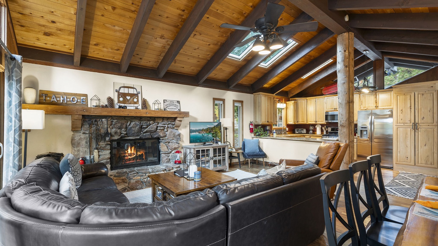 Step inside and feel instantly at home. The open-concept living room features vaulted wood-beam ceilings, large forest-view windows, and a stunning stone fireplace—the heart of the cabin. Curl up by the fire after a day of adventure, or gather for movie night on the smart TV surrounded by cozy leather seating.